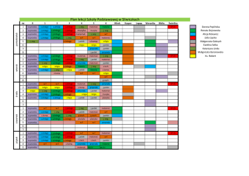 piątek czwartek środa wtorek poniedziałek Plan lekcji Szkoły Podstawowej w Śliwiczkach nr 0 1 2 3 4 5 6 1 2 3 4 5 6 7 8 1 2 3 4 5 6 7 8 1 2 3 4 5 6 7 1 2 3 4 5 6 7 1 2 3 4 5 w.przedsz. z.zintegr. z.zintegr. z.zintegr. j. ang. matemat. historia w.przedsz. z.zintegr. z.zintegr. z.zintegr. z.zintegr. z.zintegr. z.zintegr. z.zintegr. muzyka j. ang. w.przedsz. w.przedsz. muzyka z.zintegr. matemat. j. ang. z.integr. j. ang. w.przedsz. z.zintegr. w.przedsz. z.zintegr. z.zintegr. z.zintegr. z.zintegr. j. ang. w-f w-f w-f matemat. j.polski z.komp. religia religia religia j.polski przyroda j.polski j.polski przyroda z.zintegr. matemat. matemat. j. ang. z.zintegr. j. ang. j.polski matemat. z.zintegr. j.polski w.przedsz. j. ang. przyroda matemat. w.przedsz. religia religia z.integr. historia j. ang. z.tech. w.przedsz. z.zintegr. j. ang. religia j.polski historia z.komp. w-f w-f religia w.przedsz. z.komp. Mirek Kacper Logop. Weronika Biblio. Świetlica 07:15 07:15 w-f g.wych. w.przedsz. w-f w-f z.zintegr. matemat. j. ang. przyroda w.przedsz. religia religia z.zintegr. z.komp. przyroda j.polski z.zintegr. przyroda j.polski matemat. religia j. ang. w.przedsz. z.zintegr. z.zintegr. z.zintegr. z.integr. w.przedsz. z.zintegr. z.zintegr. religia religia j.polski religia muzyka j.polski plastyka w.przedsz. w-f w-f z.zintegr. j. ang. j.polski matemat. w.przedsz. z.zintegr. j. ang. z.zintegr. j.polski matemat. w-f j.polski w.przedsz. z.komp. w.przedsz. z.zintegr. z.zintegr. z.zintegr. j. ang. g.wych. g.wych. z.integr. plastyka plastyka j. ang. w-f w-f przyroda w.przedsz. w.przedsz. z.zintegr. z.zintegr. w-f w-f matemat. w.przedsz. z.zintegr. z.zintegr. j.polski matemat. w-f w.przedsz. w.przedsz. w.przedsz. z.zintegr. z.zintegr. z.zintegr. z.zintegr. w-f w-f z.integr. z.komp. z.tech. z.tech. j.polski przyroda przyroda historia matemat. w.ż.r w.ż.r 07:15 07:15 07:15 Dorota Peplińska Renata Dejnowska Alicja Rolewicz Lidia Lipska Małgorzata Gabrych Ewelina Selka Katarzyna Linda Małgorzata Baranowska Ks. Robert