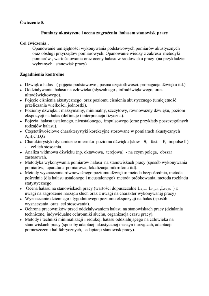 Ćwiczenie 5. Pomiary akustyczne i ocena zagrożenia hałasem stanowisk pracy Cel ćwiczenia . Opanowanie umiejętności wykonywania podstawowych pomiarów akustycznych oraz obsługi przyrządów pomiarowych. Opanowanie wiedzy z zakresu metodyki pomiarów , wartościowania oraz oceny hałasu w środowisku pracy (na przykładzie wybranych stanowisk pracy) Zagadnienia kontrolne               Dźwięk a hałas - ( pojęcia podstawowe , pasma częstotliwości. propagacja dźwięku itd.) Oddziaływanie hałasu na człowieka (słyszalnego , infradźwiękowego, oraz ultradźwiękowego). Pojęcie ciśnienia akustycznego oraz poziomu ciśnienia akustycznego (umiejętność przeliczania wielkości, jednostki). Poziomy dźwięku : maksymalny, minimalny, szczytowy, równoważny dźwięku, poziom ekspozycji na hałas (definicje i interpretacja fizyczna). Pojęcia hałasu ustalonego, nieustalonego, impulsowego (oraz przykłady poszczególnych rodzajów hałasu). Częstotliwościowe charakterystyki korekcyjne stosowane w pomiarach akustycznych A,B,C,D,G Charakterystyki dynamiczne miernika poziomu dźwięku (slow - S, fast - F, impulse I ) - cel ich stosoania. Analiza widmowa dźwięku (np. oktawowa, tercjowa) - na czym polega, obszar zastosowań. Metodyka wykonywania pomiarów hałasu na stanowiskach pracy (sposób wykonywania pomiarów, aparatura pomiarowa, lokalizacja mikrofonu itd). Metody wyznaczania równoważnego poziomu dźwięku: metoda bezpośrednia, metoda pośrednia (dla hałasu ustalonego i nieustalonego) metoda próbkowania, metoda rozkładu statystycznego. Ocena hałasu na stanowiskach pracy (wartości dopuszczalne LA,max LC,peak ,LEX,8h ) z uwagi na zagrożenie narządu słuch oraz z uwagi na charakter wykonywanej pracy) Wyznaczanie dziennego i tygodniowego poziomu ekspozycji na hałas (sposób wyznaczania oraz cel stosowania). Ochrona pracowników przed oddziaływaniem hałasu na stanowiskach pracy (działania techniczne, indywidualne ochronniki słuchu, organizacja czasu pracy). Metody i techniki minimalizacji i redukcji hałasu oddziałującego na człowieka na stanowiskach pracy (sposoby adaptacji akustycznej maszyn i urządzań, adaptacji pomieszczeń i hal fabrycznych, adaptacji stanowisk pracy). Przebieg ćwiczenia: Dla wskazanego stanowiska pracy grupa ćwiczeniowa wykonuje pomiary akustyczne i na ich podstawie dokonuje oceny zagrożenia hałasem. 1. Określenie charakteru wykonywanych czynności na stanowisku pracy. 2. Określenie wartości dopuszczalnych hałasu na danym stanowisku 3. Wykonanie szkicu sytuacyjnego 4. Przeprowadzenie wzorcowania aparatury pomiarowej 5. Wykonanie pomiarów dźwięku A dla zadanego czasu ekspozycji Te 6. Określenie rodzaju hałasu 7. Wybór metody oraz wyznaczenie poziomu równoważnego i maksymalnego 8. Odnotowanie czy szczytowy poziom dźwięku C przekroczył wartość dopuszczalna 135 dB 9. Wyznaczenie poziomu ekspozycji na hałas 10.Ocena stanowiska pracy od kątem zagrożenia hałasem 11.Sprecyzowanie działań zmierzających do minimalizacji oddziaływania hałasu na wskazanym stanowisku pracy. Literatura • Engel Z., Ochrona środowiska przed drganiami hałasem, PWN Warszawa • Puzyna C, Ochrona środowiska pracy przed hałasem WNT • Cempel C, Wibroakustyka stosowana - zasoby internetowe (patrz e-skrypty) • • • Zasoby internetu Normy związane z zagadnieniem: www.pkn.pl Strona internetowa Centralnego Instytutu Pracy www.ciop.pl