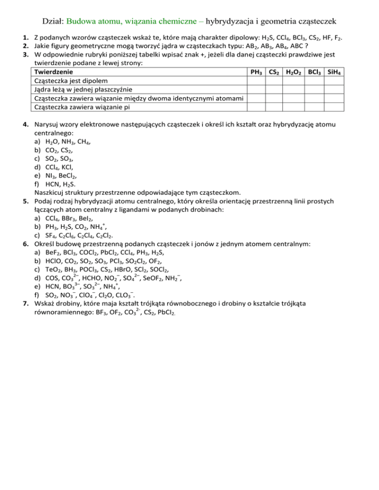 Dział: Budowa atomu, wiązania chemiczne – hybrydyzacja i geometria cząsteczek 1. Z podanych wzorów cząsteczek wskaż te, które mają charakter dipolowy: H2S, CCl4, BCl3, CS2, HF, F2. 2. Jakie figury geometryczne mogą tworzyć jądra w cząsteczkach typu: AB2, AB3, AB4, ABC ? 3. W odpowiednie rubryki poniższej tabelki wpisać znak +, jeżeli dla danej cząsteczki prawdziwe jest twierdzenie podane z lewej strony: Twierdzenie PH3 CS2 H2O2 BCl3 SiH4 Cząsteczka jest dipolem Jądra leżą w jednej płaszczyźnie Cząsteczka zawiera wiązanie między dwoma identycznymi atomami Cząsteczka zawiera wiązanie pi 4. Narysuj wzory elektronowe następujących cząsteczek i określ ich kształt oraz hybrydyzację atomu centralnego: a) H2O, NH3, CH4, b) CO2, CS2, c) SO2, SO3, d) CCl4, KCl, e) NI3, BeCl2, f) HCN, H2S. Naszkicuj struktury przestrzenne odpowiadające tym cząsteczkom. 5. Podaj rodzaj hybrydyzacji atomu centralnego, który określa orientację przestrzenną linii prostych łączących atom centralny z ligandami w podanych drobinach: a) CCl4, BBr3, BeI2, b) PH3, H2S, CO2, NH4+, c) SF4, C2Cl6, C2Cl4, C2Cl2. 6. Określ budowę przestrzenną podanych cząsteczek i jonów z jednym atomem centralnym: a) BeF2, BCl3, COCl2, PbCl2, CCl4, PH3, H2S, b) HClO, CO2, SO2, SO3, PCl3, SO2Cl2, OF2, c) TeO2, BH3, POCl3, CS2, HBrO, SCl2, SOCl2, d) COS, CO32–, HCHO, NO2–, SO42–, SeOF2, NH2–, e) HCN, BO33–, SO32–, NH4+, f) SO2, NO3–, ClO4–, Cl2O, CLO3–. 7. Wskaż drobiny, które maja kształt trójkąta równobocznego i drobiny o kształcie trójkąta równoramiennego: BF3, OF2, CO32-, CS2, PbCI2.