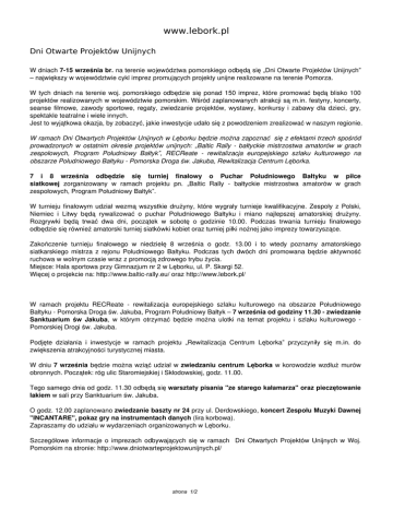 www.lebork.pl Dni Otwarte Projektów Unijnych W dniach 7-15 września br. na terenie województwa pomorskiego odbędą się „Dni Otwarte Projektów Unijnych” – największy w województwie cykl imprez promujących projekty unijne realizowane na terenie Pomorza. W tych dniach na terenie woj. pomorskiego odbędzie się ponad 150 imprez, które promować będą blisko 100 projektów realizowanych w województwie pomorskim. Wśród zaplanowanych atrakcji są m.in. festyny, koncerty, seanse filmowe, zawody sportowe, regaty, zwiedzanie projektów, wystawy, konkursy i zabawy dla dzieci, gry, spektakle teatralne i wiele innych. Jest to wyjątkowa okazja, by zobaczyć, jakie inwestycje udało się z powodzeniem zrealizować w naszym regionie. W ramach Dni Otwartych Projektów Unijnych w Lęborku będzie można zapoznać się z efektami trzech spośród prowadzonych w ostatnim okresie projektów unijnych: „Baltic Rally - bałtyckie mistrzostwa amatorów w grach zespołowych, Program Południowy Bałtyk”, RECReate - rewitalizacja europejskiego szlaku kulturowego na obszarze Południowego Bałtyku - Pomorska Droga św. Jakuba, Rewitalizacja Centrum Lęborka. 7 i 8 września odbędzie się turniej finałowy o Puchar Południowego Bałtyku w piłce siatkowej zorganizowany w ramach projektu pn. „Baltic Rally - bałtyckie mistrzostwa amatorów w grach zespołowych, Program Południowy Bałtyk”. W turnieju finałowym udział wezmą wszystkie drużyny, które wygrały turnieje kwalifikacyjne. Zespoły z Polski, Niemiec i Litwy będą rywalizować o puchar Południowego Bałtyku i miano najlepszej amatorskiej drużyny. Rozgrywki będą trwać dwa dni, początek w sobotę o godzinie 10.00. Podczas trwania turnieju finałowego odbędzie się również amatorski turniej siatkówki kobiet oraz turniej piłki nożnej jako imprezy towarzyszące. Zakończenie turnieju finałowego w niedzielę 8 września o godz. 13.00 i to wtedy poznamy amatorskiego siatkarskiego mistrza z rejonu Południowego Bałtyku. Podczas tych dwóch dni promowana będzie aktywność ruchowa w wolnym czasie wraz z promocją zdrowego trybu życia. Miejsce: Hala sportowa przy Gimnazjum nr 2 w Lęborku, ul. P. Skargi 52. Więcej o projekcie na: http://www.baltic-rally.eu/ oraz http://www.lebork.pl/ W ramach projektu RECReate - rewitalizacja europejskiego szlaku kulturowego na obszarze Południowego Bałtyku - Pomorska Droga św. Jakuba, Program Południowy Bałtyk – 7 września od godziny 11.30 - zwiedzanie Sanktuarium św Jakuba, w którym otrzymać będzie można ulotki na temat projektu i szlaku kulturowego Pomorskiej Drogi św. Jakuba. Podjęte działania i inwestycje w ramach projektu „Rewitalizacja Centrum Lęborka” przyczyniły się m.in. do zwiększenia atrakcyjności turystycznej miasta. W dniu 7 września będzie można wziąć udział w zwiedzaniu centrum Lęborka w korowodzie wzdłuż murów obronnych. Początek: róg ulic Staromiejskiej i Skłodowskiej, godz. 11.00. Tego samego dnia od godz. 11.30 odbędą się warsztaty pisania "ze starego kałamarza" oraz pieczętowanie lakiem w sali przy Sanktuarium św. Jakuba. O godz. 12.00 zaplanowano zwiedzanie baszty nr 24 przy ul. Derdowskiego, koncert Zespołu Muzyki Dawnej "INCANTARE", pokaz gry na instrumentach danych (lira korbowa). Zapraszamy do udziału w wydarzeniach organizowanych w Lęborku. Szczegółowe informacje o imprezach odbywających się w ramach Dni Otwartych Projektów Unijnych w Woj. Pomorskim na stronie: http://www.dniotwarteprojektowunijnych.pl/ strona 1/2 strona 2/2 Powered by TCPDF (www.tcpdf.org)