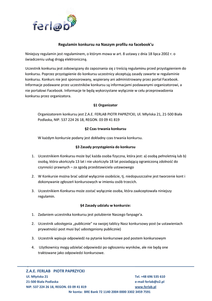 Regulamin konkursu na Naszym profilu na facebook'u Niniejszy regulamin jest regulaminem, o którym mowa w art. 8 ustawy z dnia 18 lipca 2002 r. o świadczeniu usług drogą elektroniczną. Uczestnik konkursu jest zobowiązany do zapoznania się z treścią regulaminu przed przystąpieniem do konkursu. Poprzez przystąpienie do konkursu uczestnicy akceptują zasady zawarte w regulaminie konkursu. Konkurs nie jest sponsorowany, wspierany ani administrowany przez portal Facebook. Informacje podawane przez uczestników konkursu są informacjami podawanymi organizatorowi, a nie portalowi Facebook. Informacje te będą wykorzystane wyłącznie w celu przeprowadzenia konkursu przez organizatora. §1 Organizator Organizatorem konkursu jest Z.A.E. FERLAB PIOTR PAPRZYCKI, Ul. Młyńska 21, 21-500 Biała Podlaska, NIP. 537 224 26 18, REGON. 03 09 41 819 §2 Czas trwania konkursu W każdym konkursie podany jest dokładny czas trwania konkursu. §3 Zasady przystąpienia do konkursu 1. Uczestnikiem Konkursu może być każda osoba fizyczna, która jest: a) osobą pełnoletnią lub b) osobą, która ukończyła 13 lat i nie ukończyła 18 lat posiadającą ograniczoną zdolność do czynności prawnych – za zgodą przedstawiciela ustawowego 2. W Konkursie można brać udział wyłącznie osobiście, tj. niedopuszczalne jest tworzenie kont i dokonywanie zgłoszeń konkursowych w imieniu osób trzecich. 3. Uczestnikiem Konkursu może zostać wyłącznie osoba, która zaakceptowała niniejszy regulamin. §4 Zasady udziału w konkursie: 1. Zadaniem uczestnika konkursu jest polubienie Naszego fanpage’a. 2. Uczestnik udostępnia „publicznie” na swojej tablicy Nasz konkursowy post (w ustawieniach prywatności post musi być udostępniony publicznie) 3. Uczestnik wpisuje odpowiedź na pytanie konkursowe pod postem konkursowym 4. Użytkownicy mogą udzielać odpowiedzi po ogłoszeniu wyników, ale nie będą one traktowane jako odpowiedzi konkursowe. Z.A.E. FERLAB PIOTR PAPRZYCKI Ul. Młyńska 21 Tel. +48 696 535 610 21-500 Biała Podlaska e-mail [email protected] NIP. 537 224 26 18, REGON. 03 09 41 819 www.ferlab.pl Nr konta: BRE Bank 72 1140 2004 0000 3302 3459 7591 5. Zwycięzcy zostaną poinformowani o wygranej poprzez wpis komentarz wystawiony przez organizatora pod postem konkursowym. 6. W przypadku rezygnacji przez zwycięzcę z nagrody lub utraty przez zwycięzcę prawa do Nagrody z jakiejkolwiek przyczyny, organizator zastrzega sobie prawo przyznania nagrody kolejnemu uczestnikowi. 7. Nie jest możliwe wypłacenie równowartości nagrody. Nie jest możliwa rezygnacja z części nagrody. Rezygnacja z części nagrody jest równoznaczna z rezygnacją z całości nagrody. 8. Organizator zastrzega sobie prawo do wykluczenia z konkursu osób, których działania są sprzeczne z prawem i niniejszym regulaminem , a zatem: - biorą udział w konkursie w imieniu osób trzecich - korzystają z dodatkowych kont na platformie Facebook lub też dodatkowych aliasów - edytują swoje komentarze z typowanymi wynikami po ogłoszeniu wyników. swoimi wypowiedziami obrażają, nękają osoby trzecie lub inne podmioty. §5 Nagrody Rodzaj nagrody ogłaszany jest wraz z ogłoszeniem konkursu. §6 Zasady odbioru nagród Odbiór nagród w siedzibie Naszej firmy na ul. Młyńskiej 21 w godzinach 9.30 – 16.30 (warunek odbioru nagród: Wylegitymowanie się dokumentem, którego dane zostaną nam podane w prywatnej wiadomości po informacji o wygranym konkursie), istnieje możliwość wysyłki pocztą. Z.A.E. FERLAB PIOTR PAPRZYCKI Ul. Młyńska 21 Tel. +48 696 535 610 21-500 Biała Podlaska e-mail [email protected] NIP. 537 224 26 18, REGON. 03 09 41 819 www.ferlab.pl Nr konta: BRE Bank 72 1140 2004 0000 3302 3459 7591