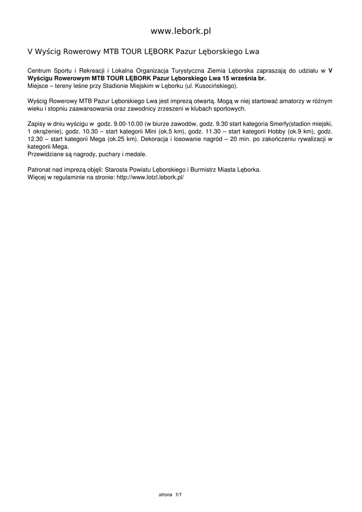 www.lebork.pl V Wyścig Rowerowy MTB TOUR LĘBORK Pazur Lęborskiego Lwa Centrum Sportu i Rekreacji i Lokalna Organizacja Turystyczna Ziemia Lęborska zapraszają do udziału w V Wyścigu Rowerowym MTB TOUR LĘBORK Pazur Lęborskiego Lwa 15 września br. Miejsce – tereny leśne przy Stadionie Miejskim w Lęborku (ul. Kusocińskiego). Wyścig Rowerowy MTB Pazur Lęborskiego Lwa jest imprezą otwartą. Mogą w niej startować amatorzy w różnym wieku i stopniu zaawansowania oraz zawodnicy zrzeszeni w klubach sportowych. Zapisy w dniu wyścigu w godz. 9.00-10.00 (w biurze zawodów, godz. 9.30 start kategoria Smerfy(stadion miejski, 1 okrążenie), godz. 10.30 – start kategorii Mini (ok.5 km), godz. 11.30 – start kategorii Hobby (ok.9 km), godz. 12.30 – start kategorii Mega (ok.25 km). Dekoracja i losowanie nagród – 20 min. po zakończeniu rywalizacji w kategorii Mega. Przewidziane są nagrody, puchary i medale. Patronat nad imprezą objęli: Starosta Powiatu Lęborskiego i Burmistrz Miasta Lęborka. Więcej w regulaminie na stronie: http://www.lotzl.lebork.pl/ strona 1/1 Powered by TCPDF (www.tcpdf.org)