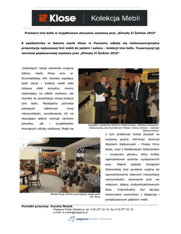 informacja prasowa Premiera Uno bello w wyjątkowym otoczeniu wystawy prac „Klimaty II Żerków 2010” 8 października w Salonie marki Klose w Poznaniu odbyła się niekonwencjonalna prezentacja najnowszej linii mebli do jadalni i salonu – kolekcji Uno bello. Towarzyszył jej wernisaż poplenerowej wystawy prac „Klimaty II Żerków 2010”. „Dotknięcie” sztuki odmieniło wnętrza Salonu marki Klose przy ul. Grunwaldzkiej 104. Swoista współgra dzieł sztuki i kolekcji mebli dała ciekawy efekt wizualny, mocno wpływający na odbiór wystawy, ale również na prezentację nowej kolekcji Uno bello. Nieodparta potrzeba odbiorcom innej pokazania rzeczywistości, uwrażliwienia ich na otaczające piękno cechuje zarówno artystów, jak i projektantów tworzących sztukę użytkową. Mogli się Gospodarz spotkania Wojciech Gieburowskie z Barbarą KamyszekGieburowską oraz Burmistrzem Miasta i Gminy Żerków – Jackiem Jędraszczykiem o tym przekonać licznie przybyli na wystawę goście. Wernisaż otworzył Wojciech Gieburowski – Prezes firmy Klose, wraz z Waldemarem Idzikowskim – kuratorem pleneru, który krótko zaprezentował autorów wystawianych prac. Piękne pejzaże Szwajcarii Żerkowskiej były punktem wyjścia do zaprezentowania własnych interpretacji rzeczywistości, stworzenia prac we własnym, dalece zindywidualizowanym stylu. Recital Grupy Żerków przyciągnął uwagę gości Fot. Klose Indywidualny styl łączący nowoczesne wzornictwo z elegancją i ponadczasowym pięknem mebli Kontakt prasowy: Aurelia Nowik Pegasus Public Relations, tel. 0-22 877 22 18, fax 0-22 877 22 19 e-mail: [email protected] informacja prasowa Klasycznych nowoczesne wzornictwo z elegancją i ponadczasowym pięknem mebli klasycznych można było również dostrzec w kolekcji Uno bello, która miała swoją premierę tego wieczoru. O funkcjonalności mebli z przekonać tej kolekcji osobiście można się podczas było tego niekonwencjonalnego spotkania ze sztuką. Wieczór umilił koncert „Grupy Żerków”. Fot. Kolekcja Mebli Klose Wystawa „Klimaty II Żerków 2010” potrwa do grudnia 2010. Serdecznie zapraszamy Salon Wystawienniczy Kolekcji Mebli Klose ul. Grunwaldzka 104, Poznań www.klose.pl Nową kolekcję Uno bello można było podziwiać w wyjątkowym otoczeniu prac malarskich Fot. Kolekcja Mebli Klose Dodatkową atrakcją wieczoru było losowanie niespodzianek Fot Kolekcja Mebli Klose Kontakt prasowy: Aurelia Nowik Pegasus Public Relations, tel. 0-22 877 22 18, fax 0-22 877 22 19 e-mail: [email protected] Kolekcja Mebli Klose