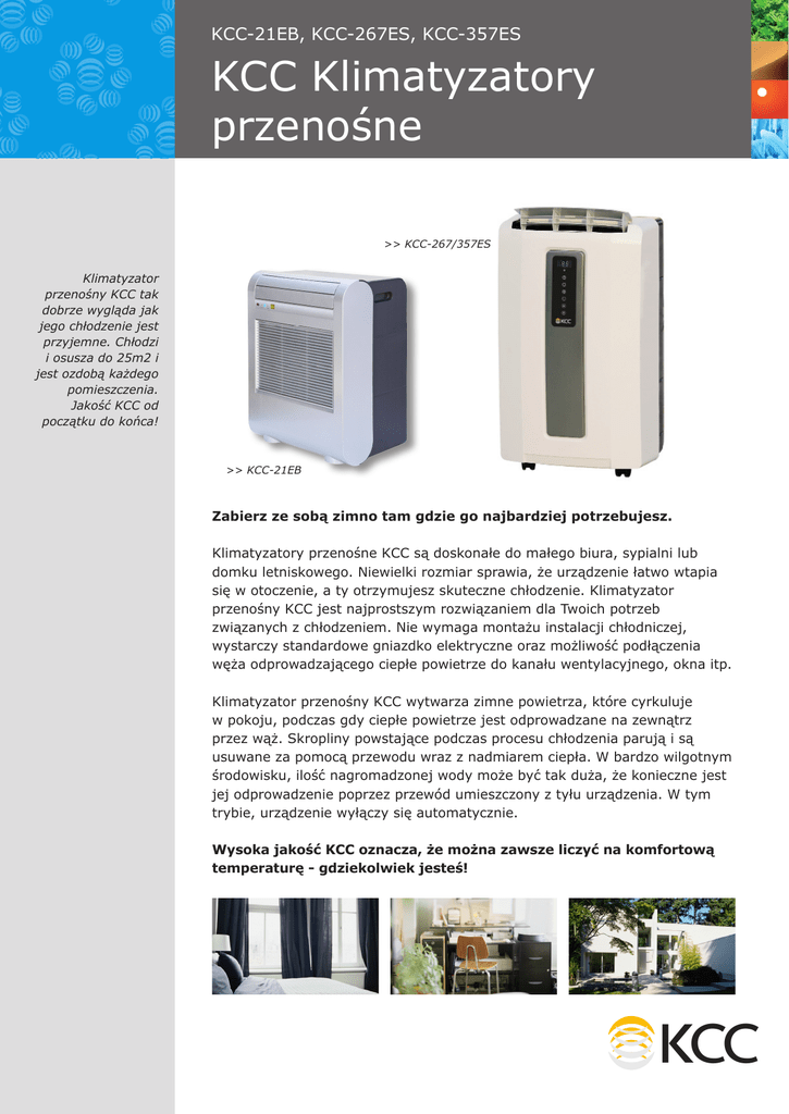 KCC-21EB, KCC-267ES, KCC-357ES KCC Klimatyzatory przenośne >> KCC-267/357ES Klimatyzator przenośny KCC tak dobrze wygląda jak jego chłodzenie jest przyjemne. Chłodzi i osusza do 25m2 i jest ozdobą każdego pomieszczenia. Jakość KCC od początku do końca! >> KCC-21EB Zabierz ze sobą zimno tam gdzie go najbardziej potrzebujesz. Klimatyzatory przenośne KCC są doskonałe do małego biura, sypialni lub domku letniskowego. Niewielki rozmiar sprawia, że urządzenie łatwo wtapia się w otoczenie, a ty otrzymujesz skuteczne chłodzenie. Klimatyzator przenośny KCC jest najprostszym rozwiązaniem dla Twoich potrzeb związanych z chłodzeniem. Nie wymaga montażu instalacji chłodniczej, wystarczy standardowe gniazdko elektryczne oraz możliwość podłączenia węża odprowadzającego ciepłe powietrze do kanału wentylacyjnego, okna itp. Klimatyzator przenośny KCC wytwarza zimne powietrza, które cyrkuluje w pokoju, podczas gdy ciepłe powietrze jest odprowadzane na zewnątrz przez wąż. Skropliny powstające podczas procesu chłodzenia parują i są usuwane za pomocą przewodu wraz z nadmiarem ciepła. W bardzo wilgotnym środowisku, ilość nagromadzonej wody może być tak duża, że konieczne jest jej odprowadzenie poprzez przewód umieszczony z tyłu urządzenia. W tym trybie, urządzenie wyłączy się automatycznie. Wysoka jakość KCC oznacza, że można zawsze liczyć na komfortową temperaturę - gdziekolwiek jesteś! kcc KCC-21EB, KCC-267ES, KCC-357ES Specyfikacja techniczna • KCC oferuje najnowszą technologię • Niskie zużycie energii • Niski poziom hałasu • Wysoką niezawodność • Nie wymaga montażu instalacji chłodniczej Model KCC-21EB KCC-267ES KCC-357ES Numer artykułu 7130243 7130268 7130269 2,1 2,7 3,6 Wydajność chłodnicza Kw ³ Przepływ powietrza m h 216 324 324 Pobór mocy W 800 900 1100 Prąd pobierany w trybie chłodzenia A (max) 4,7 6,1 6,7 240/1/50 240/1/50 240/1/50 Zasilanie V/Ph/Hz Poziom hałasu dB(A) 53 52 53 Czynnik chłodniczy R410A R410A R410A Zalecana wielkość pomieszczenia m2 15-20 20-25 25-30 746 x 450 x 393 746 x 450 x 393 30 31,5 Wymiary i Masa ZASTRZEGAMY SOBIE PRAWO DO ZMIANY KONSTRUKCJI LUB SPECYFIKACJI BEZ UPRZEDNIEGO POWIADOMIENIA. ZASTRZEGAMY SOBIE PRAWO DO BŁĘDÓW DRUKARSKICH. Wymiary h x b x d 612 x 485 x 337 Masa Kg 26,5 kcc