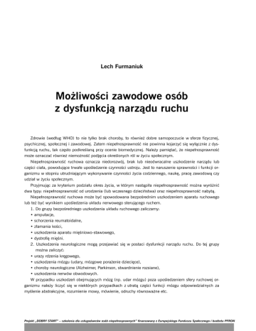 Lech Furmaniuk Możliwości zawodowe osób z dysfunkcją narządu ruchu Zdrowie (według WHO) to nie tylko brak choroby, to również dobre samopoczucie w sferze fizycznej, psychicznej, społecznej i zawodowej. Zatem niepełnosprawność nie powinna kojarzyć się wyłącznie z dysfunkcją ruchu, tak często podkreślaną przy ocenie biomedycznej. Należy pamiętać, że niepełnosprawność może oznaczać również niemożność podjęcia określonych ról w życiu społecznym. Niepełnosprawność ruchowa oznacza niedorozwój, brak lub nieodwracalne uszkodzenie narządu lub części ciała, powodujące trwałe upośledzenie czynności ustroju. Jest to naruszenie sprawności i funkcji organizmu w stopniu utrudniającym wykonywanie czynności życia codziennego, naukę, pracę zawodową czy udział w życiu społecznym. Przyjmując za kryterium podziału okres życia, w którym nastąpiła niepełnosprawność można wyróżnić dwa typy: niepełnosprawność od urodzenia (lub wczesnego dzieciństwa) oraz niepełnosprawność nabytą. Niepełnosprawność ruchowa może być spowodowana bezpośrednim uszkodzeniem aparatu ruchowego lub też być wynikiem upośledzenia układu nerwowego sterującego ruchem. 1. Do grupy bezpośredniego uszkodzenia układu ruchowego zaliczamy: • amputacje, • schorzenia reumatoidalne, • złamania kości, • uszkodzenia aparatu mięśniowo-stawowego, • dystrofię mięśni. 2. Uszkodzenia neurologiczne mogą przejawiać się w postaci dysfunkcji narządu ruchu. Do tej grupy można zaliczyć: • urazy rdzenia kręgowego, • uszkodzenia mózgu (udary, mózgowe porażenie dziecięce), • choroby neurologiczne (Alzheimer, Parkinson, stwardnienie rozsiane), • uszkodzenia nerwów obwodowych. W przypadku uszkodzeń obejmujących mózg (np. udar mózgu) poza upośledzeniem sfery ruchowej organizmu należy liczyć się w niektórych przypadkach z utratą części funkcji mózgu odpowiedzialnych za myślenie abstrakcyjne, rozumienie mowy, mówienie, odruchy równoważne etc. Projekt „DOBRY START” – szkolenia dla usługodawców osób niepełnosprawnych” finansowany z Europejskiego Funduszu Społecznego i budżetu PFRON 70 Lech Furmaniuk Ponadto, poza problemami związanymi z utraconą sprawnością ruchową, u pacjenta pojawić się mogą również obawy związane z akceptacją samego siebie, z dalszym funkcjonowaniem w rodzinie, społeczeństwie, ewentualnymi możliwościami zarobkowania. Osoba niepełnosprawna próbująca odnaleźć się w nowej dla siebie sytuacji życiowej może napotykać bariery tkwiące: • w samej jednostce z ograniczoną sprawnością, • w kulturze społeczności lokalnej i społeczeństwa globalnego, • w rozwiązaniach organizacyjno-prawnych, • w organizacji i funkcjonowaniu systemu opieki medycznej oraz wsparcia społecznego, • w sposobie zagospodarowania przestrzeni i w środowisku fizycznym (Z. Woźniak). Podsumowując, ograniczenia osób niepełnosprawnych nie są związane wyłącznie z problematyką ich dysfunkcji w sferze ruchowej. Pomimo osiągnięcia względnej sprawności wielu pacjentów nie jest w stanie zaakceptować samych siebie czy też przełamać społecznego ostracyzmu. Prowadzić to może do przejawiania skrajnych zachowań: od postawy roszczeniowej po izolację społeczną. Drogą do zmniejszenia trudności związanych z brakiem pełnej sprawności jest postępowanie rehabilitacyjne. Działanie to ma na celu maksymalne usprawnienie pacjenta. W niektórych przypadkach nie jest możliwy pełen powrót do sprawności fizycznej. Wówczas zadaniem zespołu rehabilitacyjnego jest doprowadzenie do sytuacji, w której pacjent jest w stanie samodzielnie egzystować. Jest to zadanie niezwykle trudne i nie zawsze uwieńczone sukcesem. Próby podjęcia pracy zawodowej przez osoby niepełnosprawne jest ważnym elementem ich rehabilitacji społecznej. Podjęcie wysiłków związanych z poszukiwaniem pracy wymaga od niepełnosprawnego realnej oceny własnych możliwości fizycznych, pewności siebie, chęci bycia niezależnym i potrzebnym, zdobywania i powiększania swoich kwalifikacji zawodowych. W niektórych przypadkach powstała niepełnosprawność ruchowa utrudnia lub nawet uniemożliwia powrót do poprzedniego miejsca zatrudnienia. Taka sytuacja zmusza osoby niepełnosprawne do przekwalifikowania się (reorientacja zawodowa). Oczywiście nie wszystkie jednostki skłonne są do podejmowania takich wyzwań. Jednakże ta grupa osób niepełnosprawnych, która podejmuje się współzawodnictwa na rynku pracy jest bardziej zdeterminowana i konsekwentna w dążeniu do wyznaczonych sobie celów. Niepełnosprawność ruchowa ogranicza podjęcie pracy na niektórych stanowiskach. Dużym problemem będzie podjęcie ciężkiej pracy fizycznej. Uszkodzony aparat ruchowy nie jest na tyle wydolny, by sprostać zadaniom stawianym na tym stanowisku pracy. Tu w naturalny sposób pracownik niepełnosprawny nie będzie konkurencyjny wobec pełnosprawnego kolegi. W przypadku dostosowania miejsca pracy i wykorzystania specjalistycznych udogodnień technicznych możliwe jest podjęcie lekkiej pracy fizycznej. W zależności od możliwości manualnych niepełnosprawnego może on podjąć się bardziej lub mniej precyzyjnych robót. Nawet lekka praca fizyczna będzie wymagała dostosowania miejsca pracy i przygotowania stanowiska siedzącego dla pracownika. Znane są także przykłady, gdzie osoba z lekką dysfunkcją ruchową została zatrudniona na stanowisku sprzątaczki, stróża czy gońca w biurze. Podjęcie pracy biurowej, nie wymagającej nadmiernego obciążania organizmu jest niewątpliwie łatwiejszym zadaniem dla osoby niepełnosprawnej. Oczywiście w tym przypadku należy pamiętać, że osoby, których niepełnosprawność ruchowa wynika z uszkodzenia mózgu mogą nie podjąć niektórych stawianych przed nimi obowiązków w pracy. Nie jest to jednak regułą. W wielu wypadkach osoby po udarze mózgu lub osoby p