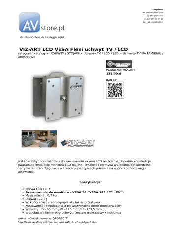 DSSsystems Al. Niepodległości 19/4 02-653 Warszawa tel. +48 881 22 33 22 tel. +48 22 852 00 50 VIZ-ART LCD VESA Flexi uchwyt TV / LCD kategoria: Katalog > UCHWYTY / STOJAKI > Uchwyty TV / LCD / LED > Uchwyty TV NA RAMIENIU / OBROTOWE Producent: VIZ-ART 135,00 zł Kod QR: Jest to uchwyt przeznaczony do zawieszenia ekranu LCD na ścianie. Unikalna konstrukcja gwarantuje instalację monitora LCD na lata. Trwałość i estetyka wykonania potwierdzona certyfikatem ISO. Regulacja w trzech płaszczyznach pozwala na wybór komfortowego ustawienia. Specyfikacja: Nazwa LCD FLEXI Dopasowanie do monitora : VESA 75 / VESA 100 ( 7" - 26" ) Masa własna : 0,7 kg Udźwig : 12 kg Wykończenie : srebrno-popielaty lakier proszkowy Nastawność : regulacja w 3 płaszczyznach / obrót monitora 360º Wymiary : D - 60 mm / W - 120 mm / H - 123,5 mm W zestawie : kompletny uchwyt / zestaw montażowy / instrukcja strona: 1/3 wydrukowano: 08-03-2017 http://www.avstore.pl/viz-art-lcd-vesa-flexi-uchwyt-tv-lcd.html Bezpieczeństwo : stabilny system instalacji / blokada monitora Gwarancja : 2 lata Produkcja : VIZ-ART Polska POBIERANIE: Karta Katalogowa - Pobierz Instrukcja instalacji - Pobierz Uchwyt LCD FLEXI firmy VIZ-ART jest to uchwyt zaprojektowany w odpowiedzi na potrzeby wymagających realizacji i nowych technologii. LCD FLEXI wyróżnia się wyjątkową funkcjonalnością i regulacją w 3 płaszczyznach. Jakość potwierdzona zadowoleniem Użytkowników. Jest to uchwyt przeznaczony do zawieszenia ekranu LCD na ścianie. Unikalna konstrukcja gwarantuje instlację monitora LCD na lata. Trwałość i estetyka wykonania potwierdzona certyfikatem ISO. Regulacja w trzech płaszczyznach pozwala na wybór komfortowego ustawienia. Uchwyt LCD FLEXI zapewnia bezkompromisowe rozwiązanie dla systemów VESA 75 oraz VESA 100. Wybierz monitor LCD, a my zapewnimy Ci wysokiej jakości uchwyt do komfortowej i szybkiej instalacji. Uchwyt LCD FLEXI to sukces instalacji, regulacja w trzech płaszczyznach pozwala na wybó komfortowego ustawienia. Przeznaczenie : pracownie komputerowe / restauracje / bazy szkoleniowe / kluby fitness strona: 2/3 wydrukowano: 08-03-2017 http://www.avstore.pl/viz-art-lcd-vesa-flexi-uchwyt-tv-lcd.html Wszystkie podane ceny (zawierają podatek VAT 23%). Klientów zainteresowanych większymi zakupami lub współpracą prosimy o kontakt: (22) 852 00 50, lub [email protected] Wszystkie loga oraz znaki firmowe wykorzystane w opisach na stronie AVstore.pl . należą do ich prawnych właścicieli i mają wyłącznie charakter informacyjny strona: 3/3 wydrukowano: 08-03-2017 http://www.avstore.pl/viz-art-lcd-vesa-flexi-uchwyt-tv-lcd.html