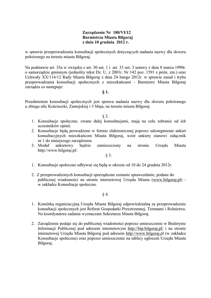 Zarządzenie Nr 180/VI/12 Burmistrza Miasta Biłgoraj z dnia 10 grudnia 2012 r. w sprawie przeprowadzenia konsultacji społecznych dotyczących nadania nazwy dla skweru połoŜonego na terenie miasta Biłgoraj. Na podstawie art. 35a w związku z art. 30 ust. 1 i art. 33 ust. 3 ustawy z dnia 8 marca 1990r. o samorządzie gminnym (jednolity tekst Dz. U. z 2001r. Nr 142 poz. 1591 z późn. zm.) oraz Uchwały XX/114/12 Rady Miasta Biłgoraj z dnia 24 lutego 2012r. w sprawie zasad i trybu przeprowadzania konsultacji społecznych z mieszkańcami - Burmistrz Miasta Biłgoraj zarządza co następuje: § 1. Przedmiotem konsultacji społecznych jest sprawa nadania nazwy dla skweru połoŜonego u zbiegu ulic Kościuszki, Zamojskiej i 3 Maja, na terenie miasta Biłgoraj. § 2. 1. Konsultacje społeczne, zwane dalej konsultacjami, mają na celu zebranie od ich uczestników opinii. 2. Konsultacje będą prowadzone w formie elektronicznej poprzez udostępnienie ankiet konsultacyjnych mieszkańcom Miasta Biłgoraj, wzór ankiety stanowi załącznik nr 1 do niniejszego zarządzenia. 3. Moduł ankietowy będzie zamieszczony na stronie Urzędu Miasta http://www.bilgoraj.pl/. § 3. 1. Konsultacje społeczne odbywać się będą w okresie od 10 do 24 grudnia 2012r. 2. Z przeprowadzonych konsultacji sporządzone zostanie sprawozdanie, podane do publicznej wiadomości na stronie internetowej Urzędu Miasta (www.bilgoraj.pl) w zakładce Konsultacje społeczne. § 4. 1. Komórką organizacyjną Urzędu Miasta Biłgoraj odpowiedzialną za przeprowadzenie konsultacji społecznych jest Referat Gospodarki Przestrzennej, Terenami i Rolnictwa. Na koordynatora zadania wyznaczam Sekretarza Miasta Biłgoraj. 2. Zarządzenie podaje się do publicznej wiadomości poprzez umieszczenie w Biuletynie Informacji Publicznej pod adresem internetowym http://bip.bilgoraj.pl/ i na stronie internetowej Urzędu Miasta Biłgoraj pod adresem http://www.bilgoraj.pl (w zakładce Konsultacje społeczne) oraz poprzez umieszczenie na tablicy ogłoszeń Urzędu Miasta Biłgoraj. - 2 §5 Wykonanie zarządzenia powierzam Sekretarzowi Miasta Biłgoraj. § 6. Zarządzenie wchodzi w Ŝycie z dniem podjęcia. Burmistrz Miasta (-) Janusz Rosłan Załącznik Nr 1 do Zarządzenia Nr 180/VI/12 Burmistrza Miasta Biłgoraj z dnia 10 grudnia 2012r. ANKIETA KONSULTACYJNA w sprawie nadania nazwy dla skweru połoŜonego u zbiegu ulic: Kościuszki, Zamojskiej i 3 Maja, na terenie miasta Biłgoraj. Czy jesteś za nadaniem nazwy dla skweru połoŜonego u zbiegu ulic: Kościuszki, Zamojskiej i 3 Maja na terenie miasta Biłgoraj: 1. Skwer Sitarski 2. Skwer Zamojski 3. Skwer Tadeusza Iwanowskiego 4. Skwer Harcerzy Polskich 5. Nie naleŜy nadawać nazwy INFORMACJA WyraŜenie stanowiska następuje poprzez postawienie znaku „x” w kratce przy wybranej odpowiedzi.