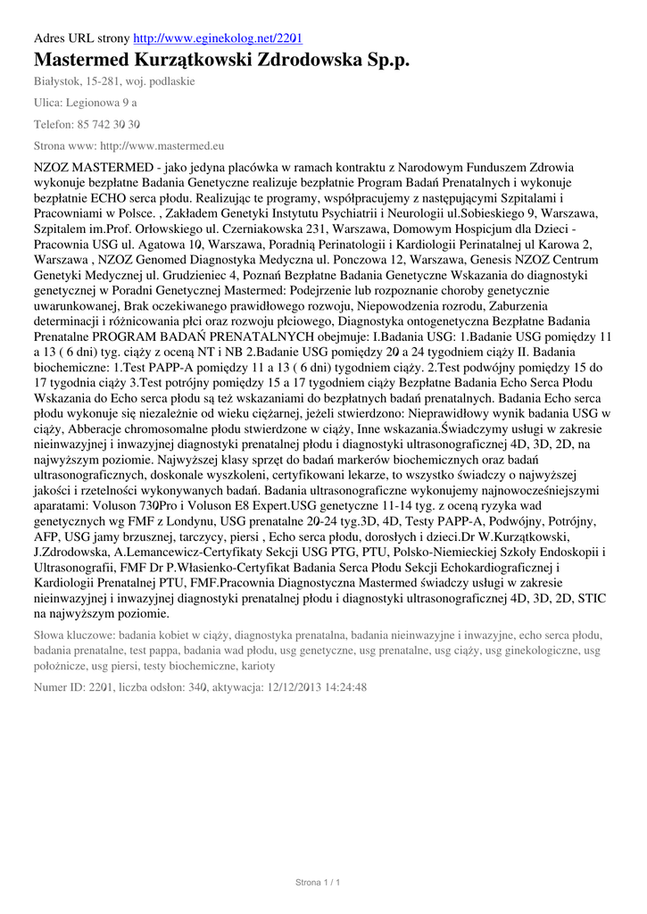 Adres URL strony http://www.eginekolog.net/2201 Mastermed Kurzątkowski Zdrodowska Sp.p. Białystok, 15-281, woj. podlaskie Ulica: Legionowa 9 a Telefon: 85 742 30 30 Strona www: http://www.mastermed.eu NZOZ MASTERMED - jako jedyna placówka w ramach kontraktu z Narodowym Funduszem Zdrowia wykonuje bezpłatne Badania Genetyczne realizuje bezpłatnie Program Badań Prenatalnych i wykonuje bezpłatnie ECHO serca płodu. Realizując te programy, współpracujemy z następującymi Szpitalami i Pracowniami w Polsce. , Zakładem Genetyki Instytutu Psychiatrii i Neurologii ul.Sobieskiego 9, Warszawa, Szpitalem im.Prof. Orłowskiego ul. Czerniakowska 231, Warszawa, Domowym Hospicjum dla Dzieci Pracownia USG ul. Agatowa 10, Warszawa, Poradnią Perinatologii i Kardiologii Perinatalnej ul Karowa 2, Warszawa , NZOZ Genomed Diagnostyka Medyczna ul. Ponczowa 12, Warszawa, Genesis NZOZ Centrum Genetyki Medycznej ul. Grudzieniec 4, Poznań Bezpłatne Badania Genetyczne Wskazania do diagnostyki genetycznej w Poradni Genetycznej Mastermed: Podejrzenie lub rozpoznanie choroby genetycznie uwarunkowanej, Brak oczekiwanego prawidłowego rozwoju, Niepowodzenia rozrodu, Zaburzenia determinacji i różnicowania płci oraz rozwoju płciowego, Diagnostyka ontogenetyczna Bezpłatne Badania Prenatalne PROGRAM BADAŃ PRENATALNYCH obejmuje: I.Badania USG: 1.Badanie USG pomiędzy 11 a 13 ( 6 dni) tyg. ciąży z oceną NT i NB 2.Badanie USG pomiędzy 20 a 24 tygodniem ciąży II. Badania biochemiczne: 1.Test PAPP-A pomiędzy 11 a 13 ( 6 dni) tygodniem ciąży. 2.Test podwójny pomiędzy 15 do 17 tygodnia ciąży 3.Test potrójny pomiędzy 15 a 17 tygodniem ciąży Bezpłatne Badania Echo Serca Płodu Wskazania do Echo serca płodu są też wskazaniami do bezpłatnych badań prenatalnych. Badania Echo serca płodu wykonuje się niezależnie od wieku ciężarnej, jeżeli stwierdzono: Nieprawidłowy wynik badania USG w ciąży, Abberacje chromosomalne płodu stwierdzone w ciąży, Inne wskazania.Świadczymy usługi w zakresie nieinwazyjnej i inwazyjnej diagnostyki prenatalnej płodu i diagnostyki ultrasonograficznej 4D, 3D, 2D, na najwyższym poziomie. Najwyższej klasy sprzęt do badań markerów biochemicznych oraz badań ultrasonograficznych, doskonale wyszkoleni, certyfikowani lekarze, to wszystko świadczy o najwyższej jakości i rzetelności wykonywanych badań. Badania ultrasonograficzne wykonujemy najnowocześniejszymi aparatami: Voluson 730Pro i Voluson E8 Expert.USG genetyczne 11-14 tyg. z oceną ryzyka wad genetycznych wg FMF z Londynu, USG prenatalne 20-24 tyg.3D, 4D, Testy PAPP-A, Podwójny, Potrójny, AFP, USG jamy brzusznej, tarczycy, piersi , Echo serca płodu, dorosłych i dzieci.Dr W.Kurzątkowski, J.Zdrodowska, A.Lemancewicz-Certyfikaty Sekcji USG PTG, PTU, Polsko-Niemieckiej Szkoły Endoskopii i Ultrasonografii, FMF Dr P.Własienko-Certyfikat Badania Serca Płodu Sekcji Echokardiograficznej i Kardiologii Prenatalnej PTU, FMF.Pracownia Diagnostyczna Mastermed świadczy usługi w zakresie nieinwazyjnej i inwazyjnej diagnostyki prenatalnej płodu i diagnostyki ultrasonograficznej 4D, 3D, 2D, STIC na najwyższym poziomie. Słowa kluczowe: badania kobiet w ciąży, diagnostyka prenatalna, badania nieinwazyjne i inwazyjne, echo serca płodu, badania prenatalne, test pappa, badania wad płodu, usg genetyczne, usg prenatalne, usg ciąży, usg ginekologiczne, usg położnicze, usg piersi, testy biochemiczne, karioty Numer ID: 2201, liczba odsłon: 340, aktywacja: 12/12/2013 14:24:48 Strona 1 / 1