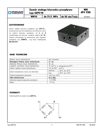 WK 491 930 Zawór stałego kierunku przepływu typ UZFC10 WN10 do 50 dm3/min do 31,5 MPa 04.2010 ZASTOSOWANIE Zawór stałego kierunku przepływu typ UZFC10 UZFC10… 10… przeznaczony jest do nadawania strumieniowi cieczy na wyjściu kierunku przepływu od A do B niezależnego od kierunku zasilania wejścia A1; A1 B1. B1 Zawory montowane są warstwowo pod regulator przepływu typ 2FRM10… 2FRM10… wg karty katalogowej WK 450 450 570. 570 DANE TECHNICZNE olej mineralny 16 µm 10 µm o 37 mm 2 /s w temperaturze 55 C 2,8 do 328 mm2 /s zalecany 40 oC do 55 oC Rodzaj cieczy hydraulicznej Wymag aga Wym agana fi f iltracj ltr acja acja ciec c ieczy ieczy hydra hydraulicz icznej Zalecana filtracja cieczy hydraulicznej Lepkość nominalna cieczy hydraulicznej Zakres lepkości cieczy hydraulicznej Zakres temperatury cieczy (w zbiorniku) -20 oC do +70 oC max - 20 oC do +70 oC 31,5 1, 5 MPa 0,15 MPa 3,9 kg Zakres temperatury otoczenia Max ciś ci śnien ienie pracy pr acy Ciśnienie otwarcia zaworów zwrotnych Masa SCHEMATY Symbol graficzny zaworu typ UZFC10... B A B1 Typ UZFC10 A1 -1- WK 491 930 04.2010 WYMIARY GABARYTOWE I PRZYŁĄCZENIOWE 2 M8 gł. 13 - 4 otw B O 12 - 2 otw. (A, B) A 88 A1 1 71,6 82,5 101,5 (min) 50 4 B1 9 - 4 otw. O 12 - 2 otw. 9,6 A 55,1 B 101,5 82,5 9,5 9,5 O A1 30,1 B1 76 95 (min) r 0,01/100 mm 0,63 9,5 76 95 9,5 5 1 - Zawór typ UZFC10... 2 - Regulator przepływu typ 2FR 2FRM10 wg karty katalogowej WK 450 570 3 - Pierścień uszcz. o-r o-ri -ring 18,7 8, 7 x 3,5 3,5 - szt. 2/komplet (A1, B1) 4 - Konfiguracja otworów powierzchni płyty przyłączeniowej zgodna normami: • I S O 62 63 • C E T O P R P 12 1H śruby mocujące w przypadku montażu warstwowego zaworu typ UZFC10 i regulatora przepływu typ 2FR 2FRM10: M8 x 100 -10.9 0.9 wg PN - EN ISO 4762 (PN/M-82302) szt. 4 /komplet; moment dokręcenia Md = 35 Nm. 5 - Wymagany stan powierzchni płyty przyłączeniowej WK 491 930 04.2010 -2- Typ UZFC10 SPOSÓB ZAMAWIANIA 10 UZFC Wielkość nominalna (WN) WN10 * = 10 Numer serii konstrukcyjnej (20 - 29) - niezmienne wymiary przyłącza i zabudowy = 2X seria 23 = 23 Rodzaj uszczelnienia NBR (dla cieczy na bazie olejów mineralnych) = bez oznaczenia FKM (dla cieczy na bazie estrów fosforanowych) = V Ewentualne dodatkowe wymagania określone w sposób opisowy (uzgodnione z producentem) UWA UWAGI: Zawór należy zamawiać wg kodu, ustalonego z symboli wg powyższego diagramu. Symbo Symb ole zaznacz aczone dru dr ukiem pogr p ogrub ogr ubi ubionym oznacz aczają ają prefero prefer owane wersje wyk wykonania dostęp dostępne stęp ne w krótk rót kim termi term inie do d osta st awy. Przykład kodu zaworu w zamówieniu: UZFC10/23 PŁYTY PRZYŁĄCZENIOWE I ŚRUBY MOCUJĄCE Płyta przyłączeniowa i śruby do montażu - w przypadku montażu warstwowego zaworu typ UZFC10... i regulatora przepływu typ 2FR 2FRM10: M8 x 100 - 10,9 0, 9 wg PN - EN ISO 4762 (PN/M-82302) szt. 4/komplet dostarczane są na oddzielne zamówienie. Moment dokręcenia śrub Md = 35 Nm UWAGA: .UWA Symbo Symb ol płyty p łyty zaznacz aczony dru dr ukiem pogr p ogrub ogr ubi ubionym oznacz acza prefero prefer owaną wersję wyk wykonania do d ostępn stęp ną w krótk rót kim termi term inie do d osta stawy. Płyty przyłączeniowe należy zamawiać wg oznaczenia typu płyty, z uwzgłędnieniem wymiarów przyłączy gwintowych przewodów rurowych. Symbole płyt: G 279/01 - przyłącza gwintowe G 1/2 G 280/01 - przyłącza gwintowe G 3/4 Typ UZFC10 -3- WK 491 930 04.2010 PONAR Wadowice S.A. ul. Wojska Polskiego 29 34-100 Wadowice tel. +48 33 488 21 00 fax.+48 33 488 21 03 www.ponar-wadowice.pl WK 491 930 04.2010 -4- Typ UZFC10