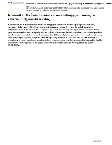 Komunikat dla Świadczeniodawców realizujących umowy w zakresie pielęgniarki szkoln Autor: Adres: http://www.nfz-zielonagora.pl/PL/155/4645/Komunikat_dla_Swiadczeniodawcow_realiz ujacych_umowy_w_zakresie_pielegniarki_szkolnej/ Komunikat dla Świadczeniodawców realizujących umowy w zakresie pielęgniarki szkolnej Komunikat dla Świadczeniodawców realizujących umowy w zakresie pielęgniarki szkolnej dotyczący informacji o liczbie uczniów potwierdzonej przez Dyrektorów szkół, zgodnie z załącznikiem nr 5 do umowy POZ Zgodnie z § 7 ust. 3 zawartej umowy o udzielaniu świadczeń gwarantowanych w rodzaju podstawowa opieka zdrowotna Świadczeniodawcy są zobowiązani do przekazania w terminie do dnia 7 października 2016r. podpisaną przez Dyrektora szkoły pisemną informację sporządzoną odrębnie dla każdej szkoły zgodnie z załącznikiem nr 5 do umowy. Z uwagi na powyższe prosimy o przekazanie w wyznaczonym terminie pisemnej informacji o liczbie uczniów w szkole zgodnie z listą sprawozdawaną i zweryfikowaną według stanu na dzień 01.09.2016r. strona 1 / 1 Powered by TCPDF (www.tcpdf.org)