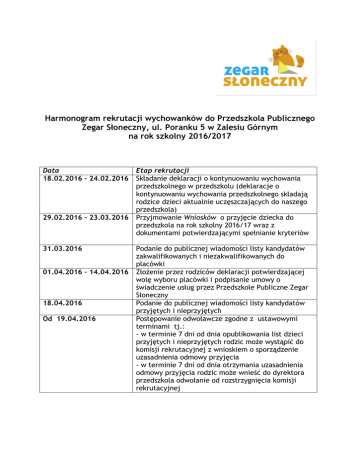 Harmonogram rekrutacji wychowanków do Przedszkola Publicznego Zegar Słoneczny, ul. Poranku 5 w Zalesiu Górnym na rok szkolny 2016/2017 Data 18.02.2016 – 24.02.2016 29.02.2016 – 23.03.2016 31.03.2016 01.04.2016 – 14.04.2016 18.04.2016 Od 19.04.2016 Etap rekrutacji Składanie deklaracji o kontynuowaniu wychowania przedszkolnego w przedszkolu (deklaracje o kontynuowaniu wychowania przedszkolnego składają rodzice dzieci aktualnie uczęszczających do naszego przedszkola) Przyjmowanie Wniosków o przyjęcie dziecka do przedszkola na rok szkolny 2016/17 wraz z dokumentami potwierdzającymi spełnianie kryteriów Podanie do publicznej wiadomości listy kandydatów zakwalifikowanych i niezakwalifikowanych do placówki Złożenie przez rodziców deklaracji potwierdzającej wolę wyboru placówki i podpisanie umowy o świadczenie usług przez Przedszkole Publiczne Zegar Słoneczny Podanie do publicznej wiadomości listy kandydatów przyjętych i nieprzyjętych Postępowanie odwoławcze zgodne z ustawowymi terminami tj.: - w terminie 7 dni od dnia opublikowania list dzieci przyjętych i nieprzyjętych rodzic może wystąpić do komisji rekrutacyjnej z wnioskiem o sporządzenie uzasadnienia odmowy przyjęcia - w terminie 7 dni od dnia otrzymania uzasadnienia odmowy przyjęcia rodzic może wnieść do dyrektora przedszkola odwołanie od rozstrzygnięcia komisji rekrutacyjnej
