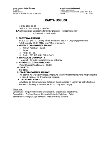 Urząd Miasta i Gminy Ścinawa Rynek 17 59-330 Ścinawa tel.:+48 76 8412600 ,fax:+48 76 8412601 e- mail: [email protected] godziny urzędowania: poniedziałek, środa,czwartek i piątek 7.30- 15.30 wtorek 8.00 - 16.00 KARTA USŁUGI z dnia 2013-07-10 ważna do dnia zmiany przepisów. 1.Nazwa usługi: Odroczenia terminów płatności i rozłożenia na raty zobowiązań podatkowych. 2. PODSTAWA PRAWNA : art.67a § 1 pkt 1 i 2 ustawy z dnia 29 sierpnia 1997r. – Ordynacja podatkowa (tekst jednolity Dz.U. 2012r. poz.749 ze zmianami). 3. MIEJSCE ZAŁATWIENIA SPRAWY: 1. Referat Podatków i Opłat, 2. Parter, 3. Pokój 17 i 11, 4. Telefon 768 412 614 i 768 412 621. 4. WYMAGANE DOKUMENTY wniosek - formularz w załączeniu do pobrania. 5. MIEJSCE ZŁOŻENIA WNIOSKU: Punkt Obsługi Mieszkańców – Parter. 6. OPŁATY: bez opłat. 7. CZAS ZAŁATWIENIA SPRAWY: nie później niż w ciągu miesiąca, w sprawie szczególnie skomplikowanej nie później niż w ciągu 2 miesięcy od dnia złożenia podania. 8. TRYB ODWOŁAWCZY: odwołanie do Samorządowego Kolegium Odwoławczego w Legnicy za pośrednictwem Burmistrza Ścinawy w terminie 14 dni od doręczenia decyzji. Metryczka: Opracowała: Bogumiła Sośnicka specjalista ds. księgowości podatkowej, Sprawdziła : Grażyna Duszak -Kierownik Referatu Podatków i Opłat, Zatwierdziła : Patrycja Jugo Sekretarz Miasta i Gminy Ścinawa. Dane Wnioskodawcy: Nazwisko i Imię / Jednostka: Adres: Nr PESEL/REGON oraz NIP: Nr telefonu Burmistrz Ścinawy WNIOSEK o udzielenie - ulgi w spłacie zobowiązań podatkowych1 ............................................................................................................................................. ............................................................................................................................................. (podatek od nieruchomości, rolny, leśny, od środków transportowych , opłaty od posiadania psów,) w formie2 …........................................................................................................................... ….......................................................................................................................................... ….......................................................................................................................................... (należy określić formę ulgi podatkowej lub należności pieniężnych inne niż podatki) W przypadku odroczenia terminu płatności czy rozłożenia na raty - należy podać wysokość i ilość rat oraz termin ich zapłaty …................................................................................................... ….......................................................................................................................................... ….......................................................................................................................................... UZASADNIENIE ............................................................................................................................................. ............................................................................................................................................. ............................................................ ................................................................................ ............................................................................................................................................. ............................................................................................................................................. ............................................................................................................................................. ............................................................................................................................................. ............................................................................................................................................. ............................................................................................................................................. ............................................................................................................................................. ............................................................................................................................................. ..................................................... ….............................................. (miejscowość, data) Objaśnienia: 1 Należy wskazać odpowiedni rodzaj podatku lub innych należności 2 Formy ulg podatkowych: 1. Odroczenie terminu płatności podatku lub rozłożenie zapłaty podatku na raty, 2. Odroczenie lub rozłożenie na raty zapłaty zaległości podatkowej wraz z odsetkami, 3. Umorzenie w całości lub w części zaległości podatkowych, odsetek za zwłokę lub opłaty prolongacyjnej Załącznik: - oświadczenie o stanie majątkowym. (podpis Wnioskodawcy) Dane wnioskodawcy: Nazwisko i Imię / Jednostka: Adres: Nr PESEL/REGON/NIP: Nr telefonu: OŚWIADCZENIE o stanie majątkowym W związku ze złożonym wnioskiem, który wpłynął do Urzędu Miasta i Gminy Ścinawa w dniu...............................w sprawie.................................................................................................... …........................................................................................................................................................ oświadczam, co następuje: 1. Przyczyna powstałych zaległości:....................................................................................................... …......................................................................................................................................................