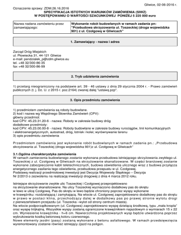 Gliwice, 02-06-2016 r. Oznaczenie sprawy: ZDM.26.16.2016 SPECYFIKACJA ISTOTNYCH WARUNKÓW ZAMÓWIENIA (SIWZ) W POSTĘPOWANIU O WARTOŚCI SZACUNKOWEJ PONIŻEJ 5 225 000 euro Nazwa nadana zamówieniu przez zamawiającego: Wykonanie robót budowlanych w ramach zadania pn: "Przebudowa skrzyzowania ul. Toszeckiej (droga wojewódzka 901) z ul. Czołgową w Gliwicach" 1. Zamawiający - nazwa i adres Zarząd Dróg Miejskich ul. Płowiecka 31, 44-121 Gliwice e-mail: [email protected] tel. +48 32/300-86-35 fax +48 32/300-86-99 2. Tryb udzielenia zamówienia 1) przetarg nieograniczony na podstawie art. 39 - 46 ustawy z dnia 29 stycznia 2004 r. - Prawo zamówień publicznych (t. j. Dz. U. z 2015 r. poz.2164) zwanej dalej "ustawą pzp". 3. Opis przedmiotu zamówienia 1) przedmiotem zamówienia są roboty budowlane. 2) kod i nazwa wg Wspólnego Słownika Zamówień (CPV): główny przedmiot: kod CPV: 45.23.31.20-6 - nazwa: Roboty w zakresie budowy dróg dodatkowe przedmioty: kod CPV: 45.23.00.00-8 - nazwa: Roboty budowlane w zakresie budowy rurociągów, linii komunikacyjnych i elektroenergetycznych, autostrad, dróg, lotnisk i kolei; wyrównywanie terenu 3) opis przedmiotu zamówienia Przedmiotem zamówienia jest wykonanie robót budowlanych w ramach zadania pn.: „Przebudowa skrzyżowania ul. Toszeckiej (droga wojewódzka 901)z ul. Czołgową w Gliwicach” 3.1.Ogólna charakterystyka zamówienia W ramach zamierzenia budowlanego zostanie wykonana przebudowa istniejącego skrzyżowania zwykłego ul. Toszeckiej z ul. Czołgową w Gliwicach na skrzyżowanie skanalizowane. W części branżowej zostanie wykonane zabezpieczenie kabli teletechnicznych, budowa oświetlenia ulicznego wraz z budowa przyłącza energetycznego zasilania tego oświetlenia, przebudowa przepustu w ul. Czołgowej. Podstawą realizacji przedmiotowej inwestycji jest Decyzja Wojewody Śląskiego – Decyzja Nr 2/2013 o zezwoleniu na realizację inwestycji drogowej z dnia 4 marca 2012 roku. Istniejące skrzyżowanie zwykłe ulic Toszeckiej i Czołgowej przeprojektowano na skrzyżowanie skanalizowane. Na ulicy Toszeckiej wyznaczono dodatkowy pas do skrętu w lewo w ulicę Czołgową. Pas do skrętu w lewo będzie chroniony poprzez wyspy wykonane w krawężniku: rozdzielającą i zamykającą. Na wlocie ul. Czołgowej zaprojektowano dodatkowy pas do skrętu w prawo w postaci klina, przechodzący dalej w dodatkowy pas po prawej stronie wylotu drogi z pierwszeństwem przejazdu (ul. Toszecka –wylot od strony centrum miasta). Na wlocie podporządkowanym (ul. Czołgowa) zaprojektowano wyspę dzielącą środkową, typu „mała kropla” oraz wyspę trójkątną. Wszystkie wyspy zostaną ograniczone krawężnikiem najazdowym o wymiarach 15 x 22 cm. Wyniesienie krawężnika - h=6 cm. Nawierzchnia projektowanych wysp będzie utwardzona poprzez wybrukowanie kostką betonową koloru czerwonego. Nowe elementy jezdni (pasy) zostaną wykonane z betonu asfaltowego. W ramach przedsięwzięcia wyremontowany zostanie również istniejący zjazd na poligon. Roboty z zakresu infrastruktury drogowej oraz innych elementów związanych z wyposażeniem drogi. 3.2. Roboty drogowe – parametry techniczne: Przyjęte parametry projektowe: - Drogi poza terenem zabudowy (teren leżący w otoczeniu drogi – las) - Obszar zabudowany (prędkość pojazdów ograniczona istniejącym znakiem „D-42”) Droga nadrzędna – ul. Toszecka [DW 901] – droga klasy G -Prędkość projektowa Vp=70 km/h -Największa dopuszczalna prędkość samochodów osobowych ograniczona przepisami Vo=60 km/h -Prędkość miarodajna wlotów skrzyżowania Vm=80 km/h (przyjęta na podstawie „Warunków technicznych jakim powinny odpowiadać drogi publiczne i ich usytuowanie” – § 57.2) -Szerokość podstawowych pasów ruchu= 3,5 m + opaski o szerokości 0,5 m Dodatkowy pas do skrętu w lewo -Odcinek zmiany pasa ruchu Lzp=50 m -Klin początkujący dodatkowy pas Lk=35 m - Odcinek zwalniania Lzv=85 m - Odcinek akumulacji LA=40 m - Szerokość dodatkowego pasa ruchu do skrętu w lewo= 3,5 m Dodatkowy pas po prawej stronie wylotu drogi z pierwszeństwem przejazdu -Odcinek przyspieszania Lp=100 m -Odcinek zmiany pasa ruchu Lzp=60 m -Szerokość dodatkowego pasa po prawej stronie wylotu drogi = 3,5 m Droga podporządkowana – ul. Czołgowa -Szerokość podstawowych pasów ruchu= 3,25 m + opaski o szerokości 0,5 m (dowiązanie do przekroju istniejącego) -Dodatkowy pas do skrętu w prawo w postaci klina o skosie 1:10, przechodzący w dodatkowy pas po prawej stronie wylotu drogi z pierwszeństwem przejazdu (ul. Toszecka). Przekrój poprzeczny Na ulicy Toszeckiej zaprojektowano dodatkowe pasy ruchu o pełnej konstrukcji nawierzchni KR5. Nawierzchnia istniejąca zostanie wzmocniona i połączona z nową nawierzchnią, w miejscach poszerzeń, za pomocą nakładki (2 warstwy asfaltowe: wiążąca + ścieralna) oraz siatki z drutu stalowego wraz z warstwą mocującą typu „slurry seal”. Przyjęto założenie, że na całym zakresie opracowania nawierzchni jezdni ul. Toszeckiej wykonane zostaną warstwy: - ścieralna o grubości 5 cm, - wiążąca o grubości 8 cm, - siatka z drutu stalowego wraz z warstwą mocującą typu „slurry seal” o grubości 1 cm. Na wlocie ulicy Czołgowej, z uwagi na zmianę geometrii w planie skrzyżowania, poszerzenie wlotu, korektę wysokościową oraz konieczność budowy nowego przepustu pod wlotem, zaprojektowano nową, pełną konstrukcję nawierzchni KR5. Na poboczach zaprojektowano opaski o szerokości 0,5 m o nawierzchni i spadkach analogicznych jak dla pasów ruchu. Opaski wyodrębnione będą od jezdni oznakowaniem poziomym – linie malowane krawędziowe. Pozostałą część poboczy zaprojektowano jako pobocza ulepszone o nawierzchni z kruszywa łamanego, w celu sprawnego odprowadzenia wody poza jezdnię i koronę drogi. Pochylenie poprzeczne poboczy ulepszonych, wynosić będzie 8% w kierunku rowów. Szerokość projektowanych poboczy ulepszonych