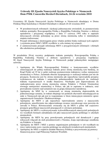 Uchwały III Zjazdu Nauczycieli Języka Polskiego w Niemczech Dom PMK Concordia Herdorf-Dermbach, 24-26 września 2010 Uczestnicy III Zjazdu Nauczycieli Języka Polskiego w Niemczech obradujący w Domu Polskiej Misji Katolickiej w Herdorf-Dermbach w dniach 24-26 września 2010    W przedstawionych referatach i dyskusji jednoznacznie stwierdzili, że postanowienia traktatu pomiędzy Rzeczpospolitą Polską a Republiką Federalną Niemiec o dobrym sąsiedztwie i przyjaznej współpracy z dnia 17 czerwca 1991 roku w zapisach dotyczących oświaty polonijnej są przez stronę niemiecką tylko w minimalnym stopniu realizowane; Przyjęli informację o dostrzeganiu przez władze polskie braku realizacji tych zapisów i czynieniu przez MSZ i MSW wysiłków w celu zmiany tej sytuacji; Z zainteresowanie przyjęli informację MEN o przygotowanych reformach i ofertach dla szkolnictwa polonijnego. W przededniu 20-tej rocznicy podpisania traktatu pomiędzy Rzeczpospolitą Polską a Republiką Federalną Niemiec o dobrym sąsiedztwie i przyjaznej współpracy III Zjazd Nauczycieli Języka Polskiego w Niemczech podjął jednomyślnie następujące uchwały: 1. Apelujemy do Władz Rzeczpospolitej Polskiej o kontynuowanie wysiłków zmierzających do pełnej realizacji traktatu przez stronę niemiecką tym bardziej, że Rząd Polski od 19 lat w pełni realizuje postanowienia traktatowe wobec mniejszości niemieckiej w Polsce. Zaistniała obecnie dysproporcja w realizacji traktatu jest nie do przyjęcia. Konieczne jest by strona niemiecka jak najszybciej wprowadziła przepisy wykonawcze do traktatu i ustanowiła pełnomocników landowych ds. realizacji traktatu wyposażonych w środki finansowe. Niezbędne jest doprowadzenie do zaakceptowania przez stronę niemiecką statusu Polaków i Polonii Niemieckiej równego mniejszości niemieckiej w Polsce, tak jak to zapisano w traktacie, oraz prowadzenie rozmów nad uznaniem nas za grupę mniejszości narodowej. 2. Apelujemy do MSZ by w rozmowach ze stroną niemiecką doprowadziła do jednoznacznego uznania, że traktat obejmuje też polskich obywateli mieszkających na stałe w Niemczech tak jak jest to wspomniane w liście intencyjnym ministrów spraw zagranicznych Genschera i Skubiszewskiego. 3. Apelujemy do MEN o jak najszybsze wprowadzenie ustawy o nauczycielu polonijnym, umożliwienie mu odpowiedniego awansu zawodowego oraz powrotu do zawodu w Polsce. Równocześnie zwracamy się do MEN o pełne lub częściowe przejęcie gratyfikacji nauczycieli pracujących w oświacie polonijnej. 4. Apelujemy do MEN o wykorzystywanie wykwalifikowanych nauczycieli polonijnych we wszelkich formach zatrudniania ich jako nauczycieli języka polskiego w szkołach niemieckich. 5. Apelujemy do MEN by przy powoływaniu polonijnych ciał doradczych i grup roboczych włączali do nich przedstawicieli z Niemiec, kraju największego osiedlenia się Polaków w Europie. 6. Apelujemy do MEN i MSZ o pomoc organizacjom polonijnym w ich wysiłkach na rzecz wpisywania ocen z języka polskiego na szkolnych świadectwach niemieckich. 7. Apelujemy do MSZ o wsparcie działań Macierzy Polskiej o przywrócenie jej pomocy finansowej przez rząd Pólnocnej Nadrenii-Westfalii. 1 8. Apelujemy do polskich mediów a szczególnie do TV Polonia o wprowadzenie programów dla rodziców ukazujących zalety dwujęzyczności dziecka i konieczność zapoznania się z systemem edukacyjnym krajów do których zamierzają wyjeżdżać. Apelujemy też by media jasno uświadamiały rodzicom zalety zachowania przez dzieci tożsamości narodowej i języka polskiego. 9. Apelujemy do wszystkich organizacji polonijnych o jak największe rozpropagowanie i organizowanie egzaminów certyfikatowych MEN z języka polskiego. 10. Apelujemy do wszystkich organizacji polonijnych o jak największe rozpropagowanie możliwości nauki języka polskiego jako obcego w gimnazjach niemieckich oraz zdawania go na maturze niemieckiej wszędzie tam, gdzie jest to już oferowane. 11. Apelujemy do organizatorów przyszłych zjazdów o rozpoczynanie ich krótkim podsumowaniem realizacji przyjętych uchwał. Komisja Wnioskowa Prof. Piotr Małoszewski – Chrześcijańskie Centrum w Niemczech - przewodniczący Pani Małgorzata Staszak – Towarzystwo Szkolne „Oświata” w Berlinie Pani Lidia Weber – Polska Macierz Szkolna w Niemczech Pan Tomasz Rozum – Polsko-Niemieckie Towarzystwo Społeczno-Kulturalne Lubeka-95 Pani Ewa Źródlewska-Banachowicz – Niemiecko-Polska Inicjatywa Rodziców Frankfurt 2