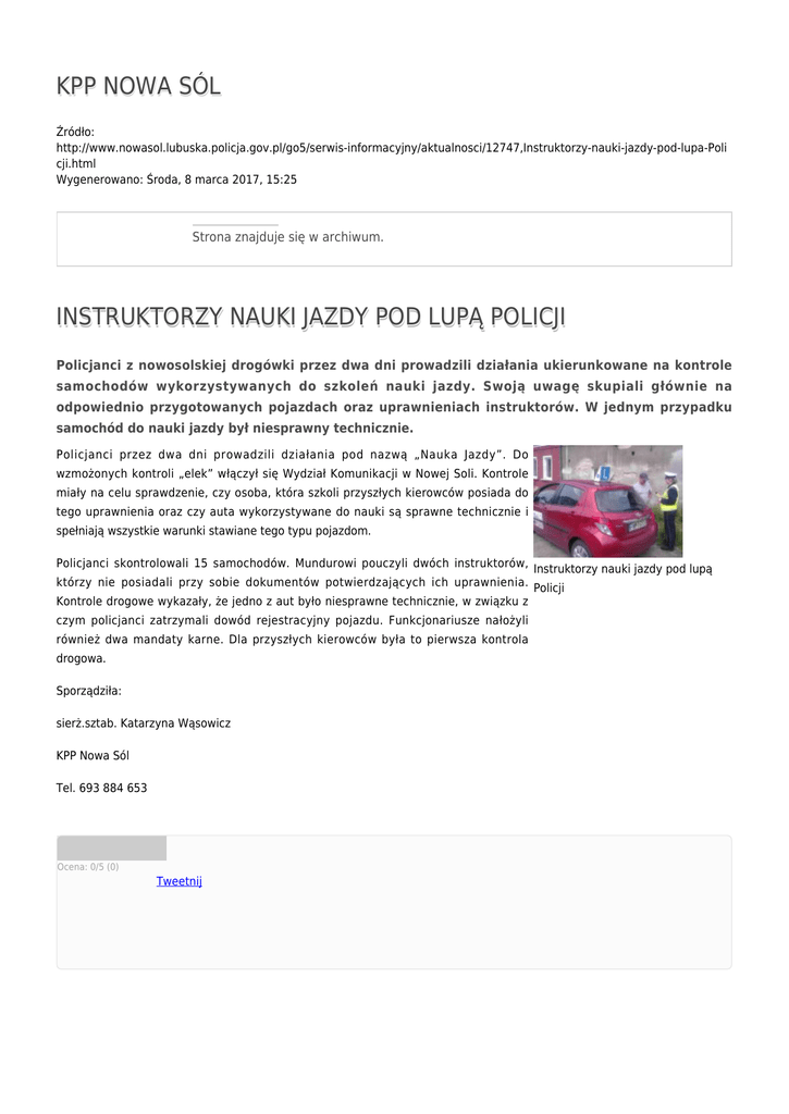 KPP NOWA SÓL Źródło: http://www.nowasol.lubuska.policja.gov.pl/go5/serwis-informacyjny/aktualnosci/12747,Instruktorzy-nauki-jazdy-pod-lupa-Poli cji.html Wygenerowano: Środa, 8 marca 2017, 15:25 Strona znajduje się w archiwum. INSTRUKTORZY NAUKI JAZDY POD LUPĄ POLICJI Policjanci z nowosolskiej drogówki przez dwa dni prowadzili działania ukierunkowane na kontrole samochodów wykorzystywanych do szkoleń nauki jazdy. Swoją uwagę skupiali głównie na odpowiednio przygotowanych pojazdach oraz uprawnieniach instruktorów. W jednym przypadku samochód do nauki jazdy był niesprawny technicznie. Policjanci przez dwa dni prowadzili działania pod nazwą „Nauka Jazdy”. Do wzmożonych kontroli „elek” włączył się Wydział Komunikacji w Nowej Soli. Kontrole miały na celu sprawdzenie, czy osoba, która szkoli przyszłych kierowców posiada do tego uprawnienia oraz czy auta wykorzystywane do nauki są sprawne technicznie i spełniają wszystkie warunki stawiane tego typu pojazdom. Policjanci skontrolowali 15 samochodów. Mundurowi pouczyli dwóch instruktorów, Instruktorzy nauki jazdy pod lupą którzy nie posiadali przy sobie dokumentów potwierdzających ich uprawnienia. Policji Kontrole drogowe wykazały, że jedno z aut było niesprawne technicznie, w związku z czym policjanci zatrzymali dowód rejestracyjny pojazdu. Funkcjonariusze nałożyli również dwa mandaty karne. Dla przyszłych kierowców była to pierwsza kontrola drogowa. Sporządziła: sierż.sztab. Katarzyna Wąsowicz KPP Nowa Sól Tel. 693 884 653 Ocena: 0/5 (0) Tweetnij