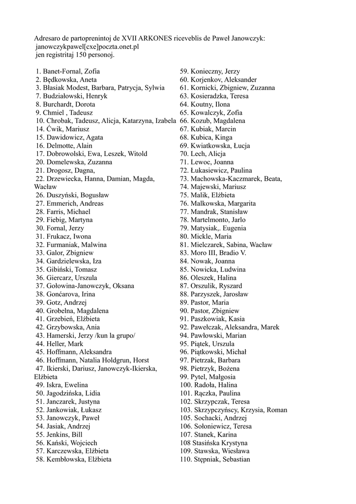 Adresaro de partoprenintoj de XVII ARKONES riceveblis de Paweł Janowczyk: janowczykpawel[cxe]poczta.onet.pl jen registritaj 150 personoj. 1. Banet-Fornal, Zofia 2. Będkowska, Aneta 3. Błasiak Modest, Barbara, Patrycja, Sylwia 7. Budziałowski, Henryk 8. Burchardt, Dorota 9. Chmiel , Tadeusz 10. Chrobak, Tadeusz, Alicja, Katarzyna, Izabela 14. Ćwik, Mariusz 15. Dawidowicz, Agata 16. Delmotte, Alain 17. Dobrowolski, Ewa, Leszek, Witold 20. Domelewska, Zuzanna 21. Drogosz, Dagna, 22. Drzewiecka, Hanna, Damian, Magda, Wacław 26. Duszyński, Bogusław 27. Emmerich, Andreas 28. Farris, Michael 29. Fiebig, Martyna 30. Fornal, Jerzy 31. Frukacz, Iwona 32. Furmaniak, Malwina 33. Galor, Zbigniew 34. Gardzielewska, Iza 35. Gibiński, Tomasz 36. Giercarz, Urszula 37. Gołowina-Janowczyk, Oksana 38. Gonćarova, Irina 39. Gotz, Andrzej 40. Grobelna, Magdalena 41. Grzebień, Elżbieta 42. Grzybowska, Ania 43. Hamerski, Jerzy /kun la grupo/ 44. Heller, Mark 45. Hoffmann, Aleksandra 46. Hoffmann, Natalia Holdgrun, Horst 47. Ikierski, Dariusz, Janowczyk-Ikierska, Elżbieta 49. Iskra, Ewelina 50. Jagodzińska, Lidia 51. Janczarek, Justyna 52. Jankowiak, Łukasz 53. Janowczyk, Paweł 54. Jasiak, Andrzej 55. Jenkins, Bill 56. Kański, Wojciech 57. Karczewska, Elżbieta 58. Kembłowska, Elżbieta 59. Konieczny, Jerzy 60. Korjenkov, Aleksander 61. Kornicki, Zbigniew, Zuzanna 63. Kosieradzka, Teresa 64. Koutny, Ilona 65. Kowalczyk, Zofia 66. Kozub, Magdalena 67. Kubiak, Marcin 68. Kubica, Kinga 69. Kwiatkowska, Łucja 70. Lech, Alicja 71. Lewoc, Joanna 72. Łukasiewicz, Paulina 73. Machowska-Kaczmarek, Beata, 74. Majewski, Mariusz 75. Malik, Elżbieta 76. Malkowska, Margarita 77. Mandrak, Stanisław 78. Martelmonto, Jarlo 79. Matysiak,. Eugenia 80. Mickle, Maria 81. Mielczarek, Sabina, Wacław 83. Moro III, Bradio V. 84. Nowak, Joanna 85. Nowicka, Ludwina 86. Oleszek, Halina 87. Orszulik, Ryszard 88. Parzyszek, Jarosław 89. Pastor, Maria 90. Pastor, Zbigniew 91. Paszkowiak, Kasia 92. Pawełczak, Aleksandra, Marek 94. Pawłowski, Marian 95. Piątek, Urszula 96. Piątkowski, Michał 97. Pietrzak, Barbara 98. Pietrzyk, Bożena 99. Pytel, Małgosia 100. Radoła, Halina 101. Rączka, Paulina 102. Skrzypczak, Teresa 103. Skrzypczyńscy, Krzysia, Roman 105. Sochacki, Andrzej 106. Sołoniewicz, Teresa 107. Stanek, Karina 108 Stasińska Krystyna 109. Stawska, Wiesława 110. Stępniak, Sebastian 111. Stochaj, Rafał 112. Szczygieł, Dorota 113. Szczygieł, Zofia 114. Szraiber, Helena 115. Szubert, Barbara 116 Szwaja, Mieczysława 117. Szymańska, Ewa 118. Szymoniak, Anita 119. Śmigielski, Stanisław 120. Śmistek, Zofia 121. Śpiewak, Joletta Ewa 123. Sevćenko, Dmitrij 124. Ternka, Irena 125. Tomczak, Krzysztof 126. Tudaj, Danuta 127. Urbaniak, Agnieszka 128. Uroda, Agnieszka 129. Walaszek, Jerzy 130. Wang Chung, yi,Werdin, Joachim, Camilio 133. Westerhoff, Bernhard Tina, Liqun Chen 136. Wizła, Gabriela 137. Woźnica, Marta 138. Wunsch-Rolshoven, Lu 139. Wunsch Teruel, Iris 140. Wyrzykiewicz, Szymon 141. Zawada, Grażyna 142. Zdechlik, Aleksander 143. Zemła, Dariusz, Krystyna, Flawia, Emanuel 147. Ziemlińska, Natalia 148. Zilvar, Peter 149. Zygadło, Zenobia 150. Zygmunt, Renata