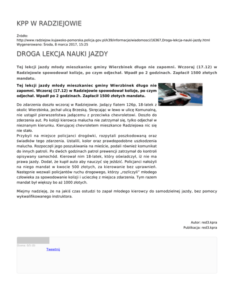 KPP W RADZIEJOWIE Źródło: http://www.radziejow.kujawsko-pomorska.policja.gov.pl/k39/informacje/wiadomosci/16367,Droga-lekcja-nauki-jazdy.html Wygenerowano: Środa, 8 marca 2017, 15:25 DROGA LEKCJA NAUKI JAZDY Tej lekcji jazdy młody mieszkaniec gminy Wierzbinek długo nie zapomni. Wczoraj (17.12) w Radziejowie spowodował kolizje, po czym odjechał. Wpadł po 2 godzinach. Zapłacił 1500 złotych mandatu. Tej lekcji jazdy młody mieszkaniec gminy Wierzbinek długo nie zapomni. Wczoraj (17.12) w Radziejowie spowodował kolizje, po czym odjechał. Wpadł po 2 godzinach. Zapłacił 1500 złotych mandatu. Do zdarzenia doszło wczoraj w Radziejowie. Jadący fiatem 126p, 18-latek z okolic Wierzbinka, jechał ulicą Brzeską. Skręcając w lewo w ulicę Komunalną, nie ustąpił pierwszeństwa jadącemu z przeciwka chevroletowi. Doszło do zderzenia aut. Po kolizji kierowca malucha nie zatrzymał się, tylko odjechał w nieznanym kierunku. Kierującej chevroletem mieszkance Radziejowa nic się nie stało. Przybyli na miejsce policjanci drogówki, rozpytali poszkodowaną oraz świadków tego zdarzenia. Ustalili, kolor oraz prawdopodobne uszkodzenia malucha. Rozpoczęli jego poszukiwania na mieście, podali również komunikat do innych patroli. Po dwóch godzinach patrol prewencji zatrzymał do kontroli opisywany samochód. Kierował nim 18-latek, który oświadczył, iż nie ma prawa jazdy. Dodał, że kupił auto aby nauczyć się jeździć. Policjanci nałożyli na niego mandat w kwocie 500 złotych, za kierowanie bez uprawnień. Następnie wezwali policjantów ruchu drogowego, którzy „rozliczyli” młodego człowieka za spowodowanie kolizji i ucieczkę z miejsca zdarzenia. Tym razem mandat był większy bo aż 1000 złotych. Miejmy nadzieję, że na jakiś czas ostudzi to zapał młodego kierowcy do samodzielnej jazdy, bez pomocy wykwalifikowanego instruktora. Autor: red3.kpra Publikacja: red3.kpra Ocena: 0/5 (0) Tweetnij