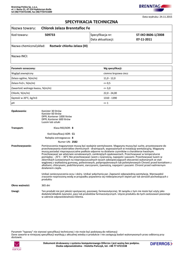 Brenntag Polska Sp. z.o.o. ul. J. Bema 21, 47-224 Kędzierzyn-Koźle tel (48/77)4721500, fax (48/77)4721600 Data wydruku: 24.11.2015 SPECYFIKACJA TECHNICZNA Nazwa towaru: Kod towaru: Chlorek żelaza Brenntafloc Fe 509733 Nazwa chemiczna\skład: Specyfikacja nr: Data aktualizacji: ST-IXO 8606-1/2008 07-11-2011 Roztwór chlorku żelaza (III) Nazwa INCI: Parametr oznaczony: Wg specyfikacji: Wygląd zewnętrzny ciemno brązowa ciecz Żelazo ogólne, %(m/m) 11,0 - 12,0 Żelazo Fe2+, %(m/m) <= 0,5 Zawartość wolnego kwasu, %(m/m) <= 3,0 Chlorki, %(m/m) 22,0 - 24,00 Gęstość w 20°C, kg/m3 1310 - 1390 pH <= 1 Opakowania: Kanister 30 litrów Kanister 60 litrów DPPL Kontener 1000 litrów DPPL Kontener 600 litrów Luzem lub sztuki Transport: Przechowywanie: Klasa RID/ADR: 8 Kod klasyfikacji ADR: C1 Nalepka ostrzegawcza: 8 Numer UN: 2582 Pomieszczenia magazynowe muszą być wydajnie wentylowane. Magazyny muszą być suche, przystosowane do przechowywania materiałów chemicznych - drażniących, wyposażonych w instalację wentylacyjną. Magazyny muszą posiadać nieprzepuszczalne podłoże odporne na działanie czynników o charakterze kwaśnym. Przechowywać we właściwie oznakowanych, zamkniętych opakowaniach. Przechowywać w temperaturze pomiędzy: - 25°C – 30°C Nie przechowywać razem z żywnością, napojami i paszami. Przechowywać luzem w zbiornikach (ustawionych na nieprzepuszczalnych tacach zabezpieczających otoczenie) wykonanych ze stali węglowej z wykładziną gumową, poliestrowych, polipropylenowych lub polietylenowych Chronić przed kontaktem z alkaliami, chlorynami, podchlorynami, siarczynami, żywnością, napojami i paszami. Chronić przed nadmiernym działaniem ciepła. Unikać zanieczyszczenia oczu i skóry. Unikać wdychania par. Zapewnić odpowiednią wentylację. Wprowadzić zraszanie rozproszoną wodą w przypadku pojawienia się niebezpiecznych stężeń par lub aerozoli pochodzących z produktu Okres ważności: 365 dni Uwagi: Ten produkt nie jest jakości spożywczej, paszowej, farmaceutycznej. W związku z tym nie może być użyty jako dodatek/składnik żywności, pasz lub produktów farmaceutycznych. Użycie produktu do tych zastosowań pozostaje w zakresie odpowiedzialności klienta. Parametr "typowy" nie stanowi specyfikacji technicznej i nie może być podstawą do reklamacji Dane zawarte w niniejszej specyfikacji wynikają z aktualnej wiedzy o produkcie i nie zastępują badań wykonywanych przez odbiorcę przy dostawie. Dokument drukowany z systemu komputerowego Diferros i jest ważny bez podpisu. Osoba odpowiedzialna - Violetta Pańczyk, tel. +48 77 4721538