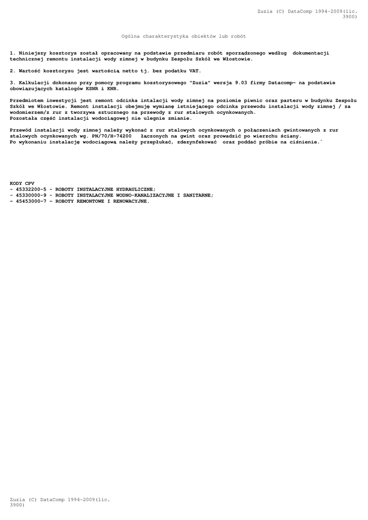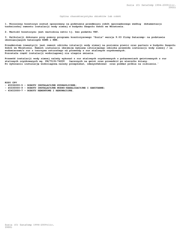 Zuzia (C) DataComp 1994-2009(lic. 3900) Ogólna charakterystyka obiektów lub robót 1. Niniejszy kosztorys został opracowany na podstawie przedmiaru robót sporządzonego według technicznej remontu instalacji wody zimnej w budynku Zespołu Szkół we Włostowie. dokumentacji 2. Wartość kosztorysu jest wartością netto tj. bez podatku VAT. 3. Kalkulacji dokonano przy pomocy programu kosztorysowego "Zuzia" wersja 9.03 firmy Datacomp- na podstawie obowiązujących katalogów KSNR i KNR. Przedmiotem inwestycji jest remont odcinka intalacji wody zimnej na poziomie piwnic oraz parteru w budynku Zespołu Szkół we Włostowie. Remont instalacji obejmuję wymianę istniejącego odcinka przewodu instalacji wody zimnej / za wodomierzem/z rur z tworzywa sztucznego na przewody z rur stalowych ocynkowanych. Pozostała część instalacji wodociągowej nie ulegnie zmianie. Przewód instalacji wody zimnej należy wykonać z rur stalowych ocynkowanych o połączeniach gwintowanych z rur stalowych ocynkowanych wg. PN/70/H-74200 łączonych na gwint oraz prowadzić po wierzchu ściany. Po wykonaniu instalację wodociągową należy przepłukać, zdezynfekować oraz poddać próbie na ciśnienie.` KODY CPV - 45332200-5 - ROBOTY INSTALACYJNE HYDRAULICZNE; - 45330000-9 - ROBOTY INSTALACYJNE WODNO-KANALIZACYJNE I SANITARNE; - 45453000-7 - ROBOTY REMONTOWE I RENOWACYJNE. Zuzia (C) DataComp 1994-2009(lic. 3900) Zuzia (C) DataComp 1994-2009(lic. 3900) Przedmiar robót Podstawa nakładu, opis pozycji Ilość Krot. Jedn. 1 Roboty demontażowe i montażowe instalacji wody zimnej(KODY CPV 45332200-5;45330000-9;45453000-7) 1.1 KNR 402/230/8 Demontaż rurociągu z PE na ścianach budynku, Fi·do 75-110·mm 7,3 m 1.2 KNR 402/230/7 Demontaż rurociągu z PE na ścianach budynku, Fi·do 50·mm 34,7 m 1.3 KNRW 402/142/2 Demontaż zaworu przelotowego lub zwrotnego, Fi·25-32·mm 2 szt 1.4 KNRW 402/142/3 Demontaż zaworu przelotowego lub zwrotnego, Fi·40-50·mm 1 szt 1.5 KNNR 4/106/3 Rurociągi stalowe ocynkowane o połączeniach gwintowanych, na ścianach w budynkach niemieszkalnych, Dn·25·mm 9,9 m 1.6 KNNR 4/106/4 Rurociągi stalowe ocynkowane o połączeniach gwintowanych, na ścianach w budynkach niemieszkalnych, Dn·32·mm 2,8 m 1.7 KNNR 4/106/7 Rurociągi stalowe ocynkowane o połączeniach gwintowanych, na ścianach w budynkach niemieszkalnych, Dn·65·mm 29,30 m 1.8 KNR 215/408/3 (1) Zawór wodny kulowy Fi·25·mm 2 szt 1.9 KNR 215/408/4 (1) Zawór wodny kulowy Fi·32·mm 1 szt 1.10 KNR 215/408/6 (1) Zawór wodny kulowy Fi·65·mm 3 szt 1.11 KNR 712/105/4 Odtłuszczanie, rurociągi 2,14 m2 1.12 KNR 712/209/5 (1) Malowanie pędzlem - farby nawierzchniowe i emalie olejne, rurociągi, Fi·58-219·mm, farba olejna nawierzchniowa ogólnego stosowania 2,14 m2 1.13 KNR 219/217/1 Przejścia rurociągu przez przeszkody budowlane - strop, grubości 25·cm - analogia 1 szt 1.14 KNR 401/323/5 (1) Zamurowanie przebić, stropy 1 szt 1.15 KNR 401/323/3 (2) Zamurowanie przebić, ściany grubości 1 cegły 4 szt 1.16 KNR 401/706/1 (2) Wykonanie tynków zwykłych kategorii III w miejscach po zamurowanych przebiciach, do 0,1·m2, 4 szt ściana, tynk cementowo-wapienny 1.17 KNR 401/706/3 (1) Wykonanie tynków zwykłych kategorii III w miejscach po zamurowanych przebiciach, do 0,1·m2, strop, tynk cementowo-wapienny 1 szt 1.18 KNNR 4/126/1 (1) Próba szczelności instalacji wodociągowych z rur żeliwnych, stalowych i miedzianych, w budynkach mieszkalnych, rurociąg Fi·do 65·mm - instalacja wod. 42 m 1.19 KNRW 215/128/2 Płukanie instalacji wodociągowej, w budynkach niemieszkalnych 42 m 1.20 KNRW 215/128/2 Dezynfekcja instalacji wodociągowej, w budynkach niemieszkalnych 42 m Zuzia (C) DataComp 1994-2009(lic. 3900)