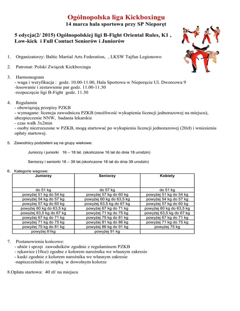 Ogólnopolska liga Kickboxingu 14 marca hala sportowa przy SP Nieporęt 5 edycja(2/ 2015) Ogólnopolskiej ligi B-Fight Oriental Rules, K1 , Low-kick i Full Contact Seniorów i Juniorów 1. Organizatorzy: Baltic Martial Arts Federation, , LKSW Tajfun Legionowo 2. Patronat: Polski Związek Kickboxingu 3. Harmonogram - waga i weryfikacja : godz. 10.00-11.00, Hala Sportowa w Nieporęcie Ul. Dworcowa 9 -losowanie i zestawienie par godz. 11.00-11.30 -rozpoczęcie ligi B-Fight godz. 11.30 4. Regulamin - obowiązują przepisy PZKB - wymagane: licencja zawodnicza PZKB (możliwość wykupienia licencji jednorazowej na miejscu), ubezpieczenie NNW, badania lekarskie - czas walk 3x2min - osoby niezrzeszone w PZKB, mogą startować po wykupieniu licencji jednorazowej (20zł) i wniesieniu opłaty startowej. 5. Zawodnicy podzieleni są na grupy wiekowe: Juniorzy i juniorki 16 – 18 lat. (skończone 16 lat do dnia 18 urodzin) Seniorzy i seniorki 18 – 39 lat.(skończone 18 lat do dnia 39 urodzin) 6. Kategorie wagowe: Juniorzy do 51 kg powyżej 51 kg do 54 kg powyżej 54 kg do 57 kg powyżej 57 kg do 60 kg powyżej 60 kg do 63,5 kg powyżej 63,5 kg do 67 kg powyżej 67 kg do 71 kg powyżej 71 kg do 75 kg powyżej 75 kg do 81 kg powyżej 81kg 7. Seniorzy Kobiety do 57 kg powyżej 57 kg do 60 kg powyżej 60 kg do 63,5 kg powyżej 63,5 kg do 67 kg powyżej 67 kg do 71 kg powyżej 71 kg do 75 kg powyżej 75 kg do 81 kg powyżej 81 kg do 86 kg powyżej 86 kg do 91 kg powyżej 91 kg do 51 kg powyżej 51 kg do 54 kg powyżej 54 kg do 57 kg powyżej 57 kg do 60 kg powyżej 60 kg do 63,5 kg powyżej 63,5 kg do 67 kg powyżej 67 kg do 71 kg powyżej 71 kg do 75 kg powyżej 75 kg Postanowienia końcowe: - ubiór i sprzęt zawodników zgodnie z regulaminem PZKB - rękawice (10oz) zgodne z kolorem narożnika we własnym zakresie - kaski zgodnie z kolorem narożnika we własnym zakresie -napiszczelniki ze stópką w dowolnym kolorze 8.Oplata startowa: 40 zł/ na miejscu