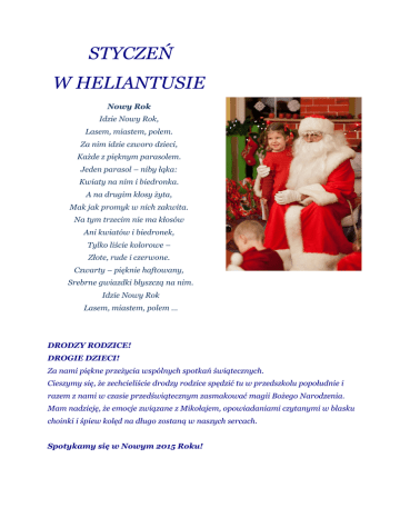 STYCZEŃ W HELIANTUSIE Nowy Rok Idzie Nowy Rok, Lasem, miastem, polem. Za nim idzie czworo dzieci, Każde z pięknym parasolem. Jeden parasol – niby łąka: Kwiaty na nim i biedronka. A na drugim kłosy żyta, Mak jak promyk w nich zakwita. Na tym trzecim nie ma kłosów Ani kwiatów i biedronek, Tylko liście kolorowe – Złote, rude i czerwone. Czwarty – pięknie haftowany, Srebrne gwiazdki błyszczą na nim. Idzie Nowy Rok Lasem, miastem, polem … DRODZY RODZICE! DROGIE DZIECI! Za nami piękne przeżycia wspólnych spotkań świątecznych. Cieszymy się, że zechcieliście drodzy rodzice spędzić tu w przedszkolu popołudnie i razem z nami w czasie przedświątecznym zasmakować magii Bożego Narodzenia. Mam nadzieję, że emocje związane z Mikołajem, opowiadaniami czytanymi w blasku choinki i śpiew kolęd na długo zostaną w naszych sercach. Spotykamy się w Nowym 2015 Roku! W styczniu przeniesiemy się do świata bajek i baśni. Świata ukochanego przez dzieci, ponieważ jest on pełen wróżek, księżniczek i rycerzy, skrzatów i krasnoludków. Odwiedzimy świat pełen magii, w którym dobro zwycięża zło, a zakończenie niesie ze sobą naukę i dobra radę. Będziemy na ich przykładzie uczyć naszych przedszkolaków podejmowania zawsze słusznych decyzji, miłości i dobroci do świata. Postaramy się zapoznać dzieci z mniej znanymi, a równie pięknymi baśniami. Zachęcamy przy tej okazji wszystkie babcie i dziadków do odwiedzin naszego przedszkola, aby przeczytać dzieciom bajki ze swojego dzieciństwa. 2015-01-08 odwiedzi nas teatrzyk z przedstawieniem „Bajeczna Księga”. To opowieść o chłopcu, który za pomocą książki przenosi się w świat fantazji. Trafia do krainy bajek, która okazuje się być zagrożona. Za pomocą swojej wyobraźni próbuje uratować bajkowy świat. 2015-01-16 Bal karnawałowy „Na balu w Bajkolandii”. Tego dnia czeka nas szalona zabawa wśród różnych postaci ulubionych bajek dzieci. Liczymy na kreatywność i pomysłowość w doborze strojów! 2015-01-19 - 2015-01-30 Ferie zimowe W pierwszym tygodniu ferii postaramy się dowiedzieć jak najwięcej na temat naszych przodków. Dzieci mogą przynosić do przedszkola zdjęcia swoich bliskich, będziemy rysować drzewa genealogiczne i uczyć się szacunku do osób starszych. Drugi tydzień ferii upłynie nam na zgłębianiu wiedzy na temat: jak zwierzęta radzą sobie w zimie i jak ludzie mogą im pomóc przetrwać też ciężki czas. Nie zapomnimy o dokarmianiu ptaków, będziemy również zbierać rzeczy do schroniska dla zwierząt, tak aby wspomóc psy i koty tam mieszkające. zespół Przedszkola Heliantus.