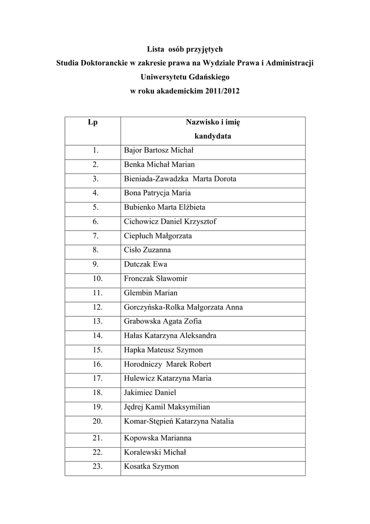 Lista osób przyjętych Studia Doktoranckie w zakresie prawa na Wydziale Prawa i Administracji Uniwersytetu Gdańskiego w roku akademickim 2011/2012 Lp Nazwisko i imię kandydata 1. Bajor Bartosz Michał 2. Benka Michał Marian 3. Bieniada-Zawadzka Marta Dorota 4. Bona Patrycja Maria 5. Bubienko Marta ElŜbieta 6. Cichowicz Daniel Krzysztof 7. Ciepłuch Małgorzata 8. Cisło Zuzanna 9. Dutczak Ewa 10. Fronczak Sławomir 11. Glembin Marian 12. Gorczyńska-Rolka Małgorzata Anna 13. Grabowska Agata Zofia 14. Hałas Katarzyna Aleksandra 15. Hapka Mateusz Szymon 16. Horodniczy Marek Robert 17. Hulewicz Katarzyna Maria 18. Jakimiec Daniel 19. Jędrej Kamil Maksymilian 20. Komar-Stępień Katarzyna Natalia 21. Kopowska Marianna 22. Koralewski Michał 23. Kosatka Szymon 2 24. Kowalska – Kusio Magdalena Agnieszka 25. Kowalska Ewelina Anna 26. Kozak Adriana Ewa 27. Krysiak Tomasz 28. Kubiak Dominika Anna 29. Kuklińska Agnieszka Maria 30. Kusowska Ewelina Maria 31. Kwaśny Michał Mateusz 32. Litka ElŜbieta 33. Lizińska Agata Magda 34. Łopaciński Adam Łukasz 35. Mach Joanna Maria 36. Mikulski Łukasz 37. Moś Szymon Paweł 38. Muza Marcin Mariusz 39. Pieńczykowski Marcin Piotr 40. Pieńkowska-Rutkowska Magdalena Karolina 41. Prytuła Katarzyna Anna 42. Reluga Grzegorz 43. Stafanowicz Krystian Jacek 44. Szczupakowski Tomasz 45. Sznajderowicz Anna 46. Szymanek Michał Kazimierz 47. Szymczak Dorota Jadwiga 48. Walecki Andrzej 49. Wasielewska Hanna 50. Woźniak Agata 51. Wójcik Natalia Maria 52. Zielmachowicz Natalia 53. Zieńkow Łukasz Jakub