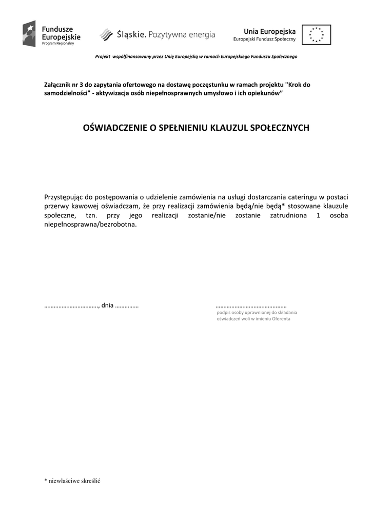 Projekt współfinansowany przez Unię Europejską w ramach Europejskiego Funduszu Społecznego Załącznik nr 3 do zapytania ofertowego na dostawę poczęstunku w ramach projektu "Krok do samodzielności" - aktywizacja osób niepełnosprawnych umysłowo i ich opiekunów” OŚWIADCZENIE O SPEŁNIENIU KLAUZUL SPOŁECZNYCH Przystępując do postępowania o udzielenie zamówienia na usługi dostarczania cateringu w postaci przerwy kawowej oświadczam, że przy realizacji zamówienia będą/nie będą* stosowane klauzule społeczne, tzn. przy jego realizacji zostanie/nie zostanie zatrudniona 1 osoba niepełnosprawna/bezrobotna. ……………………………., dnia …………… ……………………………………… podpis osoby uprawnionej do składania oświadczeń woli w imieniu Oferenta * niewłaściwe skreślić