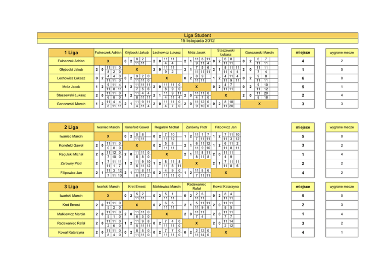Liga Student 15 listopada 2012 1 Liga Fulneczek Adrian Głębocki Jakub Lechowicz Łukasz X 8 2 2 11 11 11 11 0 4 4 11 11 0 9 2 Fulneczek Adrian Głębocki Jakub Lechowicz Łukasz 2 0 0 2 Mróz Jacek 1 2 Staszewski Łukasz 2 0 Ganczarski Marcin 1 2 11 8 4 11 9 11 11 6 11 8 0 11 2 4 11 11 8 11 8 4 11 0 0 0 0 4 11 0 0 4 11 2 Liga Iwaniec Marcin Iwaniec Marcin X Konefeld Gaweł 2 0 Regulski Michał 2 0 Zarówny Piotr 2 1 Filipowicz Jan 2 1 11 0 11 7 7 11 11 7 Iwański Marcin Iwański Marcin X 2 Małkiewicz Marcin 2 Radawaniec Rafał 2 Kowal Katarzyna 2 11 5 11 0 5 11 0 2 11 0 8 0 0 2 1 2 2 0 0 0 0 0 0 0 0 1 9 11 11 7 11 8 11 4 2 2 11 11 5 4 11 9 11 0 0 11 2 6 4 2 11 11 2 4 Konefeld Gaweł 2 0 8 11 11 X 11 0 5 11 2 6 11 1 6 2 5 2 11 11 X 2 1 0 11 0 6 11 2 5 8 2 11 0 0 0 10 1 12 11 0 2 2 X 0 11 11 0 0 8 9 0 11 9 11 1 2 4 11 4 11 11 0 0 2 4 7 0 7 10 11 12 5 8 2 11 11 2 1 2 X 0 2 8 11 8 11 8 11 4 9 0 2 1 11 11 0 0 0 8 0 11 0 0 0 5 1 11 11 6 5 2 11 11 7 4 11 11 7 7 2 11 11 2 2 2 0 0 0 0 4 2 1 5 6 0 5 1 2 4 3 3 miejsce wygrane mecze 5 0 3 2 1 4 2 2 X 4 2 Kowal Katarzyna miejsce wygrane mecze 5 0 2 3 1 4 3 2 4 1 1 11 4 11 0 9 0 0 11 7 12 10 0 0 0 0 11 7 6 1 11 11 1 8 2 1 11 11 9 8 11 X 0 X 0 8 18 2 11 20 2 7 11 6 2 11 11 0 4 7 1 11 2 11 8 6 2 7 11 11 2 11 5 1 11 11 0 7 6 0 11 11 11 2 9 8 11 2 4 X 2 2 2 12 0 2 11 14 0 8 11 11 0 8 11 0 7 11 0 2 2 X 11 3 11 8 11 9 11 8 4 11 11 5 11 7 14 12 Ganczarski Marcin 0 2 2 0 0 2 0 2 2 0 6 11 11 7 9 11 9 11 11 8 X Filipowicz Jan 7 1 11 12 1 10 11 2 8 Radawaniec Rafał 0 X wygrane mecze 11 0 4 6 2 11 X 2 2 8 11 5 11 9 11 Zarówny Piotr Małkiewicz Marcin 0 11 5 9 11 5 11 2 Regulski Michał 0 11 8 9 11 8 11 Kret Ernest 0 11 2 11 1 11 6 11 4 2 1 0 0 0 2 0 11 1 7 12 2 10 3 Liga Kret Ernest X 0 11 8 12 10 11 1 3 11 2 11 1 9 7 1 11 8 2 11 Staszewski Łukasz 6 8 2 11 11 8 11 11 1 11 4 4 4 11 4 2 11 9 11 4 7 2 11 11 miejsce Mróz Jacek 10 12 2 11 11 6 7 11 11 4 8 11 10 12 20 18