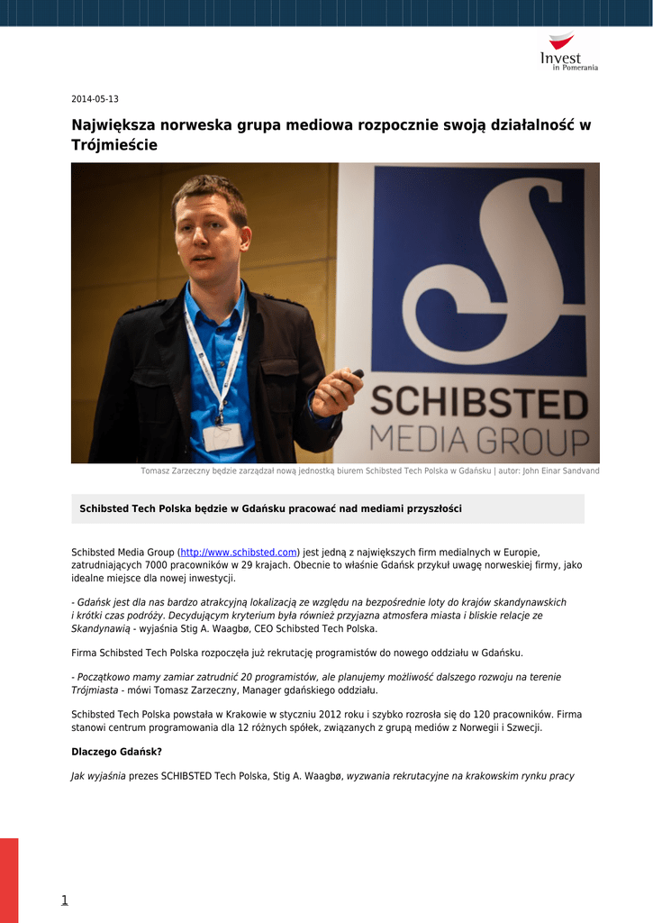 2014-05-13 Największa norweska grupa mediowa rozpocznie swoją działalność w Trójmieście Tomasz Zarzeczny będzie zarządzał nową jednostką biurem Schibsted Tech Polska w Gdańsku | autor: John Einar Sandvand Schibsted Tech Polska będzie w Gdańsku pracować nad mediami przyszłości Schibsted Media Group (http://www.schibsted.com) jest jedną z największych firm medialnych w Europie, zatrudniających 7000 pracowników w 29 krajach. Obecnie to właśnie Gdańsk przykuł uwagę norweskiej firmy, jako idealne miejsce dla nowej inwestycji. - Gdańsk jest dla nas bardzo atrakcyjną lokalizacją ze względu na bezpośrednie loty do krajów skandynawskich i krótki czas podróży. Decydującym kryterium była również przyjazna atmosfera miasta i bliskie relacje ze Skandynawią - wyjaśnia Stig A. Waagbø, CEO Schibsted Tech Polska. Firma Schibsted Tech Polska rozpoczęła już rekrutację programistów do nowego oddziału w Gdańsku. - Początkowo mamy zamiar zatrudnić 20 programistów, ale planujemy możliwość dalszego rozwoju na terenie Trójmiasta - mówi Tomasz Zarzeczny, Manager gdańskiego oddziału. Schibsted Tech Polska powstała w Krakowie w styczniu 2012 roku i szybko rozrosła się do 120 pracowników. Firma stanowi centrum programowania dla 12 różnych spółek, związanych z grupą mediów z Norwegii i Szwecji. Dlaczego Gdańsk? Jak wyjaśnia prezes SCHIBSTED Tech Polska, Stig A. Waagbø, wyzwania rekrutacyjne na krakowskim rynku pracy 1 spowodowały podjęcie decyzji o stworzeniu nowego oddziału w Gdańsku. Ma on również nadzieję, że rekrutacja na dwóch rynkach pozwoli firmie szybciej sie rozwijać. - Inwestycja firmy Schibsted to potwierdzenie, że Gdańsk jest silnym europejskim ośrodkiem IT, który przyciąga firmy szukające ambitnych i dobrze wykwalifikowanych pracowników. Obecność w Gdańsku kolejnej firmy ze Skandynawii wzmacnia współpracę z tym ważnym dla nas obszarem Europy” – mówi Paweł Adamowicz, Prezydent Miasta Gdańska. Programiści w Gdańsku będą pracować dla różnych firm z Schibsted Media Group. W pierwszym etapie działalności będą pomagać w realizacji krótkoterminowych projektów rozwojowych. Strategiczny krok Schibsted jest właścicielem głównych wydań norweskich i szwedzkich gazet, takich jak VG i Aftenposten (Norwegia) i Aftonbladet (Szwecja). Obecnie wszystkie domy mediowe mają własne zespoły rozwojowe w Schibsted Tech Polska. Firma dostarcza rozwiązania oparte o najnowsze technologie webowe, mobilne i smartTV, wykorzystując lekkie metodyki tworzenia oprogramowania. Według Waagbø, ustanowienie siedziby w Gdańsku jest "historycznym krokiem" dla Schibsted Tech Polska. - Jesteśmy bardzo wdzięczni za wspaniałą pomoc i profesjonalne doradztwo, które otrzymaliśmy od Agencji Rozwoju Pomorza SA oraz InvestGDA, partnerów inicjatywy Invest in Pomerania, w trakcie wyboru Gdańska na nowy oddział firmy - mówi Stig A. Waagbø. Skandynawski styl pracy - Centrum programistyczne firmy Schibsted Polska będzie ciekawym elementem Pomorskiego rynku IT. Najnowsze technologie oraz norweski model pracy na pewno wzbogacą umiejętności i doświadczenie naszych programistów. Zespół Invest in Pomerania będzie nadal aktywnie wspierał Schibsted Polska, aby stworzyć komfortowe warunki do rozwoju firmy na Pomorzu – mówi Łukasz Żelewski, Prezes Agencji Rozwoju Pomorza. Jako firma z kapitałem norweskim, Schibsted Tech Polska promuje skandynawski styl pracy oraz stabilne warunki zatrudnienia. - Nasi pracownicy doceniają także codzienny kontakt z kolegami z krajów skandynawskich i możliwość pracy z najnowszymi technologiami - mówi Stig A. Waagbø. Media przyszłości Schibsted jest również dużym globalnym graczem w mediach internetowych sektora ogłoszeń, posiadającym biura w 28 krajach i będącym właścicielem największych internetowych stron ogłoszeniowych w Norwegi, Szwecji i Francji, a grupa mediowa jest notowana na Giełdzie Papierów Wartościowych w Oslo. Wizją Grupy jest ”Kształtowanie mediów jutra. Dzisiaj”. Schibsted często wymieniany jest także jako najbardziej zaangażowany w poszukiwanie nowych rozwiązań cyfrowych dom mediowy. Sektor ICT w Trójmieście To co wyróżnia sektor ICT/ITO w Trójmieście, to różnorodność kompetencji poszukiwanych przez inwestorów. Na rynku 2 pojawia się wiele ciekawych ofert pracy dla specjalistów o zupełnie różnych profilach. Pozwala to na zrównoważony rozwój tego sektora wśród już obecnych w regionie firm, ale także stwarza bardzo dobre warunki dla rozpoczęcia działalności przez nowych inwestorów. Inwestycja Schibsted Tech Polska wpisuje się w trend rozwoju sektorów strategicznych pomorskiej gospodarki. Tylko w tym roku na pomorskim rynku rozpoczęły nową lub rozszerzyły już prowadzoną działalność cztery firmy z branży ICT – mówi Michał Kacprowicz, Project Manager w Invest in Pomerania. Invest in Pomerania jest regionalną inicjatywą, która w oparciu o zasadę non-profit pomaga inwestorom zagranicznym realizować projekty inwestycyjne na Pomorzu. Inicjatywę tworzą Urząd Marszałkowski Województwa Pomorskiego, miasta: Gdańsk, Gdynia, Słupsk i Sopot, Pomorska Specjalna Strefa Ekonomiczna, Słupska Specjalna Strefa Ekonomiczna, InvestGDA oraz Agencja Rozwoju Pomorza, która koordynuje działania inicjatywy. Więcej informacji Schibsted Tech Polska: http://www.schibsted.pl; Schibsted Media Group: http://www.schibsted.com 3 -