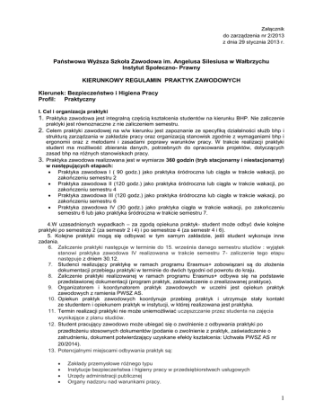 Załącznik do zarządzenia nr 2/2013 z dnia 29 stycznia 2013 r. Państwowa Wyższa Szkoła Zawodowa im. Angelusa Silesiusa w Wałbrzychu Instytut Społeczno- Prawny KIERUNKOWY REGULAMIN PRAKTYK ZAWODOWYCH Kierunek: Bezpieczeństwo i Higiena Pracy Profil: Praktyczny I. Cel i organizacja praktyki 1. Praktyka zawodowa jest integralną częścią kształcenia studentów na kierunku BHP. Nie zaliczenie praktyki jest równoznaczne z nie zaliczeniem semestru. 2. Celem praktyki zawodowej na w/w kierunku jest zapoznanie ze specyfiką działalności służb bhp i strukturą zarządzania w zakładzie pracy oraz organizacją stanowisk zgodnie z wymaganiami bhp i ergonomii oraz z metodami i zasadami poprawy warunków pracy. W trakcie realizacji praktyki student ma możliwość zbierania danych, potrzebnych do opracowania projektów, dotyczących zasad bhp na różnych stanowiskach pracy. 3. Praktyka zawodowa realizowana jest w wymiarze 360 godzin (tryb stacjonarny i niestacjonarny) w następujących etapach: Praktyka zawodowa I ( 90 godz.) jako praktyka śródroczna lub ciągła w trakcie wakacji, po zakończeniu semestru 2 Praktyka zawodowa II (120 godz.) jako praktyka śródroczna lub ciągła w trakcie wakacji, po zakończeniu semestru 4 Praktyka zawodowa III (120 godz.) jako praktyka śródroczna lub ciągła w trakcie wakacji, po zakończeniu semestru 6 Praktyka zawodowa IV (30 godz.) jako praktyka ciągła w trakcie wakacji, po zakończeniu semestru 6 lub jako praktyka śródroczna w trakcie semestru 7. 4.W uzasadnionych wypadkach – za zgodą opiekuna praktyk- student może odbyć dwie kolejne praktyki po semestrze 2 (za semestr 2 i 4) i po semestrze 4 (za semestr 4 i 6). 5. Kolejne praktyki mogą się odbywać w tym samym zakładzie, jeśli student wykonuje inne zadania. 6. Zaliczenie praktyki następuje w terminie do 15. września danego semestru studiów : wyjątek stanowi praktyka zawodowa IV realizowana w trakcie semestru 7- zaliczenie tego etapu następuje z dniem 30.12. 7. Studenci realizujący praktykę w ramach programu Erasmus+ zobowiązani są do złożenia dokumentacji przebiegu praktyki w terminie do dwóch tygodni od powrotu do kraju. 8. Zaliczenie praktyki realizowanej w ramach programu Erasmus+ odbywa się na podstawie przedstawionej dokumentacji (program praktyk, zaświadczenie o zrealizowanej praktyce). 9. Organizatorem i koordynatorem praktyk zawodowych w uczelni jest opiekun praktyk zawodowych z ramienia PWSZ AS. 10. Opiekun praktyk zawodowych koordynuje przebieg praktyk i utrzymuje stały kontakt ze studentem i opiekunem praktyk w instytucji, w której realizowana jest praktyka. 11. Termin realizacji praktyki nie może uniemożliwiać uczęszczanie przez studenta na zajęcia wynikające z planu studiów. 12. Student pracujący zawodowo może ubiegać się o zwolnienie z odbywania praktyki po przedłożeniu stosownych dokumentów (podanie o zwolnienie z praktyk, zaświadczenie o zatrudnieniu, dokument potwierdzający uzyskane efekty kształcenia: Uchwała PWSZ AS nr 20/2014). 13. Potencjalnymi miejscami odbywania praktyk są: Zakłady przemysłowe różnego typu Instytucje bezpieczeństwa i higieny pracy w przedsiębiorstwach usługowych Urzędy administracji publicznej Organy nadzoru nad warunkami pracy. 1 14. Student sam wybiera instytucję, w której odbędzie praktykę, a w razie trudności z miejscem odbywania praktyk, zgłasza się do Uczelnianego Opiekuna Praktyk Zawodowych PWSZ. 15. Każdy student przed rozpoczęciem praktyki powinien znać jej program oraz zadania szczegółowe, które w trakcie jej trwania zobowiązany jest wykonać. II. Zakładane efekty kształcenia Opis zakładanych efektów kształcenia i metody ich weryfikacji Zakładane efekty kształcenia Wiedza: P_W01 student zna strukturę organizacyjną i zasady funkcjonowania przedsiębiorstwa, w którym odbywa praktykę P_W02 rozumie specyfikę zadań dotyczących bhp, realizowanych w konkretnym zakładzie/ przedsiębiorstwie Umiejętności: P_U01- student wykonuje polecenia zgodnie z obowiązującymi w zakładzie pracy zasadami P_U02- potrafi opisać środowisko i organizację pracy ze szczególnym uwzględnieniem przepisów bhp P_U03 wykorzystuje nabytą wiedzę teoretyczną do organizacji bezpiecznych miejsc pracy P_U04 przygotowuje warsztat pracy w celu wykonania prostego zadania badawczego (Praktyka IV) Kompetencje: P_K01- student jest świadomy przepisów regulujących obowiązki na stanowisku pracy i przepisów BHP oraz odpowiedzialności za ich nieprzestrzeganie P_K02- wykazuje się dobrą organizacją pracy własnej i zespołowej P_K03 jest odpowiedzialny za powierzone mu zadania Odniesienie do kierunkowych efektów kształcenia Metody weryfikacji K_W04 Ocena opiekuna w instytucji + Raport z przebiegu praktyki K_W08 K_U13 K_U01 K_U13 Dziennik praktyk + Raport z przebiegu praktyki + Ocena opiekuna w instytucji K_K05 Ocena opiekuna w instytucji K_K05 K_K03 III. Obowiązki i zadania studenta-praktykanta Obowiązkiem studenta jest: zapoznanie się ze strukturą organizacyjną zakładu pracy; zapoznanie się z regulacjami prawnymi/ przepisami obowiązującymi w zakładzie pracy; poznanie przepisów BHP obowiązujących w zakładzie pracy i na poszczególnych stanowiskach; zapoznanie się z obiegiem dokumentacji w zakładzie pracy; zapoznanie się z zasadami tworzenia dokumentacji w zakładzie pracy; dokładne poznanie dokonywanych w zakładzie pracy czynności z zakresu bhp sporządzanie projektów dokumentów stosowanych w zakładzie pracy przygotowanie i prowadzenie dokumentacji przebiegu praktyki zawodowej Szczegółowy opis zadań studenta zawiera Program Praktyk dla kierunku BHP 2 IV. Zadania opiekuna w instytucji, w której odbywa się praktyka Do zadań opiekuna praktyki w miejscu jej realizacji należy: obserwacja zachowania studenta w czasie pobytu na praktyce (m.in. punktualność, aktywność, kultura osobista, zainteresowanie pracą, umiejętność nawiązywania kontaktów, praca w ze