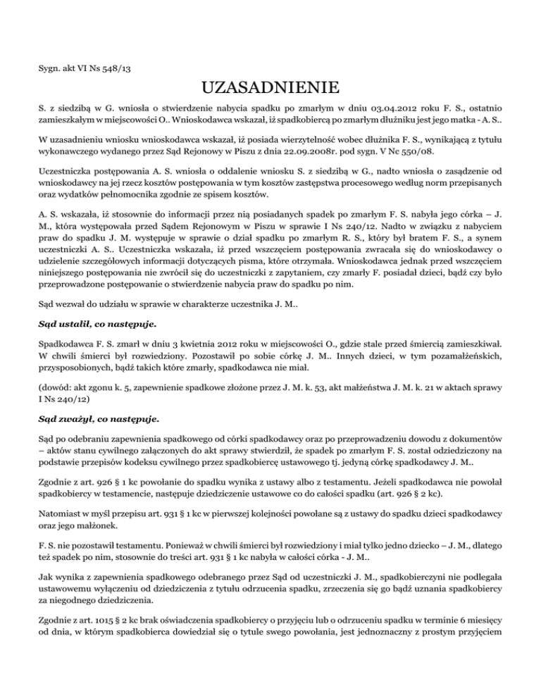 Sygn. akt VI Ns 548/13 UZASADNIENIE S. z siedzibą w G. wniosła o stwierdzenie nabycia spadku po zmarłym w dniu 03.04.2012 roku F. S., ostatnio zamieszkałym w miejscowości O.. Wnioskodawca wskazał, iż spadkobiercą po zmarłym dłużniku jest jego matka - A. S.. W uzasadnieniu wniosku wnioskodawca wskazał, iż posiada wierzytelność wobec dłużnika F. S., wynikającą z tytułu wykonawczego wydanego przez Sąd Rejonowy w Piszu z dnia 22.09.2008r. pod sygn. V Nc 550/08. Uczestniczka postępowania A. S. wniosła o oddalenie wniosku S. z siedzibą w G., nadto wniosła o zasądzenie od wnioskodawcy na jej rzecz kosztów postępowania w tym kosztów zastępstwa procesowego według norm przepisanych oraz wydatków pełnomocnika zgodnie ze spisem kosztów. A. S. wskazała, iż stosownie do informacji przez nią posiadanych spadek po zmarłym F. S. nabyła jego córka – J. M., która występowała przed Sądem Rejonowym w Piszu w sprawie I Ns 240/12. Nadto w związku z nabyciem praw do spadku J. M. występuje w sprawie o dział spadku po zmarłym R. S., który był bratem F. S., a synem uczestniczki A. S.. Uczestniczka wskazała, iż przed wszczęciem postępowania zwracała się do wnioskodawcy o udzielenie szczegółowych informacji dotyczących pisma, które otrzymała. Wnioskodawca jednak przed wszczęciem niniejszego postępowania nie zwrócił się do uczestniczki z zapytaniem, czy zmarły F. posiadał dzieci, bądź czy było przeprowadzone postępowanie o stwierdzenie nabycia praw do spadku po nim. Sąd wezwał do udziału w sprawie w charakterze uczestnika J. M.. Sąd ustalił, co następuje. Spadkodawca F. S. zmarł w dniu 3 kwietnia 2012 roku w miejscowości O., gdzie stale przed śmiercią zamieszkiwał. W chwili śmierci był rozwiedziony. Pozostawił po sobie córkę J. M.. Innych dzieci, w tym pozamałżeńskich, przysposobionych, bądź takich które zmarły, spadkodawca nie miał. (dowód: akt zgonu k. 5, zapewnienie spadkowe złożone przez J. M. k. 53, akt małżeństwa J. M. k. 21 w aktach sprawy I Ns 240/12) Sąd zważył, co następuje. Sąd po odebraniu zapewnienia spadkowego od córki spadkodawcy oraz po przeprowadzeniu dowodu z dokumentów – aktów stanu cywilnego załączonych do akt sprawy stwierdził, że spadek po zmarłym F. S. został odziedziczony na podstawie przepisów kodeksu cywilnego przez spadkobiercę ustawowego tj. jedyną córkę spadkodawcy J. M.. Zgodnie z art. 926 § 1 kc powołanie do spadku wynika z ustawy albo z testamentu. Jeżeli spadkodawca nie powołał spadkobiercy w testamencie, następuje dziedziczenie ustawowe co do całości spadku (art. 926 § 2 kc). Natomiast w myśl przepisu art. 931 § 1 kc w pierwszej kolejności powołane są z ustawy do spadku dzieci spadkodawcy oraz jego małżonek. F. S. nie pozostawił testamentu. Ponieważ w chwili śmierci był rozwiedziony i miał tylko jedno dziecko – J. M., dlatego też spadek po nim, stosownie do treści art. 931 § 1 kc nabyła w całości córka - J. M.. Jak wynika z zapewnienia spadkowego odebranego przez Sąd od uczestniczki J. M., spadkobierczyni nie podlegała ustawowemu wyłączeniu od dziedziczenia z tytułu odrzucenia spadku, zrzeczenia się go bądź uznania spadkobiercy za niegodnego dziedziczenia. Zgodnie z art. 1015 § 2 kc brak oświadczenia spadkobiercy o przyjęciu lub o odrzuceniu spadku w terminie 6 miesięcy od dnia, w którym spadkobierca dowiedział się o tytule swego powołania, jest jednoznaczny z prostym przyjęciem spadku. Uczestniczka powzięła wiadomość o śmierci ojca, a tym samym o tytule swojego powołania w tym samym dniu, w którym zmarł F. S.. Z uwagi na upływ 6 miesięcznego terminu do złożenia oświadczenia Sąd uznał, iż spadkobierczyni przyjęła spadek wprost. Mając powyższe na uwadze, na podstawie powołanych przepisów, Sąd postanowił jak w punkcie I postanowienia. Orzekając o kosztach postępowania Sąd zasądził od wnioskodawcy S.w G. na rzecz A. S. kwotę 214 zł tytułem zwrotu kosztów postępowania. Wedle zasady wyrażonej w art. 520 § 1 k.p.c. koszty postępowania nieprocesowego nie podlegają rozliczeniu pomiędzy uczestnikami tego postępowania, lecz każdy z uczestników ponosi koszty związane ze swoim udziałem w sprawie (por. postanowienie Sądu Najwyższego z dnia 25 sierpnia 2011 r., II CZ 55/11, LEX nr 949024). Reguła ta doznaje ograniczeń, jeżeli uczestnicy są w rożnym stopniu zainteresowani w wyniku postępowania lub interesy ich są sprzeczne (art. 520 § 2 k.p.c.), a także, gdy interesy uczestników są sprzeczne lub jeżeli uczestnik postępował niesumiennie lub oczywiście niewłaściwie (art. 520 § 3 k.p.c.). W takich przypadkach sąd może stosunkowo rozdzielić obowiązek zwrotu kosztów lub nałożyć go na jednego z uczestników w całości. W niniejszej sprawie podkreślenia wymaga fakt, iż wnioskodawca wskazał jako uczestniczkę postępowania A. S., nie ustalając uprzednio, czy uczestniczka należy do grona spadkobierców po F. S.. Wnioskodawca, pomimo skierowanych do niego przez A. S. wątpliwości, nie zwrócił się do niej z zapytaniem, czy zmarły posiadał dzieci, bądź też czy było przeprowadzone postępowanie o stwierdzenie nabycia spadku po F. S.. Gdyby z zapytaniem takim wnioskodawca wystąpił, okazałoby się, że nie ma potrzeby wskazywania jako uczestnika postępowania A. S., a sama uczestniczka nie poniosłaby kosztów związanych z jej udziałem w postępowaniu. Z tego względu Sąd uznał, uczestniczce należy się zwrot kosztów i orzekł jak w punkcie II postanowienia. O wysokości opłaty za czynności adwokata z tytułu zastępstwa prawnego Sąd rozstrzygnął na podstawie § 2 ust. 1 i 2 rozporządzenia Ministra Sprawiedliwości z dnia 28 września 2002 roku w sprawie opłat za czynności adwokackie oraz ponoszenia przez Skarb Państwa kosztów pomocy prawnej udzielonej przed radcę prawnego ustanowionego z urzędu. Sąd wziął pod uwagę niezbędny nakła