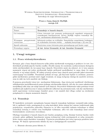 Wydział Elektrotechniki, Informatyki i Telekomunikacji Instytut Informatyki i Elektroniki Instrukcja do zajęć laboratoryjnych Praca z bazą danych MySQL wersja 2.0 Nr ćwiczenia: 12 Temat: Transakcje w bazach danych Cel ćwiczenia: Celem ćwiczenia jest poznanie podstawowych zagadnień związanych transakcjami bazodanowymi. Serwer MySQL wspiera transakcje dla tzw. mechanizmu składowania InnoDB. Wymagane przygotowanie teoretyczne: Informacje podane na wykładzie. Samodzielne uzupełnienie brakującej do wykonania ćwiczenia wiedzy — najlepiej korzystając z [3] oraz [4]. Sposób zaliczenia: Pozytywna ocena ćwiczenia przez prowadzącego pod koniec zajęć. Prowadzący zajęcia: dr inż. Artur Gramacki, dr inż. Jarosław Gramacki 1. Uwagi wstępne 1.1. Praca wieloużytkownikowa Sytuacje, gdy z bazy danych korzysta tylko jeden użytkownik występują w praktyce (w tzw. środowiskach produkcyjnych) bardzo rzadko. Zwykle mamy do czynienia z jednoczesnym dostępem wielu użytkowników do tej samej bazy danych. Oczywiście może się zdarzyć, że w tym samym momencie więcej niż jeden użytkownik będzie próbował modyfikować te same dane (te same rekordy w tej samej tabeli). W takiej sytuacji serwer bazy danych musi potrafić jakoś sensownie rozstrzygnąć ten konflikt. Niezależnie jednak od tego, jak fizycznie będzie to zrobione, poszczególni użytkownicy powinni mieć ciągle wrażenie, że mają wyłączny dostęp do zasobów serwera, oraz że nikt im tych zasobów nie blokuje. Z pomocą przychodzi tutaj tzw. mechanizm blokowania. Jego istotą jest możliwość chwilowego zablokowania modyfikowanych przez jednego użytkownika danych, tak aby do czasu zakończenia modyfikacji nikt inny nie mógł zmienić tych danych. Oczywiście blokowanie takie powinno trwać możliwie jak najkrócej oraz w miarę możliwości odbywać się automatycznie, tak aby użytkownicy mieli zapewniony wystarczający komfort pracy i nie musieli zbyt długo czekać na zwolnienie pożądanych w danym momencie danych. 1.2. Transakcje W kontekście systemów zarządzania bazami danych transakcję będziemy rozumieli jako jedną, lub w ogólności wiele, powiązanych ze sobą instrukcji, które muszą być zawsze traktowanie jako pojedyncza, niepodzielna jednostka. Oznacza to, że albo wszystkie zadania wchodzące w skład transakcji zostaną w całości oraz bezbłędnie wykonane, albo też cała transakcja musi zostać bezwarunkowo anulowana (wycofana). Obsługa transakcji w bazach danych jest bardzo pożądaną cechą. Istnieje bowiem bardzo wiele sytuacji, gdzie aplikacje bazodanowe muszą wykonywać wiele powiązanych ze sobą czynności, które razem mają charakter transakcji. Typowym przykładem jest tutaj operacja przelewu bankowego. W dużym uproszczeniu składa się ona z następujących czynności: 1. Złożenie zlecenia przez klienta A. Przygotował: dr inż. Artur Gramacki 1 2. Sprawdzenie stanu konta klienta A. 3. Zablokowanie kwoty przelewu na koncie klienta A. 4. Przesłanie kwoty przelewu na konto klienta B. 5. Powiększenie o kwotę przelewu salda rachunku klienta B. 6. Pomniejszenie o kwotę przelewu salda rachunku klienta A. Oczywiście nikomu nie trzeba tłumaczyć jakie konsekwencje grożą, gdy z różnych powodów (np. awaria) wykonane zostaną tylko niektóre z powyższych czynności a pozostałych nie uda się wykonać. Nie może mieć również miejsca sytuacja, gdy np. w chwilę po wykonaniu czynności z punktu 3 (ale przed zakończeniem całości operacji) nastąpi wypłata z konta klienta A kwoty, która w połączeniu z kwotą właśnie co wykonywanego przelewu, wprowadza debet na koncie. Z powyższego wynika jasno, że pojęcie transakcji jest bardzo silnie związane z mechanizmem blokowania w kontekście pracy wieloużytkownikowej. 1.3. Mechanizmy składowania Aby móc zapewnić obsługę omówionych powyżej mechanizmów, serwer bazodanowy musi posiadać odpowiednie ku temu możliwości. W MySQL-u rozwiązano to w taki sposób, że może on obsługiwać różne tzw. mechanizmy składowania (ang. storage engines). Dwa najbardziej popularne to MyISAM oraz InnoDB 1 . Pierwszy na dzień dzisiejszy (marzec 2006) nie obsługuje transakcji, drugi natomiast zawiera taką obsługą. Ponadto mechanizm InnoDB obsługuje klucze obce, czego jak na razie nie potrafi mechanizm MyISAM. Mechanizmy nie wspierające transakcji, mimo iż pozornie wydają się mniej atrakcyjne, są nadal bardzo często używane. Ich niewątpliwą zaletą jest większa szybkość działania. Trzeba bowiem pamiętać, że obsługa transakcji wymaga od bazy danych większego zaangażowania zasobów sprzętowych i w związku z tym działają one po prostu wolniej. Zmiany w szybkości działania mogą być jednak zauważone w zasadzie tylko wówczas, gdy przechowujemy naprawdę duże ilości danych (liczone w dziesiątkach czy setkach tysięcy rekordów). Przy mniejszych ilościach danych w zasadzie trudno jest dostrzec jakieś istotniejsze różnice w szybkości działania. Dlatego też sugerujemy, aby w pierwszej kolejności spróbować użyć mechanizmu InnoDB, a dopiero gdy okaże się on zbyt wolny, migrować do mechanizmu nietransakcyjnego. Niewątpliwą zaletą InnoDB jest również obsługa kluczy obcych. Jest to funkcjonalność na tyle atrakcyjna, że często może warto rozważyć stosowanie tego mechanizmy nawet wówczas, gdy jest on nieco wolniejszy od nieobsługującego kluczy obcych mechanizmu MyISAM 2 . 2. Mechanizm składowania MyISAM Mechanizm MyISAM nie wspiera transakcji, w zamian natomiast oferuje nieco większą szybkość działania. Poszczególne instrukcje traktowane są jak transakcje, więc nie ma problemu, gdy np. użytkownik aktualizuje kilka wierszy w tabeli i w tym samym czasie jakiś inny użytkownik robi to samo. Serwer MySQL po prostu automatycznie blokuje wymagane zasoby. Nie można jednak grupować w transakcje kilku instrukcji. 1 Pozostałe to: ISAM, BerkeleyDB, MERGE, HEAP, AR