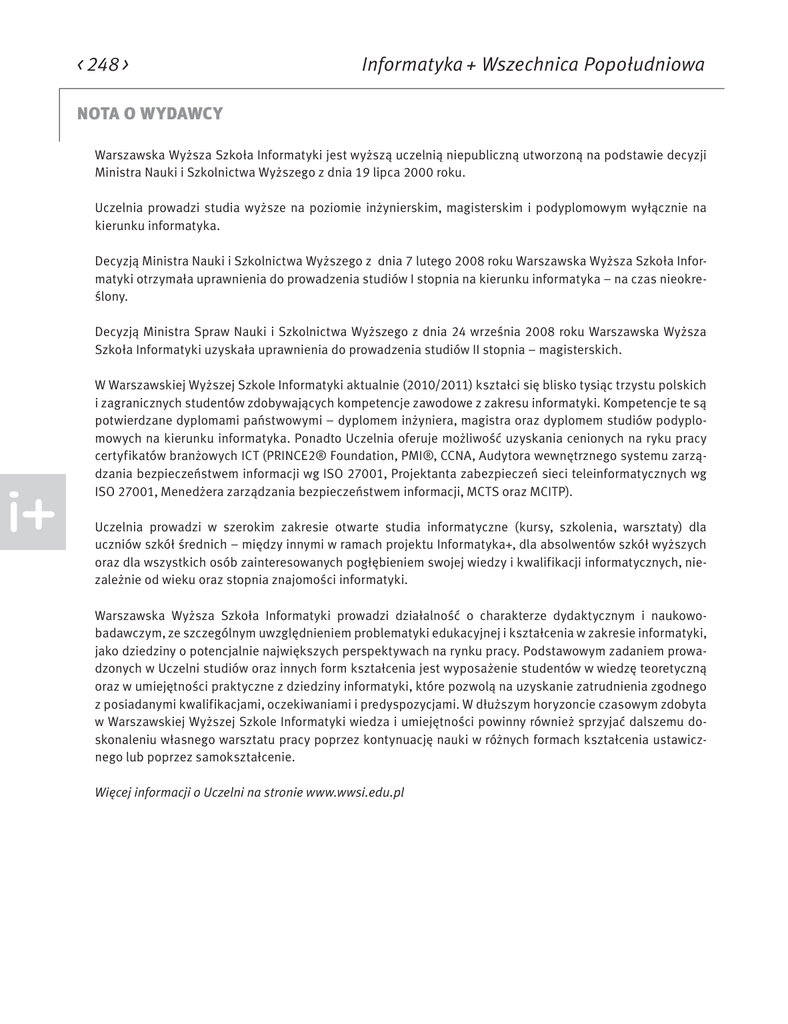 < 248 > Informatyka + Wszechnica Popołudniowa Nota o Wydawcy Warszawska Wyższa Szkoła Informatyki jest wyższą uczelnią niepubliczną utworzoną na podstawie decyzji Ministra Nauki i Szkolnictwa Wyższego z dnia 19 lipca 2000 roku. Uczelnia prowadzi studia wyższe na poziomie inżynierskim, magisterskim i podyplomowym wyłącznie na kierunku informatyka. Decyzją Ministra Nauki i Szkolnictwa Wyższego z dnia 7 lutego 2008 roku Warszawska Wyższa Szkoła Informatyki otrzymała uprawnienia do prowadzenia studiów I stopnia na kierunku informatyka – na czas nieokreślony. Decyzją Ministra Spraw Nauki i Szkolnictwa Wyższego z dnia 24 września 2008 roku Warszawska Wyższa Szkoła Informatyki uzyskała uprawnienia do prowadzenia studiów II stopnia – magisterskich. W Warszawskiej Wyższej Szkole Informatyki aktualnie (2010/2011) kształci się blisko tysiąc trzystu polskich i zagranicznych studentów zdobywających kompetencje zawodowe z zakresu informatyki. Kompetencje te są potwierdzane dyplomami państwowymi – dyplomem inżyniera, magistra oraz dyplomem studiów podyplomowych na kierunku informatyka. Ponadto Uczelnia oferuje możliwość uzyskania cenionych na ryku pracy certyfikatów branżowych ICT (PRINCE2® Foundation, PMI®, CCNA, Audytora wewnętrznego systemu zarządzania bezpieczeństwem informacji wg ISO 27001, Projektanta zabezpieczeń sieci teleinformatycznych wg ISO 27001, Menedżera zarządzania bezpieczeństwem informacji, MCTS oraz MCITP). Uczelnia prowadzi w szerokim zakresie otwarte studia informatyczne (kursy, szkolenia, warsztaty) dla uczniów szkół średnich – między innymi w ramach projektu Informatyka+, dla absolwentów szkół wyższych oraz dla wszystkich osób zainteresowanych pogłębieniem swojej wiedzy i kwalifikacji informatycznych, niezależnie od wieku oraz stopnia znajomości informatyki. Warszawska Wyższa Szkoła Informatyki prowadzi działalność o charakterze dydaktycznym i naukowobadawczym, ze szczególnym uwzględnieniem problematyki edukacyjnej i kształcenia w zakresie informatyki, jako dziedziny o potencjalnie największych perspektywach na rynku pracy. Podstawowym zadaniem prowadzonych w Uczelni studiów oraz innych form kształcenia jest wyposażenie studentów w wiedzę teoretyczną oraz w umiejętności praktyczne z dziedziny informatyki, które pozwolą na uzyskanie zatrudnienia zgodnego z posiadanymi kwalifikacjami, oczekiwaniami i predyspozycjami. W dłuższym horyzoncie czasowym zdobyta w Warszawskiej Wyższej Szkole Informatyki wiedza i umiejętności powinny również sprzyjać dalszemu doskonaleniu własnego warsztatu pracy poprzez kontynuację nauki w różnych formach kształcenia ustawicznego lub poprzez samokształcenie. Więcej informacji o Uczelni na stronie www.wwsi.edu.pl