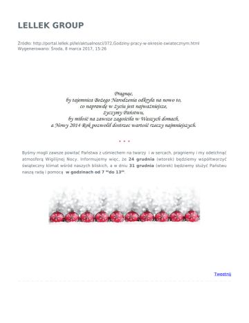 LELLEK GROUP Źródło: http://portal.lellek.pl/lel/aktualnosci/372,Godziny-pracy-w-okresie-swiatecznym.html Wygenerowano: Środa, 8 marca 2017, 15:26 * * * Byśmy mogli zawsze powitać Państwa z uśmiechem na twarzy i w sercach, pragniemy i my odetchnąć atmosferą Wigilijnej Nocy. Informujemy więc, że 24 grudnia (wtorek) będziemy współtworzyć świąteczny klimat wśród naszych bliskich, a w dniu 31 grudnia (wtorek) będziemy służyć Państwu naszą radą i pomocą w godzinach od 7 do 1300. 00 Tweetnij