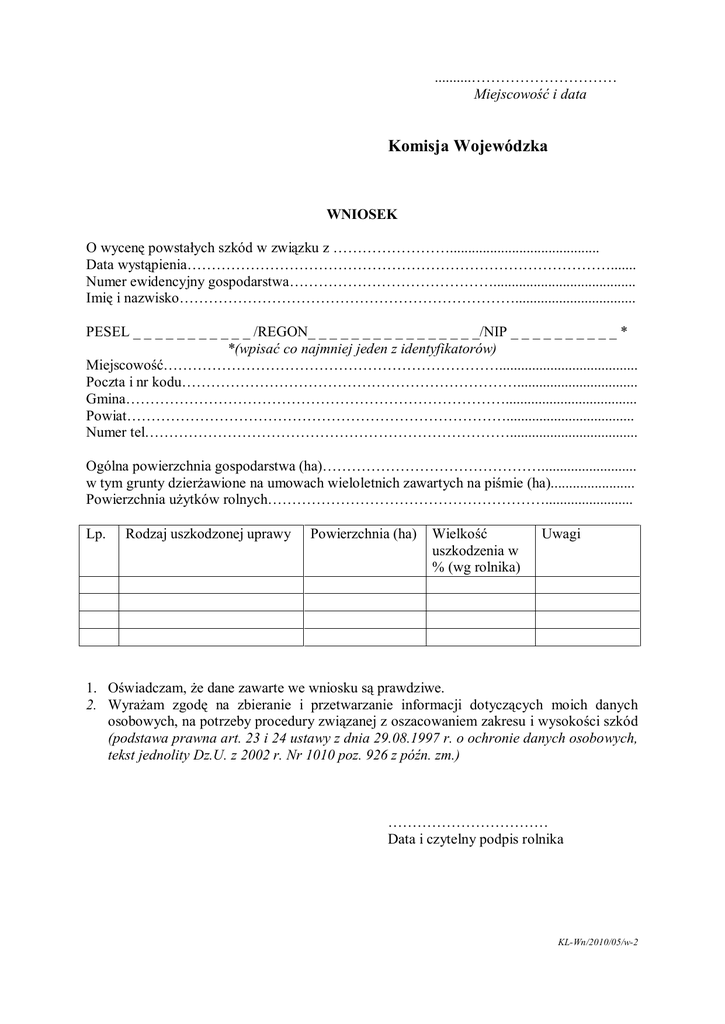..........………………………… Miejscowo i data Komisja Wojewódzka WNIOSEK O wycen powsta ych szkód w zwi zku z ……………………......................................... Data wyst pienia……………………………………………………………………………....... Numer ewidencyjny gospodarstwa……………………………………....................................... Imi i nazwisko……………………………………………………………................................. PESEL _ _ _ _ _ _ _ _ _ _ _ /REGON_ _ _ _ _ _ _ _ _ _ _ _ _ _ _ _/NIP _ _ _ _ _ _ _ _ _ _ * *(wpisa co najmniej jeden z identyfikatorów) Miejscowo ……………………………………………………………...................................... Poczta i nr kodu……………………………………………………………................................. Gmina…………………………………………………………………….................................... Powiat……………………………………………………………………................................... Numer tel…………………………………………………………………................................... Ogólna powierzchnia gospodarstwa (ha)……………………………………….......................... w tym grunty dzier awione na umowach wieloletnich zawartych na pi mie (ha)....................... Powierzchnia u ytków rolnych…………………………………………………........................ Lp. Rodzaj uszkodzonej uprawy Powierzchnia (ha) Wielko uszkodzenia w % (wg rolnika) Uwagi 1. wiadczam, e dane zawarte we wniosku s prawdziwe. 2. Wyra am zgod na zbieranie i przetwarzanie informacji dotycz cych moich danych osobowych, na potrzeby procedury zwi zanej z oszacowaniem zakresu i wysoko ci szkód (podstawa prawna art. 23 i 24 ustawy z dnia 29.08.1997 r. o ochronie danych osobowych, tekst jednolity Dz.U. z 2002 r. Nr 1010 poz. 926 z pó n. zm.) …………………………… Data i czytelny podpis rolnika KL-Wn/2010/05/w-2