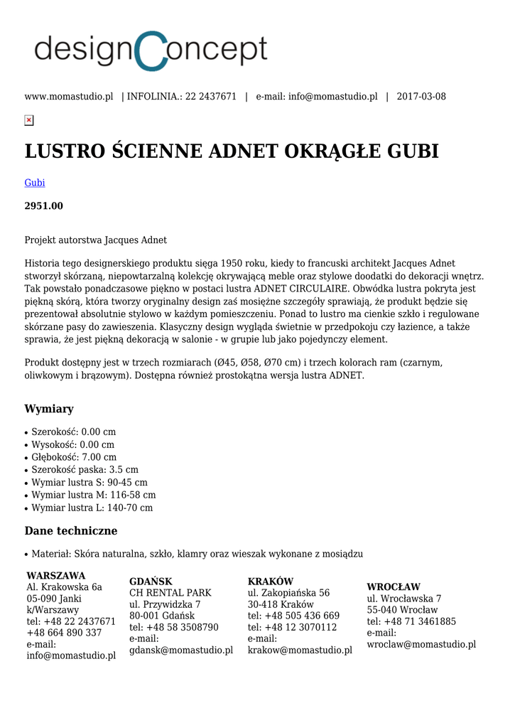 www.momastudio.pl | INFOLINIA.: 22 2437671 | e-mail: [email protected] | 2017-03-08 LUSTRO ŚCIENNE ADNET OKRĄGŁE GUBI Gubi 2951.00 Projekt autorstwa Jacques Adnet Historia tego designerskiego produktu sięga 1950 roku, kiedy to francuski architekt Jacques Adnet stworzył skórzaną, niepowtarzalną kolekcję okrywającą meble oraz stylowe doodatki do dekoracji wnętrz. Tak powstało ponadczasowe piękno w postaci lustra ADNET CIRCULAIRE. Obwódka lustra pokryta jest piękną skórą, która tworzy oryginalny design zaś mosiężne szczegóły sprawiają, że produkt będzie się prezentował absolutnie stylowo w każdym pomieszczeniu. Ponad to lustro ma cienkie szkło i regulowane skórzane pasy do zawieszenia. Klasyczny design wygląda świetnie w przedpokoju czy łazience, a także sprawia, że jest piękną dekoracją w salonie - w grupie lub jako pojedynczy element. Produkt dostępny jest w trzech rozmiarach (Ø45, Ø58, Ø70 cm) i trzech kolorach ram (czarnym, oliwkowym i brązowym). Dostępna również prostokątna wersja lustra ADNET. Wymiary ● ● ● ● ● ● ● Szerokość: 0.00 cm Wysokość: 0.00 cm Głębokość: 7.00 cm Szerokość paska: 3.5 cm Wymiar lustra S: 90-45 cm Wymiar lustra M: 116-58 cm Wymiar lustra L: 140-70 cm Dane techniczne ● Materiał: Skóra naturalna, szkło, klamry oraz wieszak wykonane z mosiądzu WARSZAWA Al. Krakowska 6a 05-090 Janki k/Warszawy tel: +48 22 2437671 +48 664 890 337 e-mail: [email protected] GDAŃSK CH RENTAL PARK ul. Przywidzka 7 80-001 Gdańsk tel: +48 58 3508790 e-mail: [email protected] KRAKÓW ul. Zakopiańska 56 30-418 Kraków tel: +48 505 436 669 tel: +48 12 3070112 e-mail: [email protected] WROCŁAW ul. Wrocławska 7 55-040 Wrocław tel: +48 71 3461885 e-mail: [email protected]