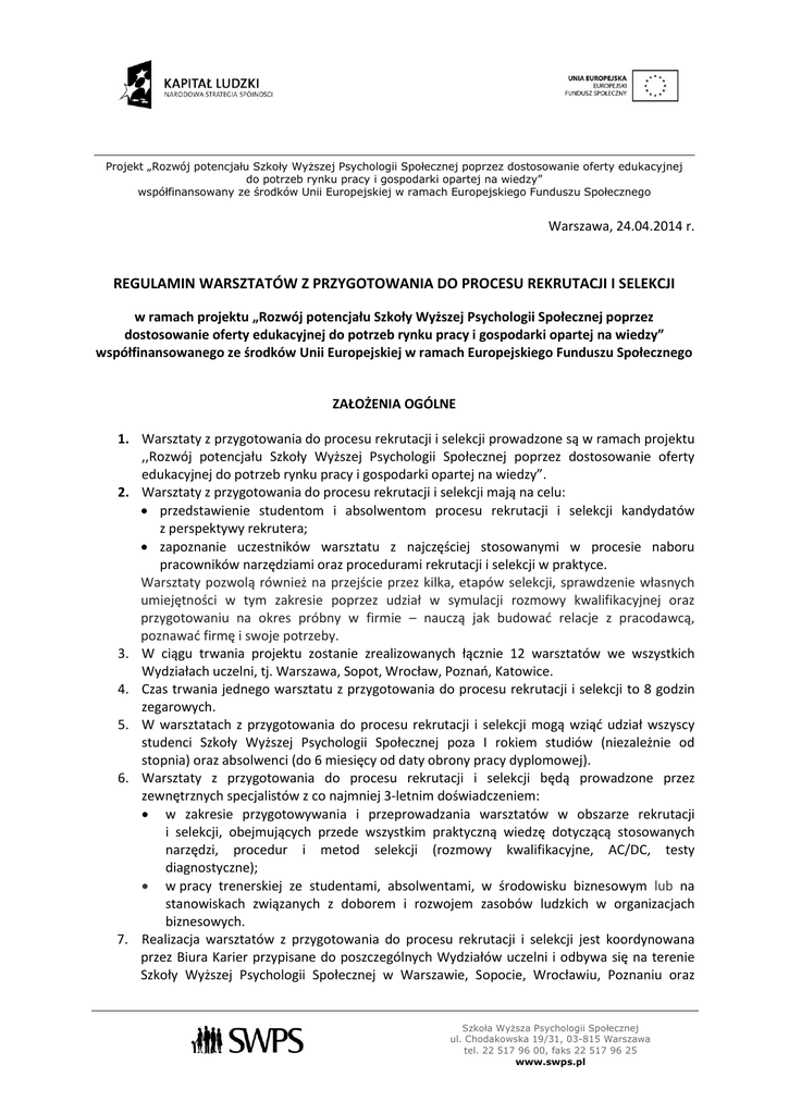 Projekt „Rozwój potencjału Szkoły Wyższej Psychologii Społecznej poprzez dostosowanie oferty edukacyjnej do potrzeb rynku pracy i gospodarki opartej na wiedzy” współfinansowany ze środków Unii Europejskiej w ramach Europejskiego Funduszu Społecznego Warszawa, 24.04.2014 r. REGULAMIN WARSZTATÓW Z PRZYGOTOWANIA DO PROCESU REKRUTACJI I SELEKCJI w ramach projektu „Rozwój potencjału Szkoły Wyższej Psychologii Społecznej poprzez dostosowanie oferty edukacyjnej do potrzeb rynku pracy i gospodarki opartej na wiedzy” współfinansowanego ze środków Unii Europejskiej w ramach Europejskiego Funduszu Społecznego ZAŁOŻENIA OGÓLNE 1. Warsztaty z przygotowania do procesu rekrutacji i selekcji prowadzone są w ramach projektu ,,Rozwój potencjału Szkoły Wyższej Psychologii Społecznej poprzez dostosowanie oferty edukacyjnej do potrzeb rynku pracy i gospodarki opartej na wiedzy”. 2. Warsztaty z przygotowania do procesu rekrutacji i selekcji mają na celu: przedstawienie studentom i absolwentom procesu rekrutacji i selekcji kandydatów z perspektywy rekrutera; zapoznanie uczestników warsztatu z najczęściej stosowanymi w procesie naboru pracowników narzędziami oraz procedurami rekrutacji i selekcji w praktyce. Warsztaty pozwolą również na przejście przez kilka, etapów selekcji, sprawdzenie własnych umiejętności w tym zakresie poprzez udział w symulacji rozmowy kwalifikacyjnej oraz przygotowaniu na okres próbny w firmie – nauczą jak budować relacje z pracodawcą, poznawać firmę i swoje potrzeby. 3. W ciągu trwania projektu zostanie zrealizowanych łącznie 12 warsztatów we wszystkich Wydziałach uczelni, tj. Warszawa, Sopot, Wrocław, Poznań, Katowice. 4. Czas trwania jednego warsztatu z przygotowania do procesu rekrutacji i selekcji to 8 godzin zegarowych. 5. W warsztatach z przygotowania do procesu rekrutacji i selekcji mogą wziąć udział wszyscy studenci Szkoły Wyższej Psychologii Społecznej poza I rokiem studiów (niezależnie od stopnia) oraz absolwenci (do 6 miesięcy od daty obrony pracy dyplomowej). 6. Warsztaty z przygotowania do procesu rekrutacji i selekcji będą prowadzone przez zewnętrznych specjalistów z co najmniej 3-letnim doświadczeniem: w zakresie przygotowywania i przeprowadzania warsztatów w obszarze rekrutacji i selekcji, obejmujących przede wszystkim praktyczną wiedzę dotyczącą stosowanych narzędzi, procedur i metod selekcji (rozmowy kwalifikacyjne, AC/DC, testy diagnostyczne); w pracy trenerskiej ze studentami, absolwentami, w środowisku biznesowym lub na stanowiskach związanych z doborem i rozwojem zasobów ludzkich w organizacjach biznesowych. 7. Realizacja warsztatów z przygotowania do procesu rekrutacji i selekcji jest koordynowana przez Biura Karier przypisane do poszczególnych Wydziałów uczelni i odbywa się na terenie Szkoły Wyższej Psychologii Społecznej w Warszawie, Sopocie, Wrocławiu, Poznaniu oraz Szkoła Wyższa Psychologii Społecznej ul. Chodakowska 19/31, 03-815 Warszawa tel. 22 517 96 00, faks 22 517 96 25 www.swps.pl Projekt „Rozwój potencjału Szkoły Wyższej Psychologii Społecznej poprzez dostosowanie oferty edukacyjnej do potrzeb rynku pracy i gospodarki opartej na wiedzy” współfinansowany ze środków Unii Europejskiej w ramach Europejskiego Funduszu Społecznego Katowicach lub w innym miejscu ustalonym wspólnie z trenerem i zaakceptowanym przez Biuro Projektu. ZASADY REKRUTACJI UCZESTNIKÓW 1. Warunkiem zgłoszenia chęci udziału w danej formie wsparcia jest dostarczenie do Biura Karier w wyznaczonym terminie poprawnie wypełnionego formularza zgłoszeniowego. 2. Informacje o terminach naboru zgłoszeń publikowane będą na stronach internetowych uczelni, tj. Wirtualna Uczelnia, strona Biura Karier lub/i strona internetowa projektu. 3. Procedura kwalifikacyjna uczestnika do udziału w warsztatach z przygotowania do procesu rekrutacji i selekcji zakłada przypisanie kandydatowi numeru zgłoszenia oraz sprawdzenie zgodności danych podanych przez kandydata z wymogami proceduralnymi projektu ,,Rozwój potencjału Szkoły Wyższej Psychologii Społecznej poprzez dostosowanie oferty edukacyjnej do potrzeb rynku pracy i gospodarki opartej na wiedzy”, tj. weryfikacja statusu studenta/absolwenta. 4. W naborze decyduje kolejność zgłoszeń kandydatów. 5. Zakwalifikowani do udziału w warsztacie uczestnicy będą informowani o pozytywnym wyniku kwalifikacji drogą elektroniczną i/lub drogą telefoniczną. 6. Zakwalifikowani do udziału w warsztacie uczestnicy mają obowiązek dostarczyć w wyznaczonym terminie do wskazanego Biura Karier komplet następujących dokumentów: a. deklaracja uczestnictwa w projekcie; b. oświadczenie uczestnika o wyrażeniu zgody na przetwarzanie danych osobowych; c. kwestionariusz osobowy; d. kserokopia dowodu osobistego; e. kserokopia legitymacji studenckiej (lub zaświadczenie o ukończeniu studiów). 7. Niedostarczenie kompletu poprawnie wypełnionych dokumentów będzie skutkować skreśleniem z listy kandydatów i umożliwieniem wzięcia udziału w warsztacie kolejnej osobie na liście kandydatów. UCZESTNICTWO W WARSZTATACH Z PRZYGOTOWANIA DO PROCESU REKRUTACJI I SELEKCJI Uczestnik, który został objęty wsparciem, zobowiązany jest do uczestnictwa w zajęciach w określonym w harmonogramie oraz podpisania listy obecności w trakcie realizowanego warsztatu z przygotowania do procesu rekrutacji i selekcji. KONSEKWENCJE REZYGNACJI Z UDZIAŁU W WARSZTATACH Z PRZYGOTOWANIA DO PROCESU REKRUTACJI I SELEKCJI 1. Kandydat, który złożył formularz zgłoszeniowy ma możliwość wycofania swojej chęci uczestnictwa w warsztacie. W tym celu zobowiązany jest poinformować odpowiednie Biuro Szkoła Wyższa Psychologii Społecznej ul. Chodakowska 19/31, 03-815 Warszawa tel. 22 517 96 00, faks 22 517 96 25 www.swps.pl Projekt „Rozwój potencjału Szkoły Wyższej Psychologii Społecznej poprzez dostosowanie oferty edukacyjnej do potrzeb rynku pr