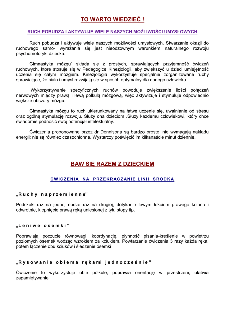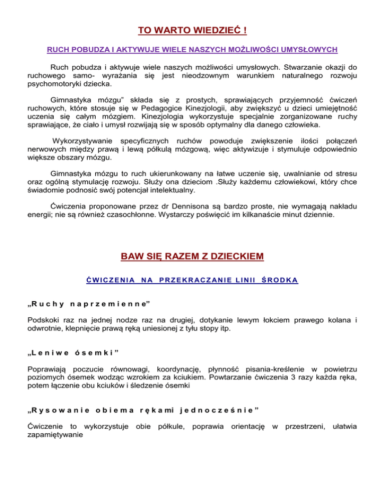 TO WARTO WIEDZIEĆ ! RUCH POBUDZA I AKTYWUJE WIELE NASZYCH MOŻLIWOŚCI UMYSŁOWYCH Ruch pobudza i aktywuje wiele naszych możliwości umysłowych. Stwarzanie okazji do ruchowego samo- wyrażania się jest nieodzownym warunkiem naturalnego rozwoju psychomotoryki dziecka. Gimnastyka mózgu” składa się z prostych, sprawiających przyjemność ćwiczeń ruchowych, które stosuje się w Pedagogice Kinezjologii, aby zwiększyć u dzieci umiejętność uczenia się całym mózgiem. Kinezjologia wykorzystuje specjalnie zorganizowane ruchy sprawiające, że ciało i umysł rozwijają się w sposób optymalny dla danego człowieka. Wykorzystywanie specyficznych ruchów powoduje zwiększenie ilości połączeń nerwowych między prawą i lewą półkulą mózgową, więc aktywizuje i stymuluje odpowiednio większe obszary mózgu. Gimnastyka mózgu to ruch ukierunkowany na łatwe uczenie się, uwalnianie od stresu oraz ogólną stymulację rozwoju. Służy ona dzieciom .Służy każdemu człowiekowi, który chce świadomie podnosić swój potencjał intelektualny. Ćwiczenia proponowane przez dr Dennisona są bardzo proste, nie wymagają nakładu energii; nie są również czasochłonne. Wystarczy poświęcić im kilkanaście minut dziennie. BAW SIĘ RAZEM Z DZIECKIEM Ć WI C Z ENI A N A PR Z E KR AC Z AN I E LI N I I Ś RO D K A „R u c h y n a p r z e m i e n n e” Podskoki raz na jednej nodze raz na drugiej, dotykanie lewym łokciem prawego kolana i odwrotnie, klepnięcie prawą ręką uniesionej z tyłu stopy itp. „L e n i w e ó s e m k i ” Poprawiają poczucie równowagi, koordynację, płynność pisania-kreślenie w powietrzu poziomych ósemek wodząc wzrokiem za kciukiem. Powtarzanie ćwiczenia 3 razy każda ręka, potem łączenie obu kciuków i śledzenie ósemki „R y s o w a n i e o b i e m a r ę k a mi j e d n o c z e ś n i e ” Ćwiczenie to wykorzystuje obie półkule, poprawia orientację w przestrzeni, ułatwia zapamiętywanie Ć WI C Z ENI A EN E RG E TY Z UJ ĄC E „ K a p t u r e k m y ś l i c i e l a” Ćwiczenie pozwala na pełniejszy oddech, a zatem wzrost energii, zwiększenie mocy głosu, rozluźnienie szczęk, języka i mięśni twarzy. Ułatwia ruchy głową, zdolność do obrotu w lewą i prawą stronę. Powoduje wzrost koncentracji i skupienia uwagi. Sposób wykonania Za pomocą kciuka i palca wskazującego odchylamy delikatnie, do tyłu małżowinę uszną powodując jej rozwinięcie. Następnie masując, począwszy od góry, po łuku ucha, przesuwamy palce, kończąc na płatku ucha. Podbródek trzymamy w wygodnym położeniu z wyprostowaną głową. Ćwiczenie należy powtórzyć co najmniej trzy razy. „ Punkty p o z y t y w n e” Ćwiczenie to łagodzi stres i napięcia wywołane przez nietypowe sytuacje, kontakty z ludźmi, wspomnienia, trudności z wykonywaniem zadania. Ułatwia zdolności organizacyjne i umiejętności uczenia się. Sposób wykonania: Delikatnie dotykamy opuszkami palców, obydwiema rękami jednocześnie, punkty znajdujące się powyżej oczu. Położone są one na wzniesieniu w połowie wysokości czoła ( w połowie odległości pomiędzy linią włosów a brwiami). Należy skoncentrować swą uwagę na najbardziej pozytywnej postawie, uczuciu. Zamknąć oczy i rozluźnić napięcia ciała świadomie odczuwając pełen relaks i wygodę. Literatura : 1. Hannaford C.: Zmyślne ruchy, które doskonalą umysł. Podstawy Kinezjologii 2. Dennison P. i Dennison G.: Ćwiczenia ruchowe integrujące półkule mózgowe. 3. Materiały z Kursu – Kinezjologia Edukacyjna Paula E. Dennisona. Edukacyjnej. Medyk, Warszawa 1998.
