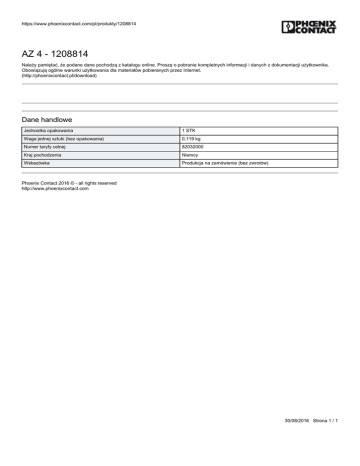 https://www.phoenixcontact.com/pl/produkty/1208814 AZ 4 - 1208814 Należy pamiętać, że podane dane pochodzą z katalogu online. Proszę o pobranie kompletnych informacji i danych z dokumentacji użytkownika. Obowiązują ogólne warunki użytkowania dla materiałów pobieranych przez Internet. (http://phoenixcontact.pl/download) Dane handlowe Jednostka opakowania 1 STK Waga jednej sztuki (bez opakowania) 0,119 kg Numer taryfy celnej 82032000 Kraj pochodzenia Niemcy Wskazówka Produkcja na zamówienie (bez zwrotów) Phoenix Contact 2016 © - all rights reserved http://www.phoenixcontact.com 30/08/2016 Strona 1 / 1
