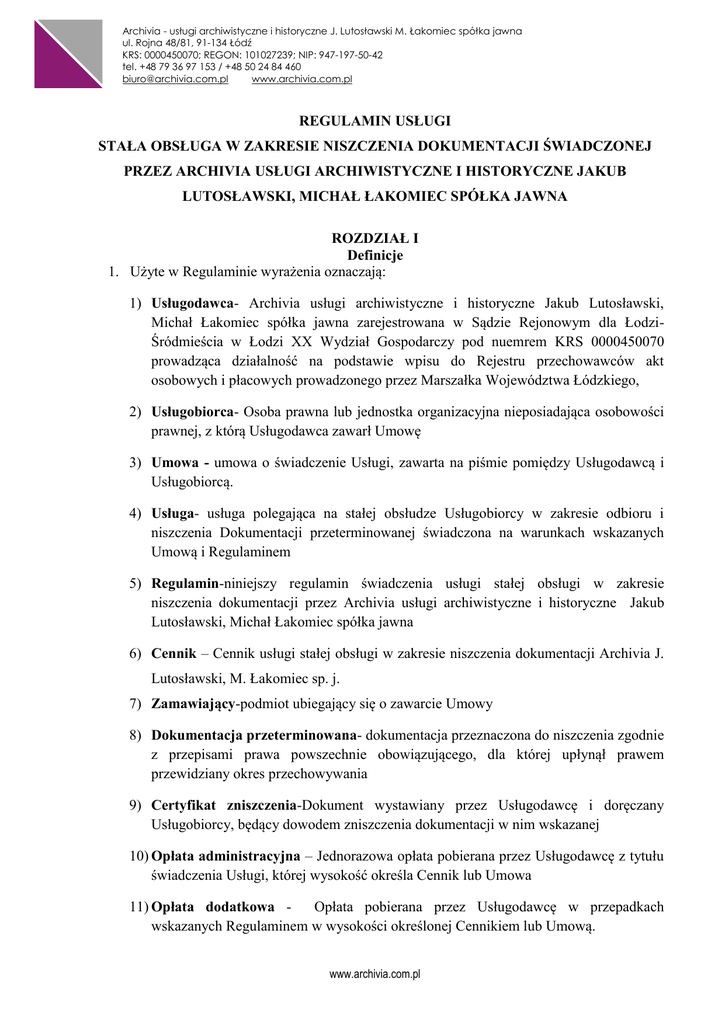 Archivia - usługi archiwistyczne i historyczne J. Lutosławski M. Łakomiec spółka jawna ul. Rojna 48/81, 91-134 Łódź KRS: 0000450070; REGON: 101027239; NIP: 947-197-50-42 tel. +48 79 36 97 153 / +48 50 24 84 460 [email protected] www.archivia.com.pl REGULAMIN USŁUGI STAŁA OBSŁUGA W ZAKRESIE NISZCZENIA DOKUMENTACJI ŚWIADCZONEJ PRZEZ ARCHIVIA USŁUGI ARCHIWISTYCZNE I HISTORYCZNE JAKUB LUTOSŁAWSKI, MICHAŁ ŁAKOMIEC SPÓŁKA JAWNA ROZDZIAŁ I Definicje 1. Użyte w Regulaminie wyrażenia oznaczają: 1) Usługodawca- Archivia usługi archiwistyczne i historyczne Jakub Lutosławski, Michał Łakomiec spółka jawna zarejestrowana w Sądzie Rejonowym dla ŁodziŚródmieścia w Łodzi XX Wydział Gospodarczy pod nuemrem KRS 0000450070 prowadząca działalność na podstawie wpisu do Rejestru przechowawców akt osobowych i płacowych prowadzonego przez Marszałka Województwa Łódzkiego, 2) Usługobiorca- Osoba prawna lub jednostka organizacyjna nieposiadająca osobowości prawnej, z którą Usługodawca zawarł Umowę 3) Umowa - umowa o świadczenie Usługi, zawarta na piśmie pomiędzy Usługodawcą i Usługobiorcą. 4) Usługa- usługa polegająca na stałej obsłudze Usługobiorcy w zakresie odbioru i niszczenia Dokumentacji przeterminowanej świadczona na warunkach wskazanych Umową i Regulaminem 5) Regulamin-niniejszy regulamin świadczenia usługi stałej obsługi w zakresie niszczenia dokumentacji przez Archivia usługi archiwistyczne i historyczne Jakub Lutosławski, Michał Łakomiec spółka jawna 6) Cennik – Cennik usługi stałej obsługi w zakresie niszczenia dokumentacji Archivia J. Lutosławski, M. Łakomiec sp. j. 7) Zamawiający-podmiot ubiegający się o zawarcie Umowy 8) Dokumentacja przeterminowana- dokumentacja przeznaczona do niszczenia zgodnie z przepisami prawa powszechnie obowiązującego, dla której upłynął prawem przewidziany okres przechowywania 9) Certyfikat zniszczenia-Dokument wystawiany przez Usługodawcę i doręczany Usługobiorcy, będący dowodem zniszczenia dokumentacji w nim wskazanej 10) Opłata administracyjna – Jednorazowa opłata pobierana przez Usługodawcę z tytułu świadczenia Usługi, której wysokość określa Cennik lub Umowa 11) Opłata dodatkowa Opłata pobierana przez Usługodawcę w przepadkach wskazanych Regulaminem w wysokości określonej Cennikiem lub Umową. www.archivia.com.pl Archivia - usługi archiwistyczne i historyczne J. Lutosławski M. Łakomiec spółka jawna ul. Rojna 48/81, 91-134 Łódź KRS: 0000450070; REGON: 101027239; NIP: 947-197-50-42 tel. +48 79 36 97 153 / +48 50 24 84 460 [email protected] www.archivia.com.pl 12) Opłata wyrównawcza-kwota pieniężna należna Usługodawcy od Usługobiorcy w przypadku jednostronnego rozwiązania Umowy przez Usługobiorcę bądź Usługodawcę z przyczyn leżących po stronie Usługobiorcy, przed zakończeniem okresu na jaki została ona zawarta ROZDZIAŁ II Zawarcie Umowy 2. Przez zawarcie Umowy Usługodawca zobowiązuje się do świadczenia Usługi na rzecz Usługobiorcy zgodnie z Umową i Regulaminem, a Usługobiorca zobowiązuje się do terminowego uiszczania opłat za wykonaną Usługę i przestrzegania postanowień Regulaminu i Umowy. 3. Umowa zawierana jest w formie pisemnej, pod rygorem nieważności. Do zmiany Umowy wymagana jest forma pisemna pod rygorem nieważności. 4. Umowa powinna określać co najmniej 1) Oznaczenie Usługodawcy i Usługobiorcy 2) Okres na jaki zostaje zawarta Umowa 3) Rodzaj kontenera na Dokumentację przeterminowaną, o którym mowa w ust. 11 Regulaminu 4) Maksymalna częstotliwość odbioru Dokumentacji przeterminowanej przez Usługodawcę 5) Rodzaj surowca, z którego wytworzona jest Dokumentacja której niszczenie jest przedmiotem Usługi przeterminowana, 6) Wynagrodzenie Usługodawcy, bądź sposób jego obliczania lub też wskazanie dokumentu, w którym określone jest wynagrodzenie Usługobiorcy/sposób jego ustalania 7) Oznaczenie przedstawiciela Usługodawcy umocowanego do odbioru Usługobiorcy Dokumentacji przeterminowanej w ramach świadczenia Usługi od 8) Oznaczenie osoby wyznaczonej przez Usługobiorcę do kontaktów z Usługodawcą w zakresie realizacji Usługi 5. Nie wymaga zmiany Umowy zmiana osób wskazanych w ust. 4 pkt. 7 i 8 . Regulaminu. 6. Przed zawarciem Umowy Zamawiający winien dostarczyć Usługodawcy dokument potwierdzający status prawny Zamawiającego. 7. W przypadku gdy Zamawiającego reprezentuje osoba, której umocowanie do reprezentacji oraz jego zakres nie wynika z dokumentu o którym mowa ust. 6 Zamawiający powinien www.archivia.com.pl Archivia - usługi archiwistyczne i historyczne J. Lutosławski M. Łakomiec spółka jawna ul. Rojna 48/81, 91-134 Łódź KRS: 0000450070; REGON: 101027239; NIP: 947-197-50-42 tel. +48 79 36 97 153 / +48 50 24 84 460 [email protected] www.archivia.com.pl dostarczyć również dokument określający zakres umocowania do reprezentacji osoby występującej w jego imieniu. 8. Usługodawca może uzależnić zawarcie Umowy od przedłożenia przez Zamawiającego innych dokumentów w szczególności tych świadczących o sytuacji finansowej Zamawiającego. Usługodawca może w szczególności w przypadku negatywnej oceny wiarygodności płatniczej Zamawiającego uzależnić zawarcie Umowy od złożenia przez Zamawiającego kaucji w wysokości określonej przez Usługodawcę Kaucja taka nie stanowi przedpłaty ani zaliczki na poczet należności Usługobiorcy z tytułu Umowy. Usługodawca ma prawo potrącić swoją wymagalną wierzytelność z tytułu Umowy z kwoty kaucji. 9. Usługodawca deponuje środki pieniężne pobrane od Zamawiającego tytułem kaucji na odrębnym nieoprocentowanym rachunku bankowym a po zakończeniu trwania Umowy zwraca Usługobiorcy kwotę kaucji pozostałą po dokonywaniu potrąceń, o których mowa w ust.8. ROZDZIAŁ III Świadczenie Usługi 10. Na podstawie Umowy Usługodawca zobowiązuje się do dostarczenia Usługobiorcy kontenera o wymia