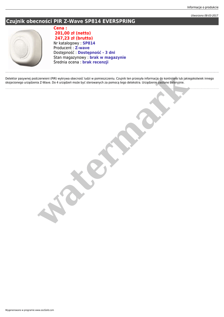 Informacje o produkcie Utworzono 08-03-2017 Czujnik obecności PIR Z-Wave SP814 EVERSPRING Cena : 201,00 zł (netto) 247,23 zł (brutto) Nr katalogowy : SP814 Producent : Z-wave Dostępność : Dostępność - 3 dni Stan magazynowy : brak w magazynie Średnia ocena : brak recenzji w at er m ar k Detektor pasywnej podczerwieni (PIR) wykrywa obecność ludzi w pomieszczeniu. Czujnik ten przesyła informację do kontrolera lub jakiegokolwiek innego skojarzonego urządzenia Z-Wave. Do 4 urządzeń może być sterowanych za pomocą tego detekotra. Urządzenie zasilane bateryjnie. Wygenerowano w programie www.oscGold.com