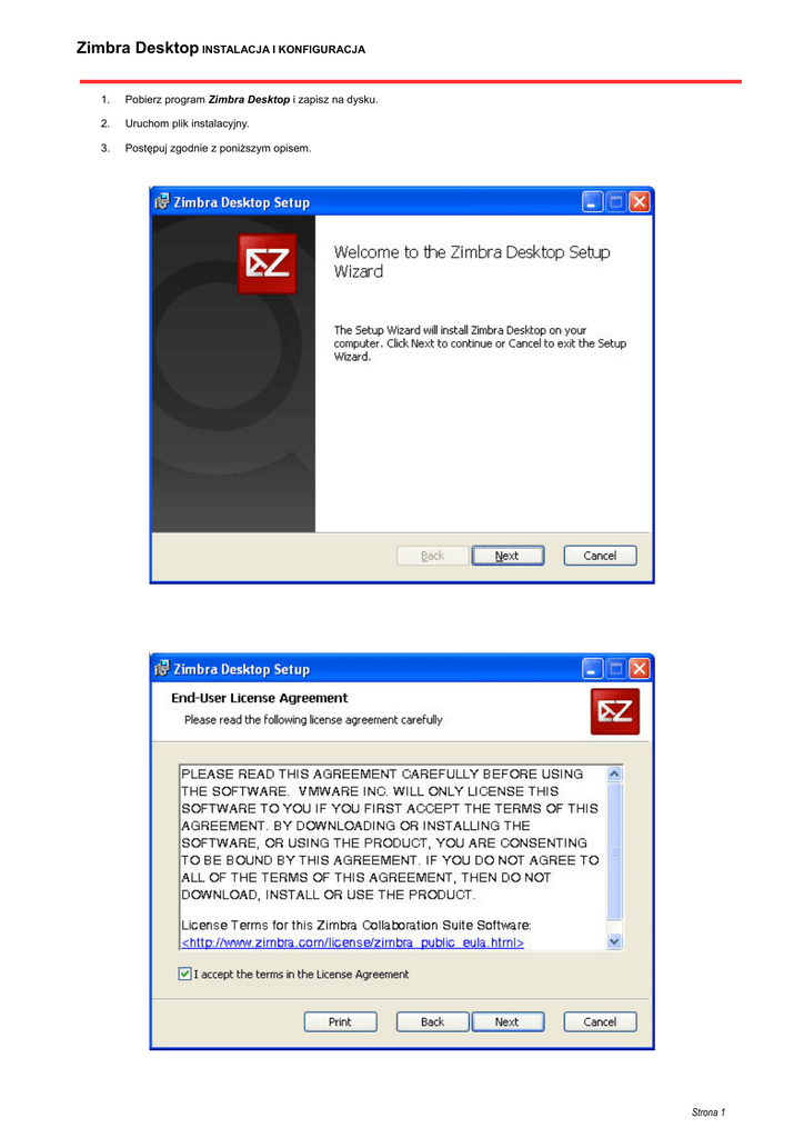 Zimbra Desktop INSTALACJA I KONFIGURACJA 1. Pobierz program Zimbra Desktop i zapisz na dysku. 2. Uruchom plik instalacyjny. 3. Postępuj zgodnie z poniższym opisem. Strona 1 Strona 2 Strona 3 4. Uruchom program (menu Start/Wszystkie programy/Zimbra desktop) i skonfiguruj według poniższego przykładu. 5. Kliknij sprawdź poprawność połączenia (zielony przycisk). 6. Jeżeli połączenie jest poprawne, zaakceptuj wprowadzone dane. 7. Program uruchomi się automatycznie. Jeżeli proces uruchamiania trwa długo, wyłącz programy blokujące typu firewall, po czym ponownie uruchom program Zimbra Desktop. Strona 4