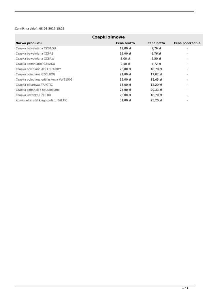 Cennik na dzień: 08-03-2017 15:26 Czapki zimowe Nazwa produktu Cena brutto Cena netto Cena poprzednia Czapka bawełniana CZBADU 12,00 zł 9,76 zł - Czapka bawełniana CZBAS 12,00 zł 9,76 zł - Czapka bawełniana CZBAW 8,00 zł 6,50 zł - Czapka kominiarka CZKAKO 9,50 zł 7,72 zł - Czapka ocieplana ADLER FURRY 23,00 zł 18,70 zł - Czapka ocieplana CZOLUXG 21,00 zł 17,07 zł - Czapka ocieplana odblaskowa VW21502 19,00 zł 15,45 zł - Czapka polarowa PRACTIC 15,00 zł 12,20 zł - Czapka softshell z nausznikami 25,00 zł 20,33 zł - Czapka uszanka CZOLUX 23,00 zł 18,70 zł - Kominiarka z lekkiego polaru BALTIC 31,00 zł 25,20 zł - 1/1 Powered by TCPDF (www.tcpdf.org)