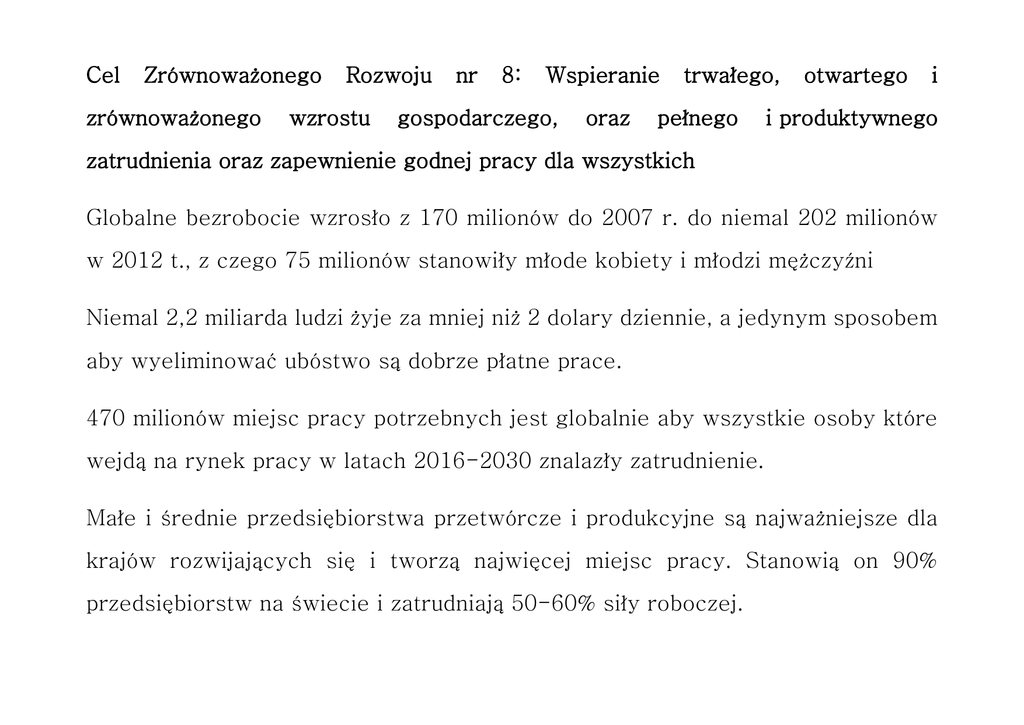 Cel Zrównoważonego zrównoważonego Rozwoju wzrostu nr 8: Wspieranie gospodarczego, oraz trwałego, pełnego otwartego i i produktywnego zatrudnienia oraz zapewnienie godnej pracy dla wszystkich Globalne bezrobocie wzrosło z 170 milionów do 2007 r. do niemal 202 milionów w 2012 t., z czego 75 milionów stanowiły młode kobiety i młodzi mężczyźni Niemal 2,2 miliarda ludzi żyje za mniej niż 2 dolary dziennie, a jedynym sposobem aby wyeliminować ubóstwo są dobrze płatne prace. 470 milionów miejsc pracy potrzebnych jest globalnie aby wszystkie osoby które wejdą na rynek pracy w latach 2016-2030 znalazły zatrudnienie. Małe i średnie przedsiębiorstwa przetwórcze i produkcyjne są najważniejsze dla krajów rozwijających się i tworzą najwięcej miejsc pracy. Stanowią on 90% przedsiębiorstw na świecie i zatrudniają 50-60% siły roboczej.