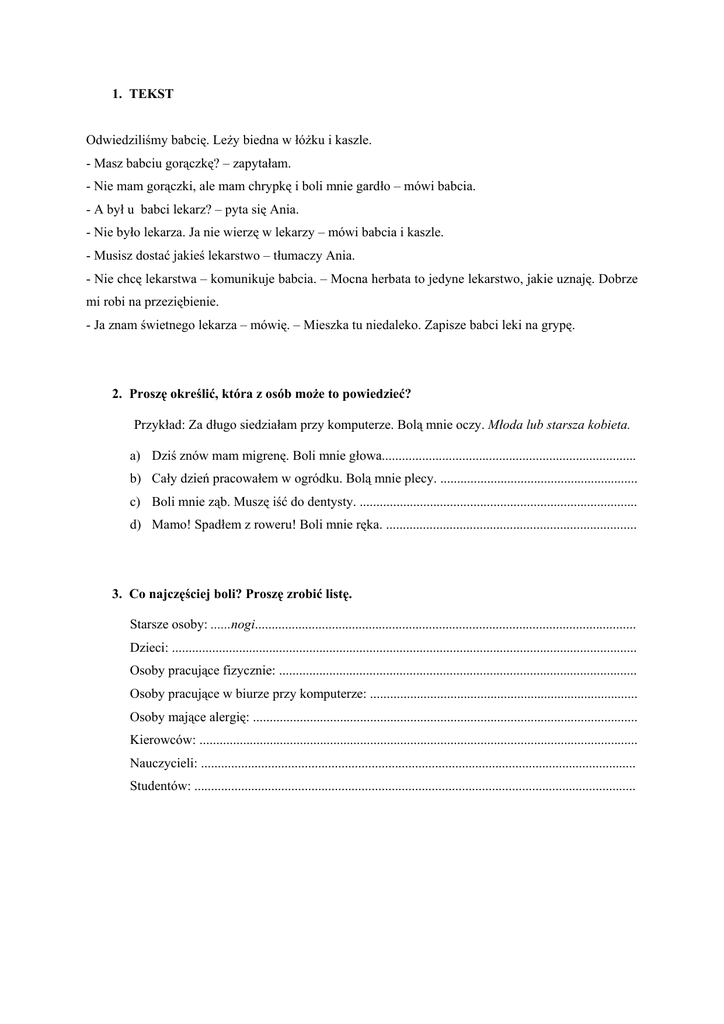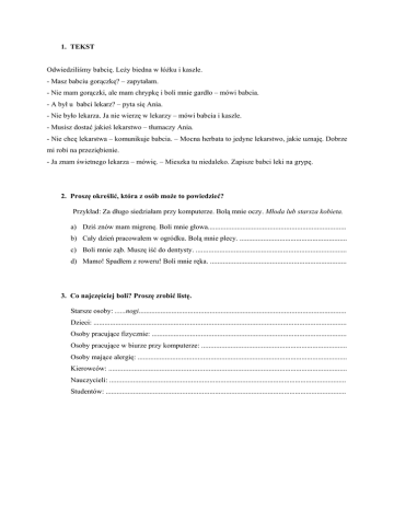 1. TEKST Odwiedziliśmy babcię. LeŜy biedna w łóŜku i kaszle. - Masz babciu gorączkę? – zapytałam. - Nie mam gorączki, ale mam chrypkę i boli mnie gardło – mówi babcia. - A był u babci lekarz? – pyta się Ania. - Nie było lekarza. Ja nie wierzę w lekarzy – mówi babcia i kaszle. - Musisz dostać jakieś lekarstwo – tłumaczy Ania. - Nie chcę lekarstwa – komunikuje babcia. – Mocna herbata to jedyne lekarstwo, jakie uznaję. Dobrze mi robi na przeziębienie. - Ja znam świetnego lekarza – mówię. – Mieszka tu niedaleko. Zapisze babci leki na grypę. 2. Proszę określić, która z osób moŜe to powiedzieć? Przykład: Za długo siedziałam przy komputerze. Bolą mnie oczy. Młoda lub starsza kobieta. a) Dziś znów mam migrenę. Boli mnie głowa............................................................................ b) Cały dzień pracowałem w ogródku. Bolą mnie plecy. ........................................................... c) Boli mnie ząb. Muszę iść do dentysty. ................................................................................... d) Mamo! Spadłem z roweru! Boli mnie ręka. ........................................................................... 3. Co najczęściej boli? Proszę zrobić listę. Starsze osoby: ......nogi.................................................................................................................. Dzieci: ........................................................................................................................................... Osoby pracujące fizycznie: ........................................................................................................... Osoby pracujące w biurze przy komputerze: ................................................................................ Osoby mające alergię: ................................................................................................................... Kierowców: ................................................................................................................................... Nauczycieli: .................................................................................................................................. Studentów: .................................................................................................................................... 4. U lekarza. Dialog. - Co pani dolega? - Jestem przeziębiona (y), mam katar i kaszel. Boli mnie gardło. - Ma pan/pani gorączkę? - Mam podniesioną temperaturę. Nie mam wysokiej gorączki. - Zapiszę pani/panu leki. Te tabletki proszę brać trzy razy dziennie po jednej, syrop trzy razy dziennie po łyŜce, gardło płukać rano i wieczorem. Na pewno to pani/panu pomoŜe na przezięcienie. 5. Uzupełnij luki. Wizyta u lekarza gorączkę katar Co panu dolega? rozebrać czuję łóŜku kaszel recepty apteka PACJENT: Dzień dobry, panie doktorze. LEKARZ: Dzień dobry. .............................................................................................. P: Nie wiem, ale źle się ................................................................................................ L: Czy ma pan .............................................................................................................? P: Tak, 38,5. I mam teŜ .................................................i ............................................. L: Jak długo? P: 3 dni. L: Proszę się ..................................................... Zbadam pana. (po chwili) L: Tak, to grypa. Proszę leŜeć w ........................................ tydzień, pić mleko z miodem i gorącą herbatę. Proszę, tu są ........................................ na lekarstwa. ................................... jest niedaleko na tej ulicy. P: Dziękuję. Czy w najbliŜszym czasie muszę się zgłosić do kontroli? L: Nie, nie trzeba. Nie jest to konieczne. P: Dziękuję. Do widzenia. 6. Zadanie domowe Proszę przygotować dialog w parach. Hipochondryk u lekarza.