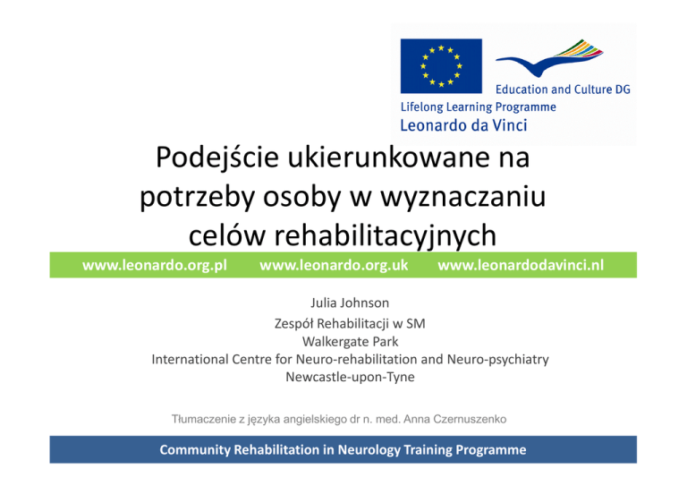 Podejście ukierunkowane na potrzeby osoby w wyznaczaniu celów rehabilitacyjnych www.leonardo.org.pl www.leonardo.org.uk www.leonardodavinci.nl Julia Johnson Zespół Rehabilitacji w SM Walkergate Park International Centre for Neuro-rehabilitation and Neuro-psychiatry Newcastle-upon-Tyne Tłumaczenie z języka angielskiego dr n. med. Anna Czernuszenko Community Rehabilitation in Neurology Training Programme Prezentowane materiały edukacyjne powstały w ramach projektu realizowanego z funduszy europejskich w ramach programu Leonardo da Vinci pt. Rehabilitacja Środowiskowa w Neurologii – Program Edukacyjny w latach 2008-2010 • W chorobach przewlekłych termin opieka ukierunkowana na osobę jest używany, w celu „promocji wsparcia społecznego, (wykorzystania) wpływów środowiska i rodziny oraz wykorzystania w praktyce zasad leżących u podłoża zmian behawioralnych” (Bauman i wsp. 2003) • Inne przykłady: Mead i Bower 2000 – Pacjent jako osoba – zrozumienie osobistego, personalnego znaczenia choroby – Dzielenie władzy i odpowiedzialności – Koncepcja aliansu terapeutycznego • Praktyka ukierunkowana na osobę została wprowadzona w Wielkiej Brytanii w odpowiedzi na potrzebę pacjentów, by być dopuszczonym do głosu w kwestii własnego leczenia i decydowania o kształcie usług. Rehabilitacja Środowiskowa w Neurologii – Program Edukacyjny www.leonardo.org.pl www.leonardo.org.uk www.leonardodavinci.nl Definicja opieki ukierunkowanej na osobę (Person Centred Care) • • • • Edukacja i dzielenie się wiedzą Zaangażowanie rodziny i przyjaciół Współpraca i zarządzanie zespołem Wrażliwość na nie-medyczny i duchowy wymiar opieki • Poszanowanie potrzeb i preferencji pacjenta • Wolny przepływ i dostępność informacji (Shaller 2007) Rehabilitacja Środowiskowa w Neurologii – Program Edukacyjny www.leonardo.org.pl www.leonardo.org.uk www.leonardodavinci.nl Główne zasady Opieki Ukierunkowanej na Osobę • Współczucie, empatia i wrażliwość na potrzeby, wartości i preferencje (pacjenta) • Koordynacja i integracja opieki • Informacja, komunikacja i edukacja • Zapewnienie komfortu fizycznego • Wsparcie emocjonalne, redukowanie lęków i obaw • Zaangażowanie rodziny i przyjaciół (Institute of Medicine 2001) Rehabilitacja Środowiskowa w Neurologii – Program Edukacyjny www.leonardo.org.pl www.leonardo.org.uk www.leonardodavinci.nl Wymiary Opieki Ukierunkowanej na Osobę • • • • Większa satysfakcja pacjenta Większe zaangażowanie w leczenie/stosownie się Lepsze wyniki zdrowotne Bardziej racjonalne wykorzystanie zasobów (Stewart 2001) • Wielka Brytania – słabe wskaźniki zaangażowania pacjentów włączając te, które związane są z planowaniem terapii i celów. (Coulter 2006) CommunityŚrodowiskowa Rehabilitation w in Neurologii Neurology –Training Programme Rehabilitacja Program Edukacyjny www.leonardo.org.pl www.leonardo.org.uk www.leonardodavinci.nl Zalety podejścia ukierunkowanego na osobę • Cele życiowe i aspiracje – Jednakże – Mogą istnieć czynniki społeczne, które wpływają na znaczenie wyznaczania celów dla poszczególnych osób Kielhofner (1997) • Cele rehabilitacyjne – Wybór i znaczenie • Aktywność celowa – Prawdziwe przedmioty i sytuacje funkcjonalne • Pamiętaj o tym, by na każdym poziomie przy wszystkich celach być ukierunkowanym na osobę CommunityŚrodowiskowa Rehabilitation w in Neurologii Neurology –Training Programme Rehabilitacja Program Edukacyjny www.leonardo.org.pl www.leonardo.org.uk www.leonardodavinci.nl Czym jest wyznaczanie celów? • Projekt badawczy dotyczący wyznaczania celów fizjoterapii dla klientów z niesprawnością kończyny górnej po udarze • Odpowiedź na to pytanie jest krótka: TAK – Terapeuci i pacjenci w grupie badanej Therapists and patients in all study oceniali, że wyznaczanie celów ma duże znaczenie – Dowody z literatury • Jednak: – Nie zawsze • “W żadnym przypadku nie wyznaczam celów dla siebie, nigdy tego nie robiłem. Znam moje ograniczenia i nie jestem najmądrzejszy na świecie.” – SMART czy nie smart? • “Ja chcę po prostu być…” Rehabilitacja CommunityŚrodowiskowa Rehabilitation w in Neurologii Neurology –Training Program Programme Edukacyjny www.leonardo.org.pl www.leonardo.org.uk www.leonardodavinci.nl Czy wyznaczanie celów ma znaczenie? • Problem zaangażowania pacjenta i szerszego zespołu – “My stawiamy cele; terapeuta zajęciowy i ja wyznaczymy cele dla tego pacjenta” – Brak własności • Being Process Driven – “So tend to have to channelled towards, maybe sort of, sort of you know the things we, that are achievable within a couple of weeks.” • Rozbieżność pomiędzy celami pacjenta a dziłaniami podejmowanymi w ramach fizjoterapii Rehabilitacja CommunityŚrodowiskowa Rehabilitation w in Neurologii Neurology –Training Program Programme Edukacyjny www.leonardo.org.pl www.leonardo.org.uk www.leonardodavinci.nl Jakie są potencjalne konsekwencje sytuacji, kiedy cele nie są ukierunkowane na osobę? • Goal Attainment Scaling (GAS) – (skala oceny realizacji celu) – Skomplikowana • Therapy Outcome Measure (Skala oceny efektów terapii) – Proste i nie-medyczne w modelu • SMART – Wprowadzona w zarządzaniu kadrami • Canadian (COPM) Occupational Performance Measure – Stosowane wyżej wspomnianych badaniach naukowych Communityw Rehabilitation in Neurologii Neurology –Training Programme Rehabilitacja Środowiskowa w Program Edukacyjny www.leonardo.org.pl www.leonardo.org.uk www.leonardodavinci.nl Jakie narzędzia mogłyby być użyte to wyznaczania celów ukierunkowanych na osobę? (Skala oceny efektów terapii) Pam Enderby, Alexandra John and Brian Petheram • • • • • • • • Istotna, walidowana, wiarygodna Oparta na ICF 11 punktowa skala (ordinal scale), 6 zdefiniowanych punktów Międzydyscyplinarna Opisuje Describe umiejętnoś