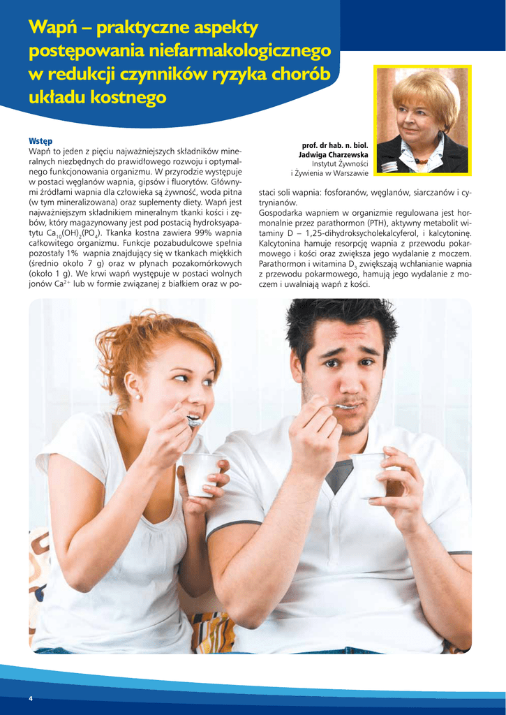 Wapń – praktyczne dla zdrowia aspekty Żywność postępowania niefarmakologicznego w redukcji czynników ryzyka chorób układu kostnego Wstęp Wapń to jeden z pięciu najważniejszych składników mineralnych niezbędnych do prawidłowego rozwoju i optymalnego funkcjonowania organizmu. W przyrodzie występuje w postaci węglanów wapnia, gipsów i fluorytów. Głównymi źródłami wapnia dla człowieka są żywność, woda pitna (w tym mineralizowana) oraz suplementy diety. Wapń jest najważniejszym składnikiem mineralnym tkanki kości i zębów, który magazynowany jest pod postacią hydroksyapatytu Ca10(OH)2(PO4). Tkanka kostna zawiera 99% wapnia całkowitego organizmu. Funkcje pozabudulcowe spełnia pozostały 1% wapnia znajdujący się w tkankach miękkich (średnio około 7 g) oraz w płynach pozakomórkowych (około 1 g). We krwi wapń występuje w postaci wolnych jonów Ca2+ lub w formie związanej z białkiem oraz w po- 4 prof. dr hab. n. biol. Jadwiga Charzewska Instytut Żywności i Żywienia w Warszawie staci soli wapnia: fosforanów, węglanów, siarczanów i cytrynianów. Gospodarka wapniem w organizmie regulowana jest hormonalnie przez parathormon (PTH), aktywny metabolit witaminy D – 1,25-dihydroksycholekalcyferol, i kalcytoninę. Kalcytonina hamuje resorpcję wapnia z przewodu pokarmowego i kości oraz zwiększa jego wydalanie z moczem. Parathormon i witamina D3 zwiększają wchłanianie wapnia z przewodu pokarmowego, hamują jego wydalanie z moczem i uwalniają wapń z kości. Tabela 1. Zapotrzebowanie na wapń (mg/osobę/dobę) dla ludności Polski z uwzględnieniem wieku i płci, na poziomie normy AI (Normy żywienia człowieka, pod red. M. Jarosza i B. Bułhak-Jachymczyk, PZWL, Warszawa 2008) Grupa: płeć, wiek (lata) Wapń (mg) Niemowlęta 0–0,5 0,5–1 400 300 Dzieci 1–3 4–6 7–9 500 700 800 Dziewczęta i chłopcy 10–18 1300 Kobiety i mężczyźni 19–50 51–65 66>75 1000 1300 1300 Kobiety w ciąży lub karmiące <19 ≥19 1300 1000 Wapń, oprócz podstawowego znaczenia dla tkanki kostnej, bierze udział w wielu procesach metabolicznych, takich jak: przewodnictwo nerwowe, kurczliwość mięśni, krzepnięcie krwi, jest składnikiem hormonów i niektórych enzymów. Ma również znaczenie w regulacji ciśnienia tętniczego krwi. Zapotrzebowanie organizmu na wapń W określeniu zapotrzebowania na wapń brane są pod uwagę takie czynniki, jak: zawartość w diecie, stan zdrowia lub stan fizjologiczny oraz wyniki badań bilansowych. Na tej podstawie ustalono, że przyswajalność wapnia najwyższa jest u niemowląt karmionych mlekiem matki i wynosi 61%. U osób starszych spożywających obok mleka także inne produkty zmniejsza się do około 50%. U dzieci w okresie intensywnych procesów wzrastania spożycie wapnia powinno pokrywać zapotrzebowanie organizmu związane z budową i rozwojem szkieletu. Dzienny przyrost wapnia w kościach wynosi: od 60 do 200 mg/dzień u dzieci między 1. a 8. rokiem życia, 282 mg/ dzień u chłopców w wieku 9,5–19,5 roku oraz 212 mg/dzień u dziewcząt w przedziale wiekowym 9,5–19,5 roku. Retencja tego pierwiastka wzrasta w wieku okołopokwitaniowym, osiągając najwyższe wartości około 13. r.ż. u dziewcząt i 14,5 r.ż. u chłopców. Uznano, że w przedziale wiekowym 19–30 lat, kiedy osiągana jest szczytowa masa kostna, spożycie wapnia powinno zapewniać uzyskanie jego retencji w organizmie wynoszącej 10 mg/dzień u kobiet i 50 mg/dzień u mężczyzn. Następnie procesy tworzenia i resorpcji wchodzą w stan rów- 5 Żywność dla zdrowia nowagi trwający do około 40.–50. roku życia. W miarę starzenia się organizmu procesy resorpcji kości zaczynają przeważać nad procesami tworzenia. Jest to spowodowane między innymi obniżeniem poziomu hormonów płciowych, zmniejszoną zdolnością wchłaniania substancji odżywczych (w tym wapnia), zmniejszeniem poziomu aktywności fizycznej oraz chorobami wieku starczego i związanymi z tym ograniczeniami diety, z których najpowszechniejsza jest rzekoma lub faktyczna nietolerancja laktozy. Normy dotyczące wapnia uwzględniają nie tylko wszystkie powyżej wymienione czynniki, lecz również wiele innych, wpływających na wielkość zapotrzebowania. W roku 2008 normy zostały ustalone na poziomie wystarczającego spożycia (adequate intake, Al; tabela 1). Spożycie wapnia w populacji polskiej W Polsce spożycie wapnia w diecie jest niezadowalające i nie spełnia wymogów normy w żadnej grupie demograficznej. Wszystkie badania epidemiologiczne prowadzone w naszym kraju w ostatnich latach pokazują, że dieta Polaków nie pokrywa zapotrzebowania na wapń. Tak małe jego spożycie (średnio między 600 a 700 mg/dzień przez osoby dorosłe) zagraża rozwojem chronicznych schorzeń. Szczególnie niepokojące jest niewystarczające spożycie wapnia przez młodzież w wieku okołopokwitaniowym, w okresie największych przyrostów masy kostnej. Średnio wynosi ono 850 mg/dzień u chłopców oraz 690 mg/dzień u dziewcząt. Tabela 2. Zawartość wapnia (mg) w 100 g wybranych produktów mlecznych Nazwa produktu Mleko 3,2% tłuszczu 118 Mleko UHT 1,5% tłuszczu z witaminami 120 Śmietana 12% tłuszczu 106 Jogurt naturalny 2% tłuszczu 170 Jogurt owocowy 2% tłuszczu 225 Kefir 246 Napój mleczny jogurtowy 158 Sery żółte 6 Wapń (mg) 386-1380 Ser twarogowy półtłusty 94 Ser feta 500 Ser termizowany pieczarkowy 80 Ser homogenizowany półtłusty 98 Tabela 3. Ilość produktów innych niż mleko potrzebna do pokrycia zawartości wapnia w jednej szklance mleka (300 mg wapnia) Nazwa produktu Ilość produktu (g) Jogurt naturalny 2% tłuszczu 176 Jogurt owocowy 2% tłuszczu 225 Soja nasiona 125 Fasola nasiona 184 Kapusta biała 448 Brokuły 625 Sałata zielona ze śmietaną 857 Orzechy włoskie 345 Kasza gryczana gotowana na sypko 3333 Kopytka 3000 Ziemniaki purée 2500 Płatki śniadaniowe wzbogacane 3750 Sok grejpfrutowy z witaminami 244 Sok pomidorowy 3750 So