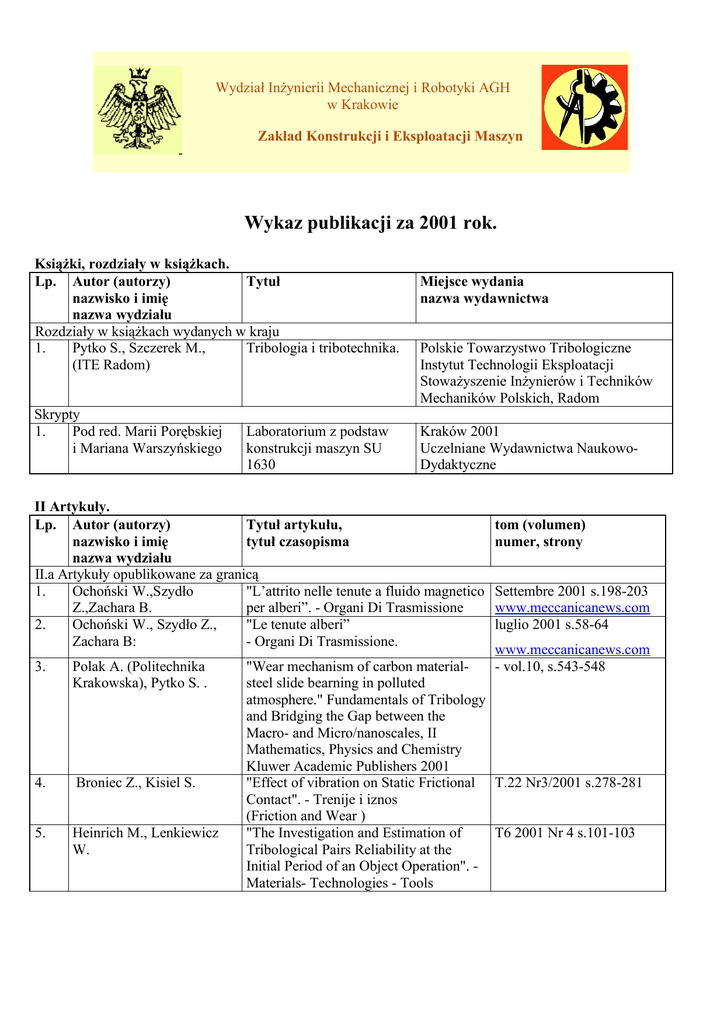 Wydział Inżynierii Mechanicznej i Robotyki AGH w Krakowie Zakład Konstrukcji i Eksploatacji Maszyn Wykaz publikacji za 2001 rok. Książki, rozdziały w książkach. Lp. Autor (autorzy) Tytuł nazwisko i imię nazwa wydziału Rozdziały w książkach wydanych w kraju 1. Pytko S., Szczerek M., Tribologia i tribotechnika. (ITE Radom) Skrypty 1. Pod red. Marii Porębskiej i Mariana Warszyńskiego Laboratorium z podstaw konstrukcji maszyn SU 1630 Miejsce wydania nazwa wydawnictwa Polskie Towarzystwo Tribologiczne Instytut Technologii Eksploatacji Stoważyszenie Inżynierów i Techników Mechaników Polskich, Radom Kraków 2001 Uczelniane Wydawnictwa NaukowoDydaktyczne II Artykuły. Lp. Autor (autorzy) Tytuł artykułu, nazwisko i imię tytuł czasopisma nazwa wydziału II.a Artykuły opublikowane za granicą 1. Ochoński W.,Szydło "L’attrito nelle tenute a fluido magnetico Z.,Zachara B. per alberi”. - Organi Di Trasmissione 2. Ochoński W., Szydło Z., "Le tenute alberi” Zachara B: - Organi Di Trasmissione. 3. Polak A. (Politechnika Krakowska), Pytko S. . 4. Broniec Z., Kisiel S. 5. Heinrich M., Lenkiewicz W. tom (volumen) numer, strony Settembre 2001 s.198-203 www.meccanicanews.com luglio 2001 s.58-64 www.meccanicanews.com - vol.10, s.543-548 "Wear mechanism of carbon materialsteel slide bearning in polluted atmosphere." Fundamentals of Tribology and Bridging the Gap between the Macro- and Micro/nanoscales, II Mathematics, Physics and Chemistry Kluwer Academic Publishers 2001 "Effect of vibration on Static Frictional T.22 Nr3/2001 s.278-281 Contact". - Trenije i iznos (Friction and Wear ) "The Investigation and Estimation of T6 2001 Nr 4 s.101-103 Tribological Pairs Reliability at the Initial Period of an Object Operation". Materials- Technologies - Tools 6. Heinrich M., Lenkiewicz W. 7. Pytko S., Piekoszewski W. Oddano do druku w 2001 roku "Erhohung und Ausswertung des Zuverlassigkeitsiniveaus von tribologischen Pearungen im Zeitram der Anfangsnutzung eines Einzelnen Objekts." Tribologie und Schmierungstechnik "Влияние физикотерми-ческих T.4/2001 s.85-92 процессов при точении стали на образо-вание покрытий из метал-лов, имеющихся в смазочноохлаждающих жидкостях". Вестник верхневолжского отделения академии технологических наук Российской Федерации. Rybińsk 2001 II.b Artykuły opublikowane w kraju 1. Bednarek K., Szydło Z. „Metoda badania olejów do układów smarowania mgłą olejową”. Paliwa, olej i smary w eksploatacji. 2. Szydło Z. Bargieła P.:(Huta „Smarowanie mgłą olejową łożysk Bankowa) tocznych z pionowym usytuowaniem osi”, - Zeszyty Naukowe Politechniki Opolskiej, Seria: Mechanika 3. Kisiel Stanisław, Broniec "Identyfikacja naprężeń w tulei Zdzisław połączenia wciskowego w badaniach eksperymentalnych." Zesz. Nauk. Politechniki Opolskiej, Mechanika 4. Sujecki K.Krauze K. "Konstrukcja wózka hamulcowego do transportu szynowego w nachylonych wyrobiskach górniczych" Zeszyty Naukowe Politechniki Opolskiej Mechanika 5. Sujecki K., Krauze K. Koza "Wózek hamulcowy do zabezpieczania H.(KWK "Bogdanka" w przed samostaczaniem się naczyń Bogdance) transportowych w wyrobiskach nachylonych." Bezpieczeństwo pracy i Ochrony Środowiska w Górnictwie Miesięcznik Wyższego Urzędu Górniczego. 6. Maziarz M. Blum A. "Method of increasing the welded box girders operational lifetime by compensation for fatigue processes".Archives of Civil Enginaering 7. Porębska M. "Uszkodzenia systemów przesyłowych energetyki cieplnej." -Ciepłownictwo, Ogrzewnictwo,Wentylacja Wyd.Sigma NOT 8. Porębska M. "Niekonwencjonalne uszczelnienie czołowe ruchu obrotowego." Mechanika 9. Rupeta W. "Metoda pomiarów odkształceń zazębienia przekładni walcowej z rolkami". Zeszyty Naukowe Politechniki Opolskiej. Mechanika. 10. Boda A. "Prognozowanie niezawodności i trwałości przekładni zębatej ze względu na zużycie zmęczeniowe zębów." Problemy Eksploatacji nr 82, luty 2001.s.36-39 z.70, nr kol.272/2001 str.249-256 z.69 nr kol.271 s.27-34 z.69 nr kol.271/2001 s.9198 Nr:7-8 (83-84)/2001 s.19-23 vol.XLVII, 3, 2001, s.323367 nr.5 (374), 2001 s.18-22 Tom 20., Zeszyt 1, 2001 s.75-79 z.70 nr kol.272/2001 s.61-66 nr 4/2001 s.45-54 11. Rudnicki Z., Blum A. 12. Dudek R. 13. 14. 15. 16. 17. 18. 19. 20. 21. 22. 23. 24. "Komputeryzacja a problemy Nr 3-4/2001 s.77-80 normalizacji w projektowaniu stalowych ustrojów nośnych suwnic pomostowych." - Problemy Projektowe Przemysłu i Budownictwa "Charakterystyka statyczna rozdzielacza proporcjonalnego Herion HDSV 2". Zesz.. Nauk.. Politechniki Opolskiej, Mechanika Dudek R "Wpływ zmiany współczynnika zmienności wartości średniej obciążenia na trwałość skręcanego elementu badania symulacyjne." Zesz. Nauk. Politechniki Opolskiej. Mechanika. Czachórska E. "Analiza uszkodzeń pary ślizgowej uszczelnienia czołowego w aspekcie jego niezawodności." Zagadnienia Eksploatacji Maszyn. Czachórska E. "Metodyka badań wpływu drgań wymuszonych na niezawodność uszczelnień czołowych" . - Hydraulika i Pneumatyka. Kisiel S.,Broniec Z. "Modelowanie niezawodności połączeń śrubowych." Zagadnienia Eksploatacji Maszyn. Marianowski J., "Kinematyka nowej krajowej Władzielczyk K., Jasica G. samojezdnej wiertnicy dla górnictwa skalnego." Mechanika. Furmanik K., Oleksiak Z. "Analiza wymiarowa w modelowaniu tarcia i zużycia." -Problemy Eksploatacji Czachórska E. "Badania uszczelnień czołowych w warunkach drgań wymuszonych."Zeszyty Naukowe Politechniki Opolskiej, Mechanika Daca J., Warszyński M. "Wpływ niektórych własności fizykochemicznych cieczy chłodząco-smarujących na zużycie typu scuffing oczek ciągadeł." Zeszyty Naukowe Politechniki Opolskiej - Mechanika Heinrich M., Lenkiewicz W "Problematyka oceny niezawodności węzłów tribologic