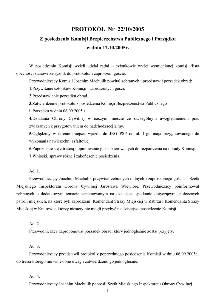 PROTOKÓŁ Nr 22/10/2005 Z posiedzenia Komisji Bezpieczeństwa Publicznego i Porządku w dniu 12.10.2005r. W posiedzeniu Komisji wzięli udział radni – członkowie wyżej wymienionej komisji /lista obecności stanowi załącznik do protokołu/ i zaproszeni goście. Przewodniczący Komisji Joachim Machulik powitał zebranych i przedstawił porządek obrad: 1.Przywitanie członków Komisji i zaproszonych gości. 2.Przedstawienie porządku obrad. 3.Zatwierdzenie protokołu z posiedzenia Komisji Bezpieczeństwa Publicznego i Porządku w dniu 06.09.2005.r. 4.Działania Obrony Cywilnej w naszym mieście ze szczególnym uwzględnieniem prac związanych z przygotowaniem do nadchodzącej zimy. 5.Oględziny w terenie miejsca wjazdu do JRG PSP od ul. 1-go maja przygotowanego do wykonania nawierzchni asfaltowej. 6.Zapoznanie się z treścią i opiniowanie pism skierowanych do rozpatrzenia na obrady Komisji. 7.Wnioski, sprawy różne i zakończenie posiedzenia. Ad. 1. Przewodniczący Joachim Machulik przywitał zebranych radnych i zaproszonego gościa – Szefa Miejskiego Inspektoratu Obrony Cywilnej Jarosława Wiewiórę. Przewodniczący poinformował zebranych o dodatkowym temacie zaplanowanym na dzisiejsze spotkanie dotyczącym społecznych patroli miejskich, na które byli zaproszeni: Komendant Straży Miejskiej w Zabrzu i Komendanta Straży Miejskiej w Knurowie, którzy niestety nie mogli przybyć na dzisiejsze posiedzenie Komisji. Ad. 2. Przewodniczący zaproponował porządek obrad, który jednogłośnie został przyjęty. Ad. 3. Przewodniczący przedstawił protokół z poprzedniego posiedzenia Komisji w dniu 06.09.2005r., do treści którego nie wniesiono uwag i zatwierdzono go jednogłośnie. Ad. 4. Przewodniczący Joachim Machulik poprosił Szefa Miejskiego Inspektoratu Obrony Cywilnej 1 p. Jarosława Wiewiórę o przedstawienie zakresu działania swojej jednostki. Pan Wiewióra poinformował zebranych, że corocznie planowane są działania obrony cywilnej w mieście i gminie. Między innymi planowane jest uczestnictwo w imprezach, które przygotowują do udzielania pomocy. Jednostka przygotowuje miasto do zimy, czyli do działań, które na wypadek zimy przeciętnej i łagodnej działają normalnie, a w wypadku zimy srogiej są podejmowane dodatkowe zadania. Radny Grzegorz Nocoń zapytał szefa MIOC w Knurowie, czy są schrony w mieście? Otrzymał odpowiedź, że typowych schronów w Knurowie i w zasadzie w innych miastach w Polsce nie ma. Obecna nazwa miejsc spełniających rolę schronów to „ukrycia”, te „ukrycia” w Knurowie są przygotowane do przyjęcia w razie potrzeby 173 osób. Jest ich 6 i znajdują się na ul. Koziełka. Zadano również pytanie czy w zakładach są szefowie obrony cywilnej. Szefami są dyrektorzy i kierownicy danej placówki? Pan Wiewióra odpowiedział, że jest przygotowany również do sytuacji nadzwyczajnych w razie szczególnie uciążliwej zimy. Koordynuje wtedy działania różnych służb antykryzysowych. Komisja otrzymała informację, że firma „KOMART” wygrała przetarg na odśnieżanie miasta w okresie zimy. Ad.5. Część II posiedzenia Komisji miała miejsce na terenie JRG PSP w Knurowie przy ulicy 1-go Maja. Dowódca jednostki Krzysztof Sierantowicz zapoznał członków Komisji z najbliższymi planami inwestycyjnymi. Ma zostać wykonany wjazd – droga (nakładka asfaltowa) do jednostki od ulicy 1-goMaja. Zostanie również zagospodarowany teren przed wejściem do JRG. Komendant Miejski PSP w Gliwicach skierował prośbę do prezydenta Miasta o wsparcie wykonania drogi wjazdowej kwotą 23,5 tyś złotych. Komisja została poinformowana o podjętych rozmowach pomiędzy Komendantem Miejskim PSP w Gliwicach, a Starostwem Powiatowym dotyczące remontu odcinka chodnika od wjazdu do JRG w kierunku ronda na ul. 1-go Maja. Kolega Jerzy Pach stwierdził, że jest on za dotacja na wykonanie wjazdu, ale należy także pamiętać o policji, która potrzebuje środki na zmianę siedziby. Ad.6. W dalszej części obrad komisja przystąpiła do zapoznania się z treścią pism skierowanych do rozpatrzenia: *dot. sprawozdania z działalności Straży Miejskiej za I półrocze 2005 roku – Komisja zapoznała się z treścią, *dot. treści pisma od zastępcy Prezydenta Kazimierza Kachla wyjaśniająca działania w szkołach na terenie Knurowa związane z zagrożeniem narkotykami. 2 *dot. zaproszenia na Turniej Piłki Nożnej Pięcioosobowej w dniu 15.10.2005 r. o Puchar Prezydenta Miasta, który odbędzie się w Hali Sportowej MOSiR przy ul. Sztygarskiej. Ad.7. Komisja wypracowała następujące wnioski: 1) Komisja wnioskuje o oczyszczenie miasta po kampanii wyborczej do Sejmu, Senatu i na Prezydenta RP. (słupy ogłoszeniowe, przystanki). 2) Rozpoznać i pouczyć osoby, firmy rozklejające ogłoszenia na drzewach o zachowaniu zasad ochrony środowiska i umieszczaniu ogłoszeń w miejscach do tego przeznaczonych. 3) Komisja wnioskuje o przekazanie kwoty 23,5 tyś zł przez Gminę Knurów na wykonanie nawierzchni asfaltowej, drogi wjazdowej do JRG od ulicy 1-go Maja. 4) Komisja kieruje wniosek do Starostwa Powiatowego o remont chodnika na ul. 1-go Maja od wjazdu do JRG w kierunku ronda, który pokryje się terminowo z budową ronda. Wnioski przyjęto jednogłośnie. Przewodniczący podziękował zebranym, na tym zakończono posiedzenie Komisji. Protokołowała Przewodniczył Brygida Pomarańska Joachim Machulik 3