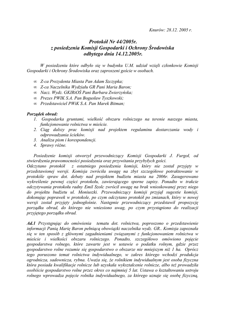 Knurów: 28.12. 2005 r. Protokół Nr 44/2005r. z posiedzenia Komisji Gospodarki i Ochrony Środowiska odbytego dnia 14.12.2005r. W posiedzeniu które odbyło się w budynku U.M. udział wzięli członkowie Komisji Gospodarki i Ochrony Środowiska oraz zaproszeni goście w osobach. • • • • • Z-ca Prezydenta Miasta Pan Adam Szczypka; Z-ca Naczelnika Wydziału GR Pani Maria Baron; Nacz. Wydz. GKIRiOŚ Pani Barbara Zwierzyńska; Prezes PWIK S.A. Pan Bogusław Tyszkowski; Przedstawiciel PWiK S.A. Pan Marek Bitman; Porządek obrad: 1. Gospodarka gruntami, wielkość obszaru rolniczego na terenie naszego miasta, funkcjonowanie rolnictwa w mieście. 2. Ciąg dalszy prac komisji nad projektem regulaminu dostarczania wody i odprowadzania ścieków. 3. Analiza pism i korespondencji. 4. Sprawy różne. Posiedzenie komisji otworzył przewodniczący Komisji Gospodarki J. Furgoł, od stwierdzenia prawomocności posiedzenia oraz przywitania przybyłych gości. Odczytano protokół z ostatniego posiedzenia komisji, który nie został przyjęty w przedstawionej wersji. Komisja zwróciła uwagę na zbyt szczegółowe potraktowanie w protokóle spraw dot. debaty nad projektem budżetu miasta na 2006r. Zasugerowano wykreślenie pewnej części protokołu, zawierającego sporne zapisy. Ponadto w trakcie odczytywania protokołu radny Emil Szolc zwrócił uwagę na brak wnioskowanej przez niego do projektu budżetu ul. Moniuszki. Przewodniczący komisji przyjął sugestie komisji, dokonując poprawek w protokole, po czym odczytano protokół po zmianach, który w nowej wersji został przyjęty jednogłośnie. Następnie przewodniczący przedstawił propozycję porządku obrad, do którego nie wniesiono uwag, po czym przystąpiono do realizacji przyjętego porządku obrad. Ad.1 Przystępując do omówienia tematu dot. rolnictwa, poproszono o przedstawienie informacji Panią Marię Baron pełniącą obowiązki naczelnika wydz. GR.. Komisja zapoznała się w ten sposób z głównymi zagadnieniami związanymi z funkcjonowaniem rolnictwa w mieście i wielkości obszaru rolniczego. Ponadto, szczegółowo omówiono pojęcie gospodarstwa rolnego, które zawarte jest w ustawie o podatku rolnym, gdzie przez gospodarstwo rolne rozumie się gospodarstwo o obszarze nie mniejszym niż 1 ha. Oprócz tego poruszono temat rolnictwa indywidualnego, w zakres którego wchodzi produkcja ogrodnicza, sadownicza, rybna. Uważa się, że rolnikiem indywidualnym jest osoba fizyczna która posiada kwalifikacje rolnicze lub uzyskała wykształcenie rolnicze, albo też prowadziła osobiście gospodarstwo rolne przez okres co najmniej 5 lat. Ustawa o kształtowaniu ustroju rolnego wprowadza pojęcie rolnika indywidualnego, za którego uznaje się osobę fizyczną, będącą właścicielem lub dzierżawcą nieruchomości o łącznej powierzchni użytków rolnych nie przekraczających 300 ha, prowadzącą gospodarstwo rolne, posiadającą kwalifikacje rolnicze, zamieszkałą w gminie na obszarze której położona jest jedna z nieruchomości rolnych wchodzących w skład tego gospodarstwa. Wyjaśniono również, że w Knurowie, zgodnie z przedstawionymi informacjami mamy zarejestrowane dwa koła łowieckie – „Cyranka” i „Szarak”, jedno koło hodowców drobnego inwentarza i rejonowe koło pszczelarzy. Po tym krótkim wprowadzeniu, radni podjęli dyskusję w trakcie, której zadawali pytania w kwestiach, które ich zdaniem należało dokładniej wyjaśnić. Jako pierwszy pytanie zadał Jan Trzęsiok, pytanie dotyczyło ilości nieużytków na terenie Knurowa. Pani Naczelnik oświadczyła, że obecnie brak informacji na ten temat. Równocześnie poinformowała, że przewidziana jest rekultywacja terenów zdegradowanych po kopalniach, będą udzielane dopłaty do gruntów oraz wydawane drzewka do zalesiania. Ilość gospodarstw rolnych których właściciele są płatnikami podatku rolnego wynosi 97, w tym mieszkańców Knurowa jest 77, natomiast zorganizowanych gospodarstw rolnych prowadzących działalność rolniczą jest 10. Struktura użytków rolnych jest następująca: użytki rolne ogółem 750 ha, grunty orne 611 ha, sady 4 ha, łąki 99 ha, pastwiska 42 ha, lasy i grunty leśne 1255 ha, pozostałe grunty 1384 ha. Omówiono również sprawę utrzymania i konserwacji rowów odwadniających tereny w naszym mieście. Z uwagi na wcześniejszą pracę Komisji Gospodarki w tym zakresie, przewodniczący komisji zapytał prezydenta Adama Szczypkę i Panią Marię Baron o stan tej sytuacji na dzień dzisiejszy. Wyjaśniono, że w celu reaktywowania spółki wodnej została rozesłana ankieta do 97 właścicieli gruntów przez które przebiegają rowy odwadniające, 9 osób opowiedziało się za potrzebą funkcjonowania spółki wodnej natomiast 40 osób było przeciwnych, pozostałe osoby nie odpowiedziały. W wyniku takiego stanowiska osób którym powinno zależeć na rozwiązaniu tak ważnego tematu, jak bieżąca dbałość o stan rowów odwadniających, Gmina Knurów nie podjęła innych działań, ani też nie deklaruje się rozwiązać tego problemu samodzielnie z uwagi na brak możliwości prawnych do samodzielnego finansowania działalności spółki wodnej, która będzie wykonywała zadania na gruntach również innych niż gminne. Komisja nie wniosła sugestii do sposobu rozwiązania istniejącego problemu, uznając, że jedynie istnienie czynnej spółki wodnej jest w stanie rozwiązać problem utrzymania rowów. Nadal kwestią otwartą jest istnienie w zawieszeniu spółki wodnej na terenie Knurowa, co zdaniem komisji należy prawnie uporządkować. Ad.2 W tym punkcie obrad komisja przystąpiła do dalszych prac nad regulaminem dostarczania wody i odprowadzania ścieków. Przewodniczący komisji stwierdził, że dostarczono radnym wnioskowane na ostatnim posiedzeniu materiały. Ponadto przewodniczący przypomniał o zobowiązaniu członków komisji do prac nad regulaminem i otrzymanymi materiałami, co miało mi
